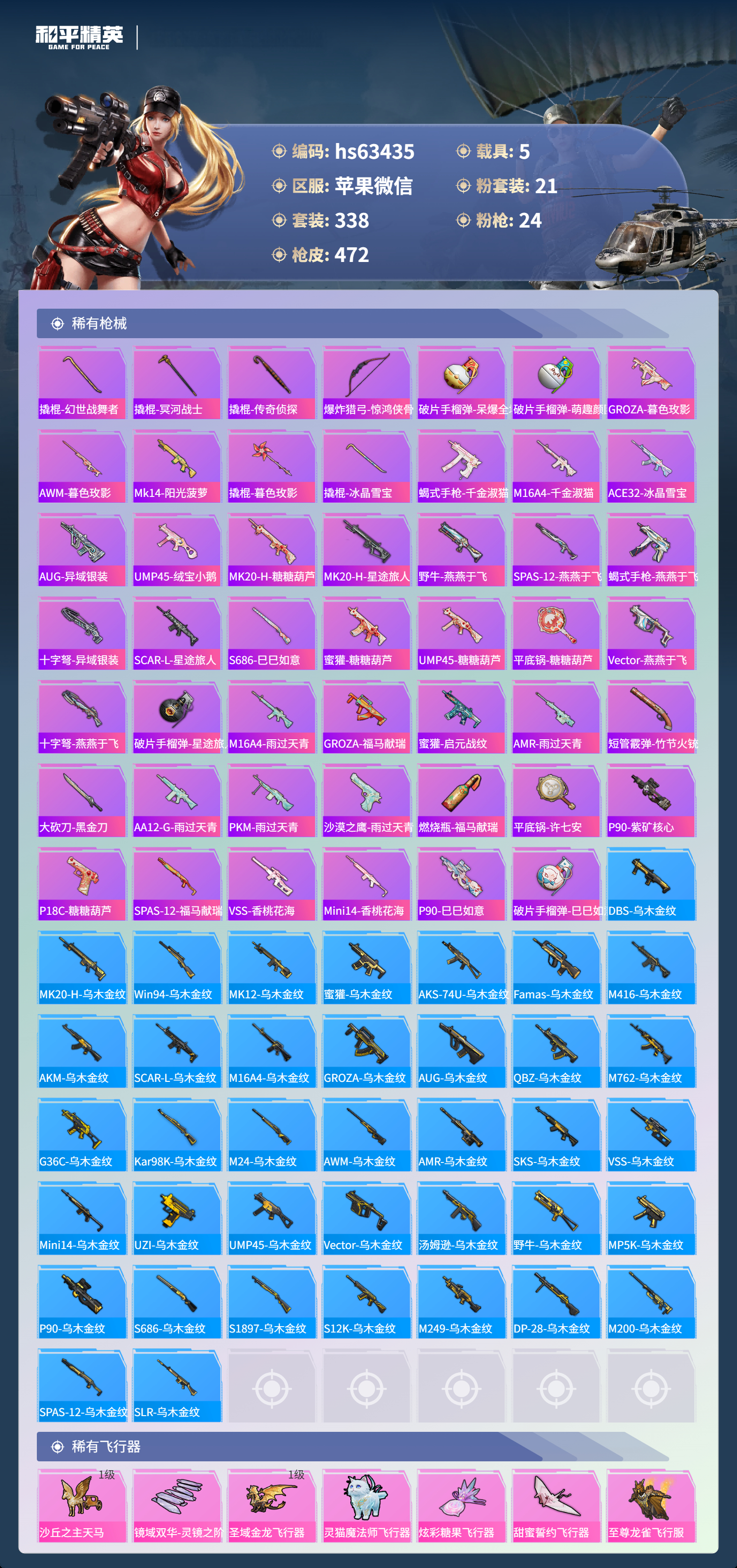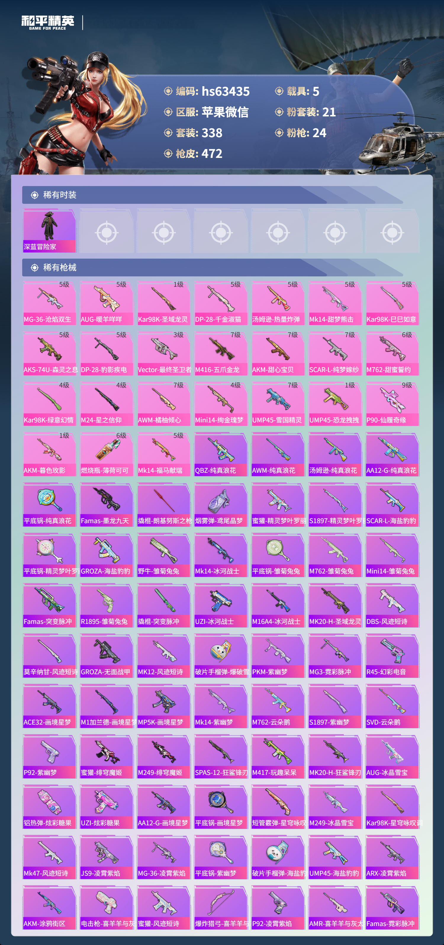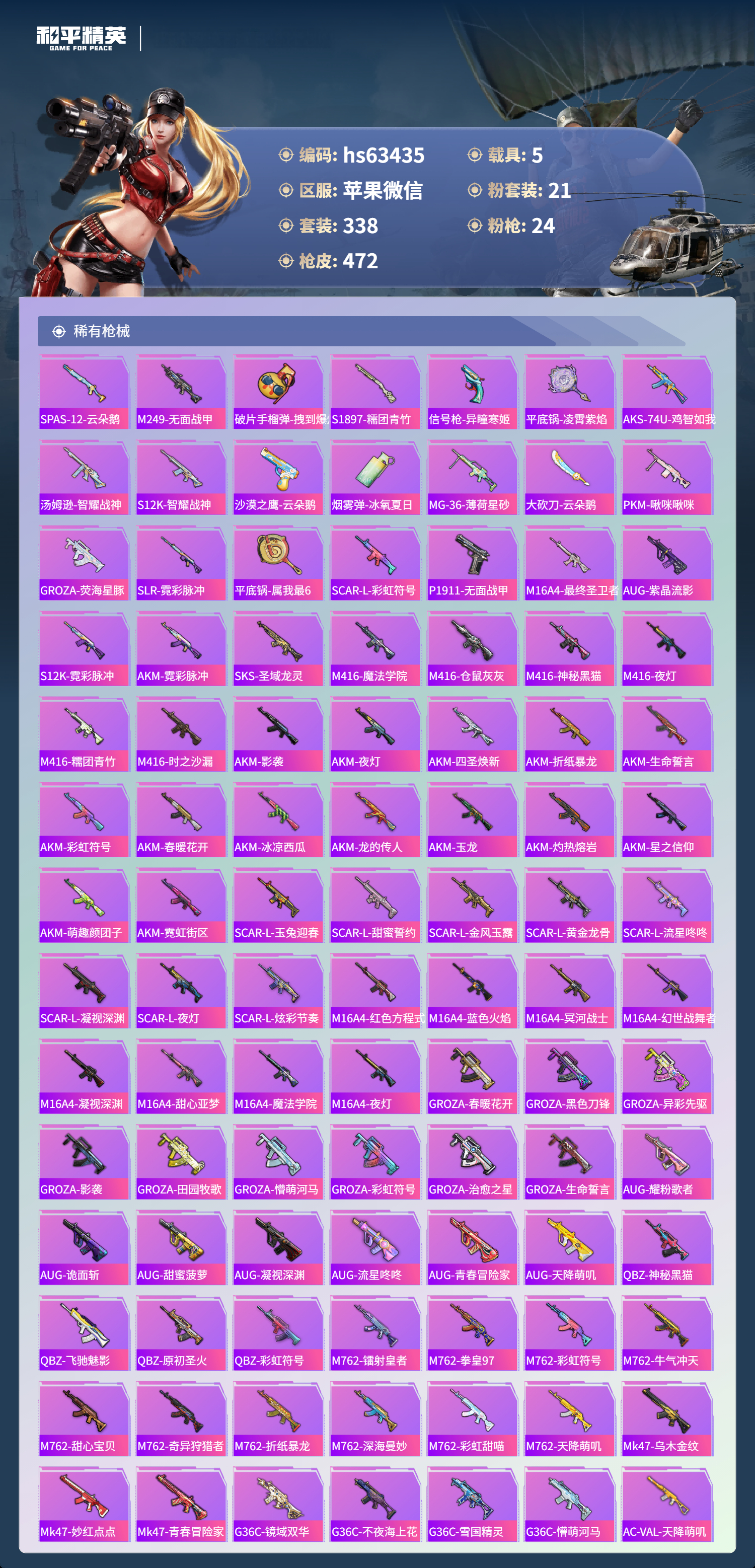 hs63435 苹果微信-29王牌印记-1红装-21粉装-24特效枪-5载具-热力值-338套装-472枪皮-3卓越印记