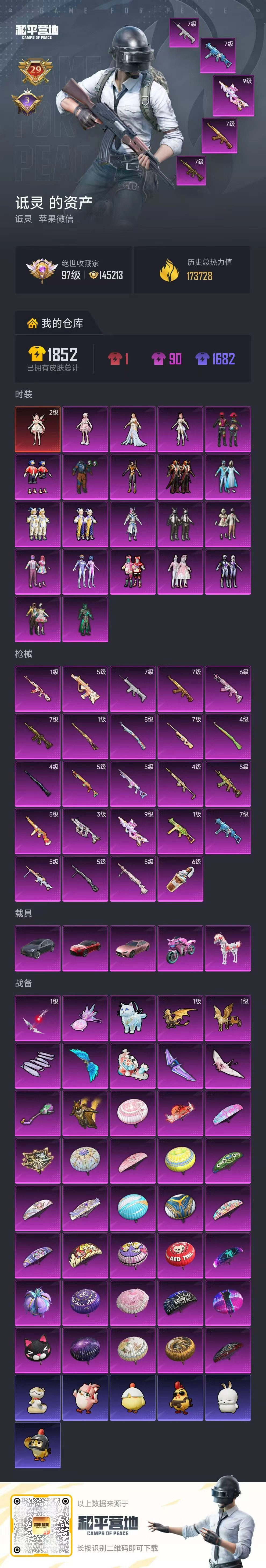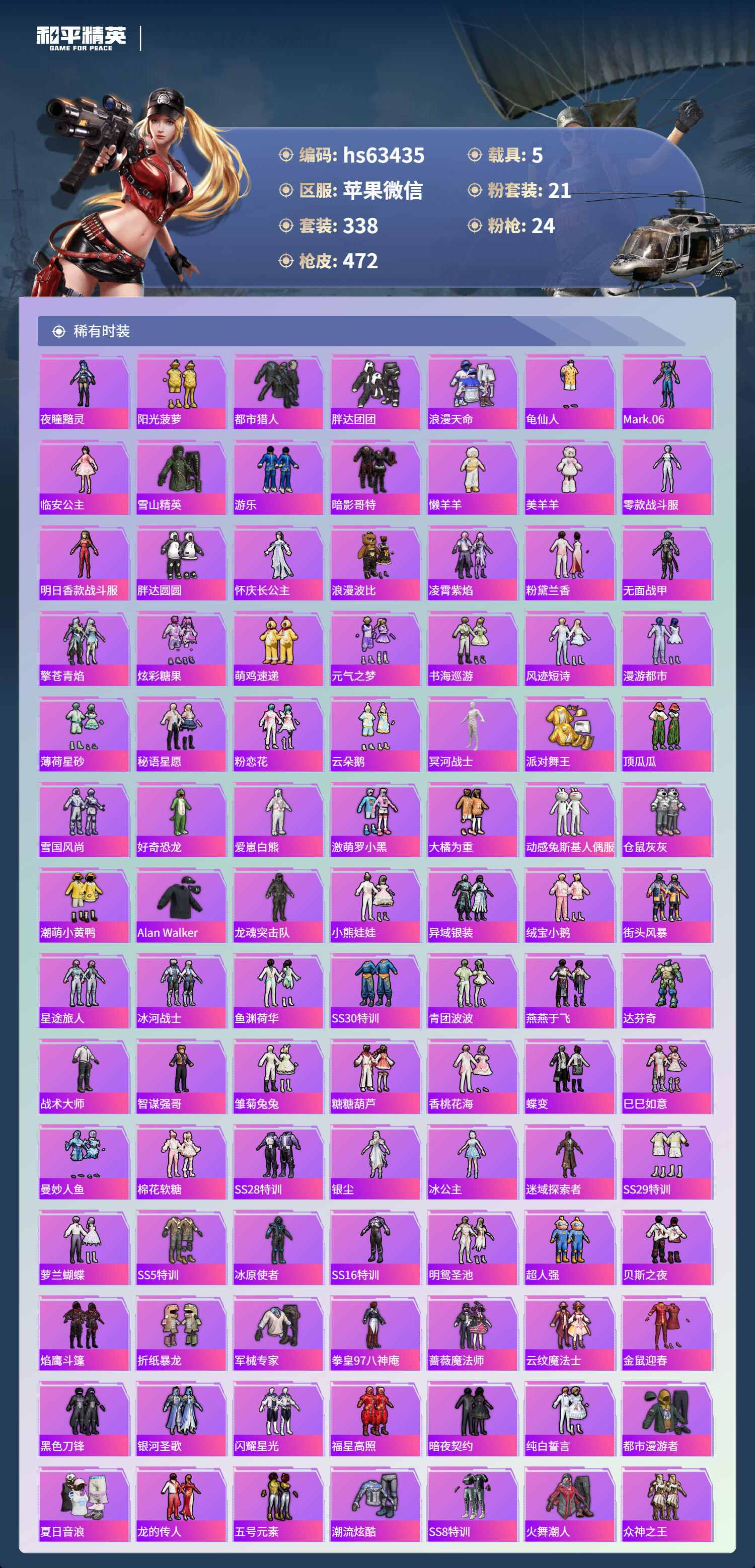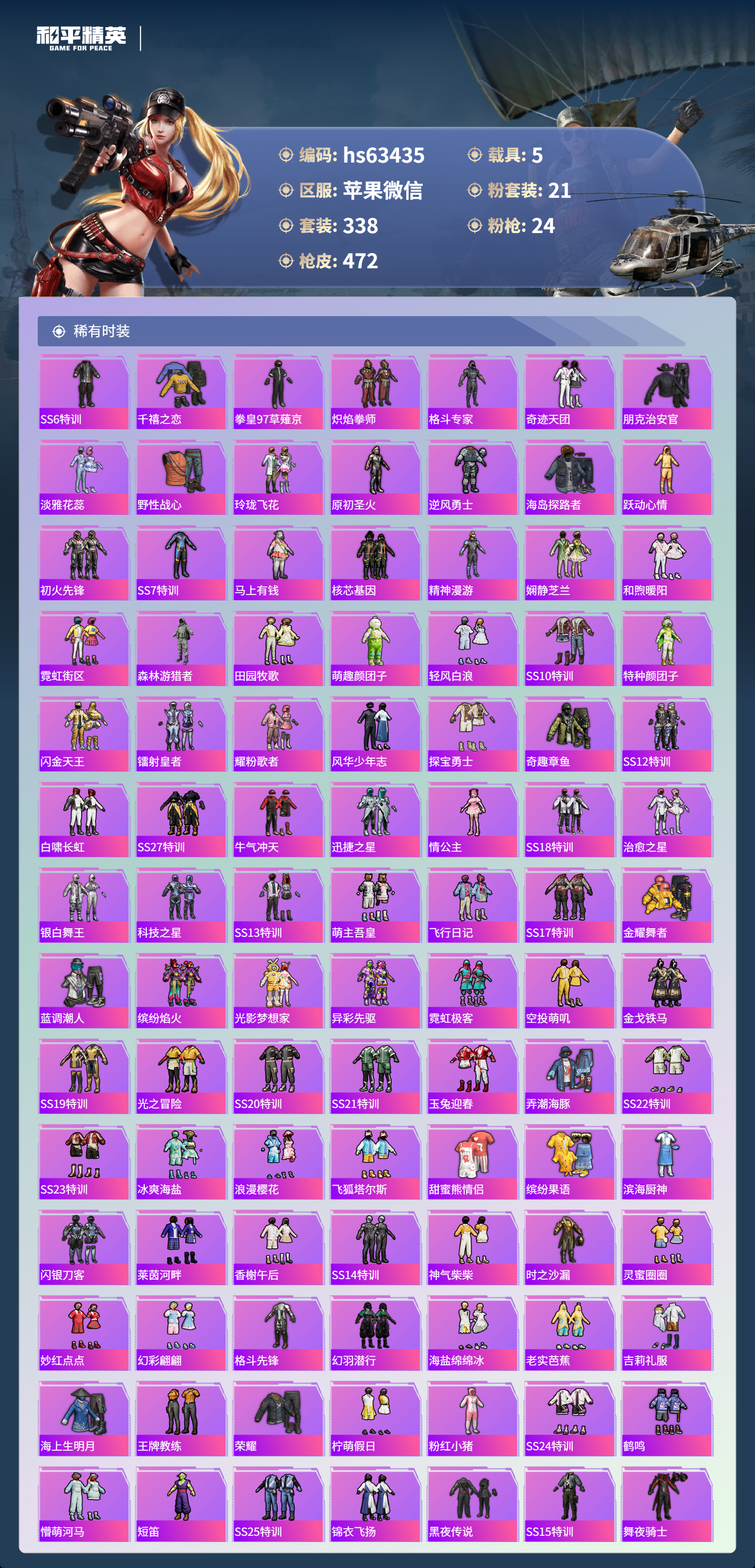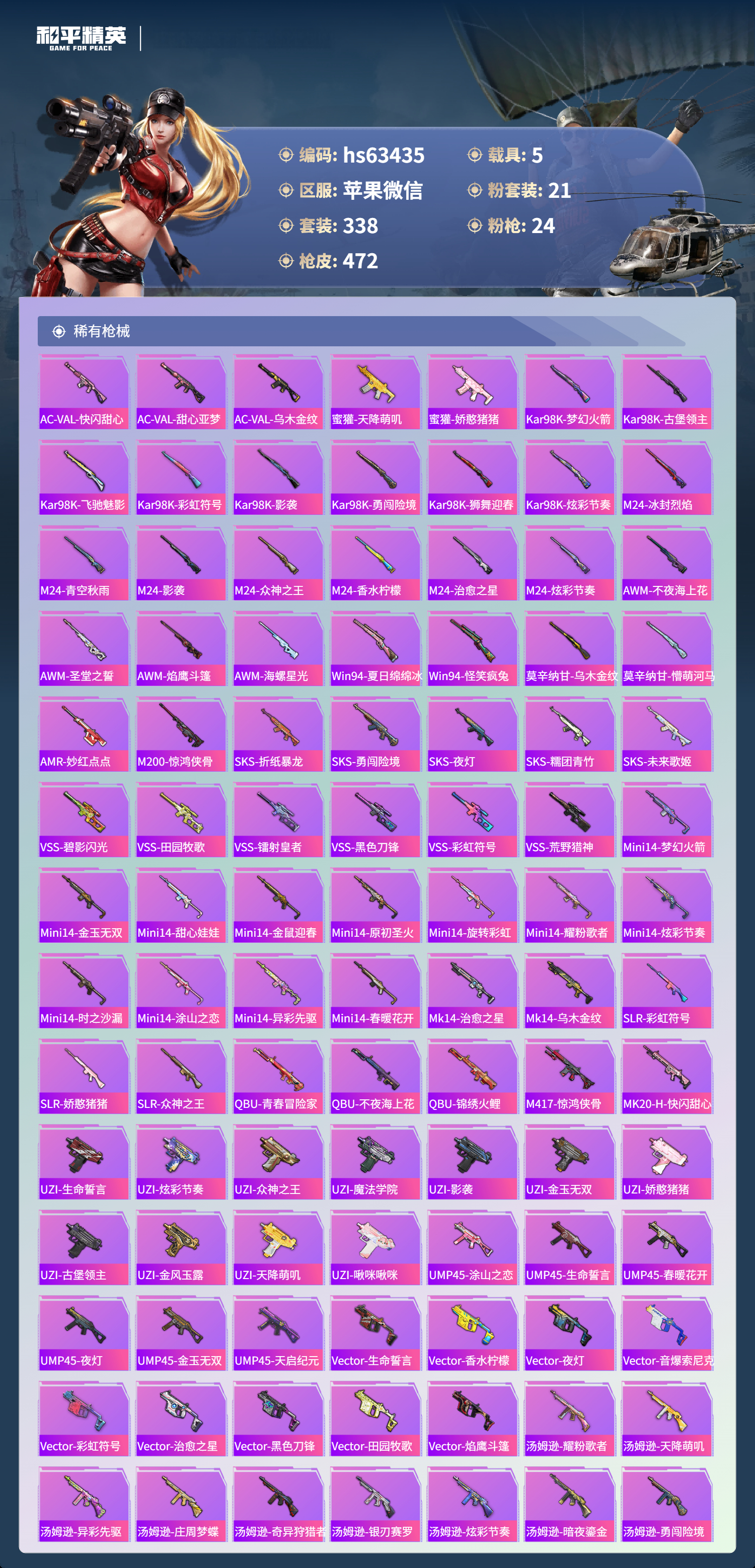 hs63435 苹果微信-29王牌印记-1红装-21粉装-24特效枪-5载具-热力值-338套装-472枪皮-3卓越印记