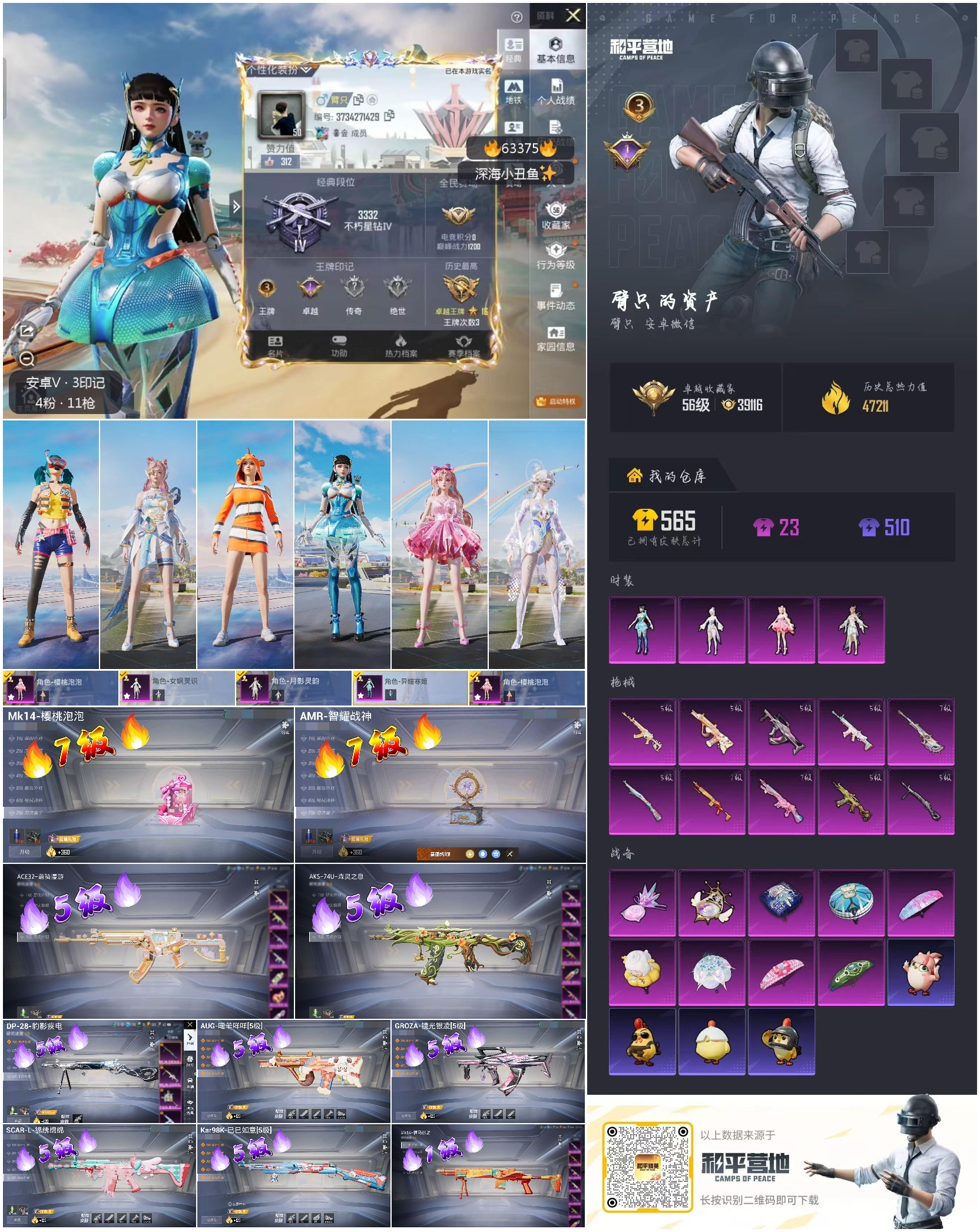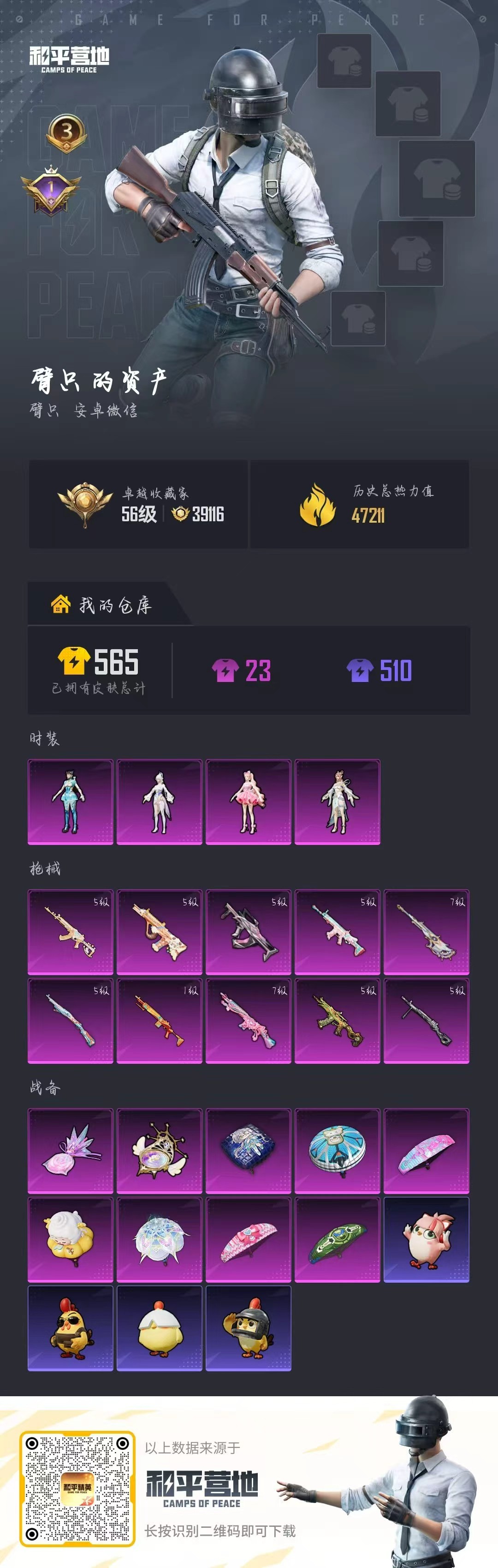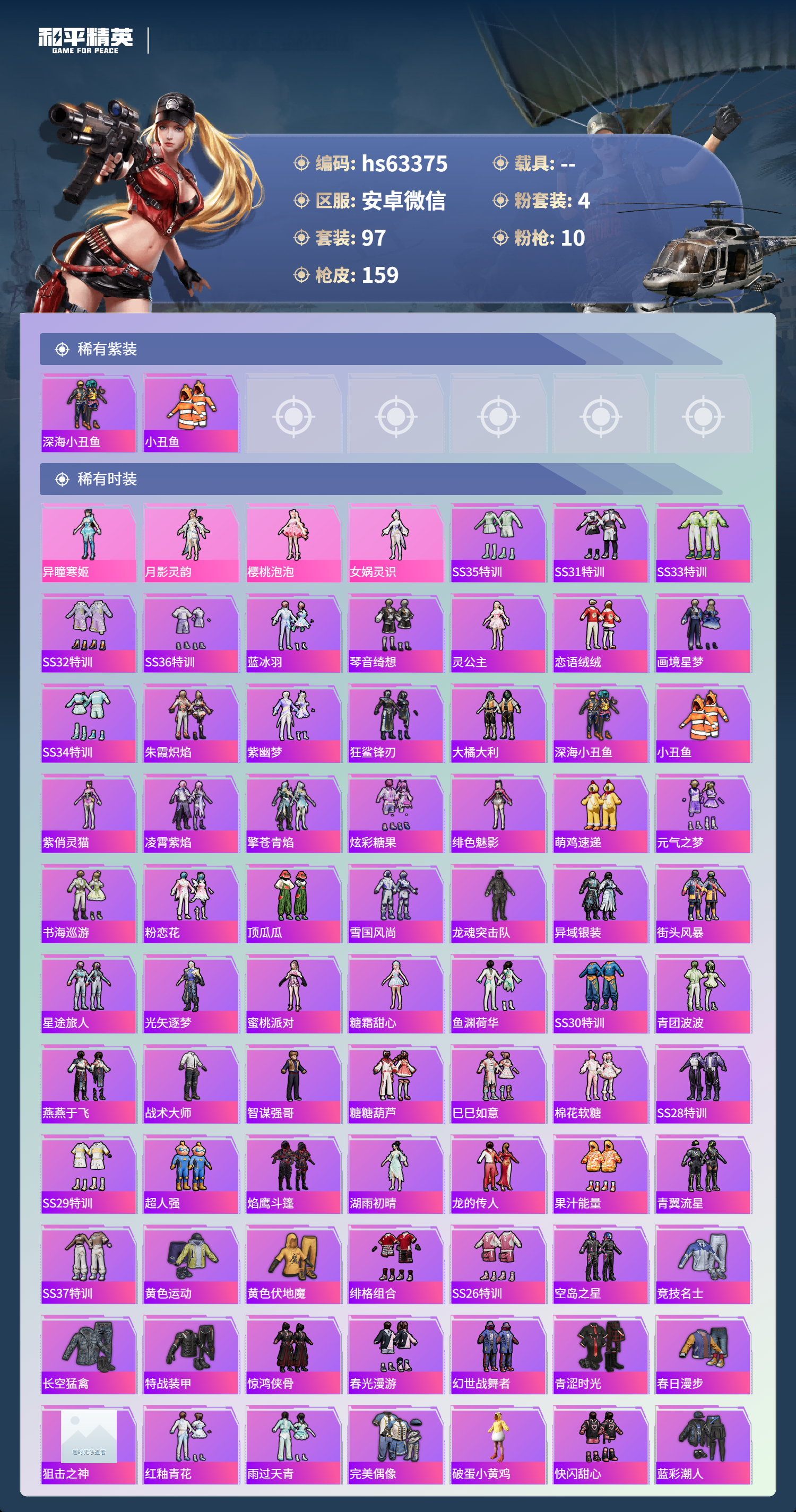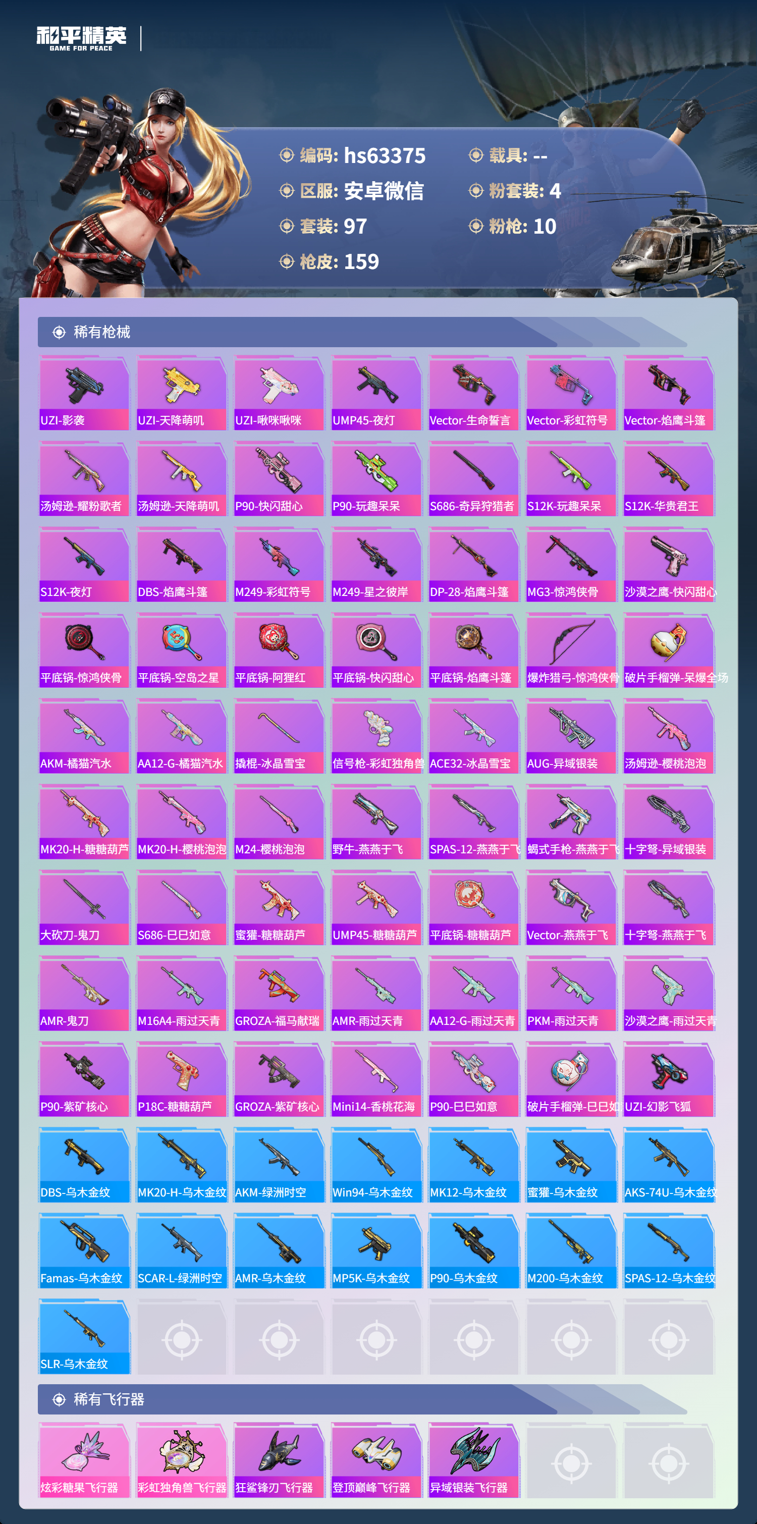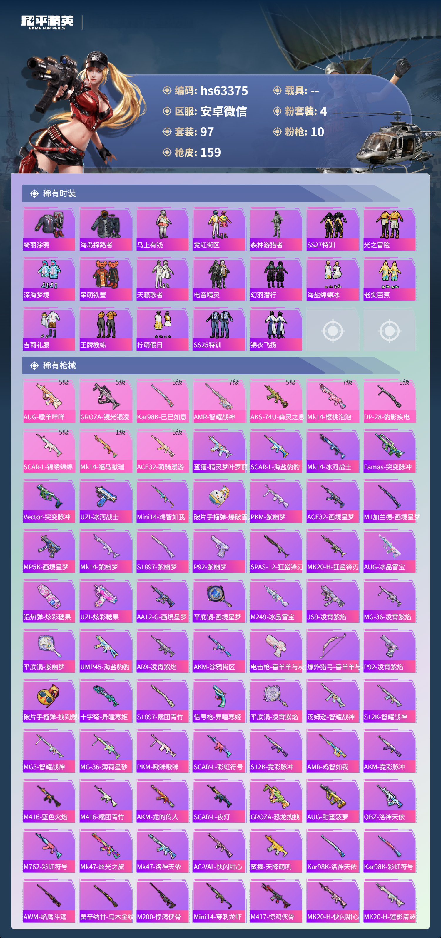 hs63375 安卓微信-3王牌印记-4粉装-10特效枪-47211热力值-97套装-159枪皮-1卓越印记