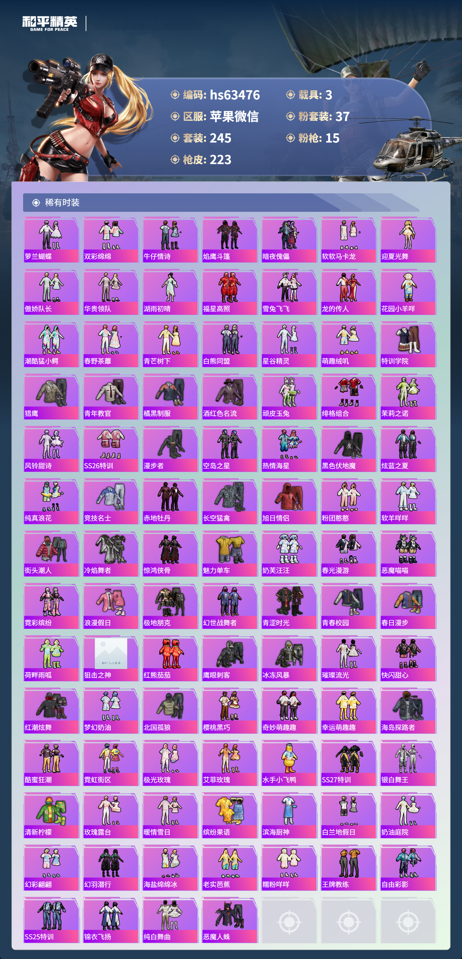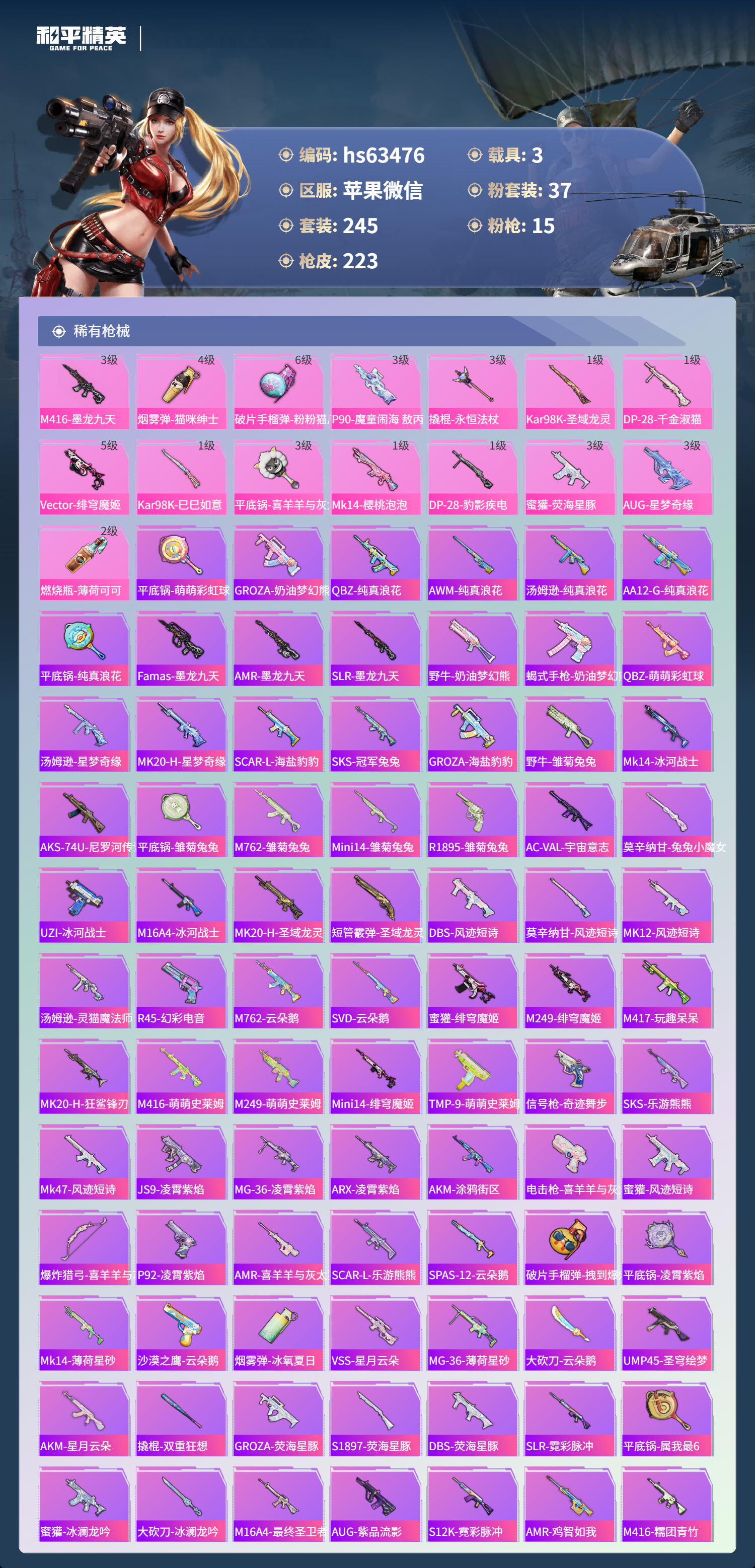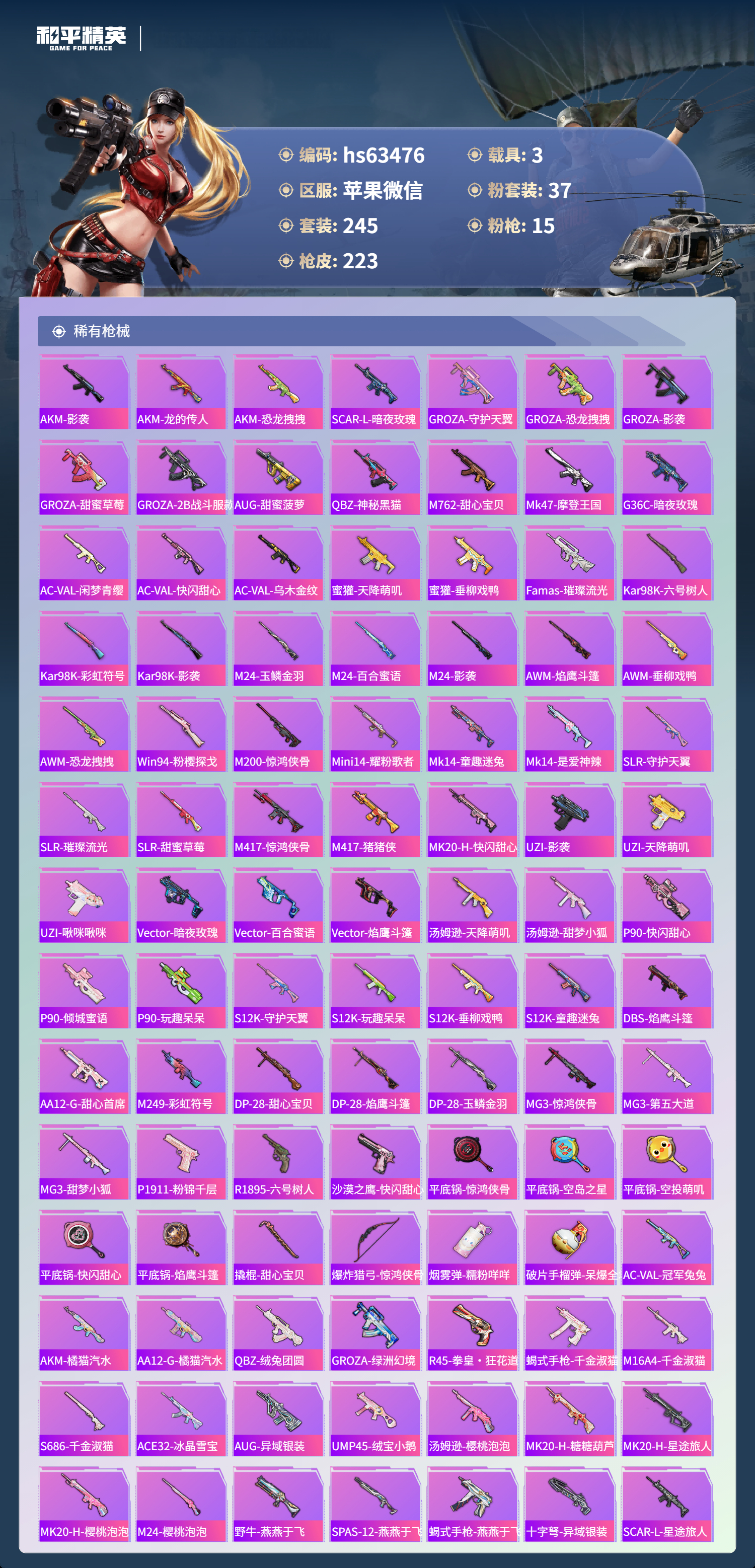 hs63476 苹果微信-3王牌印记-37粉装-15特效枪-3载具-88964热力值-245套装-223枪皮
