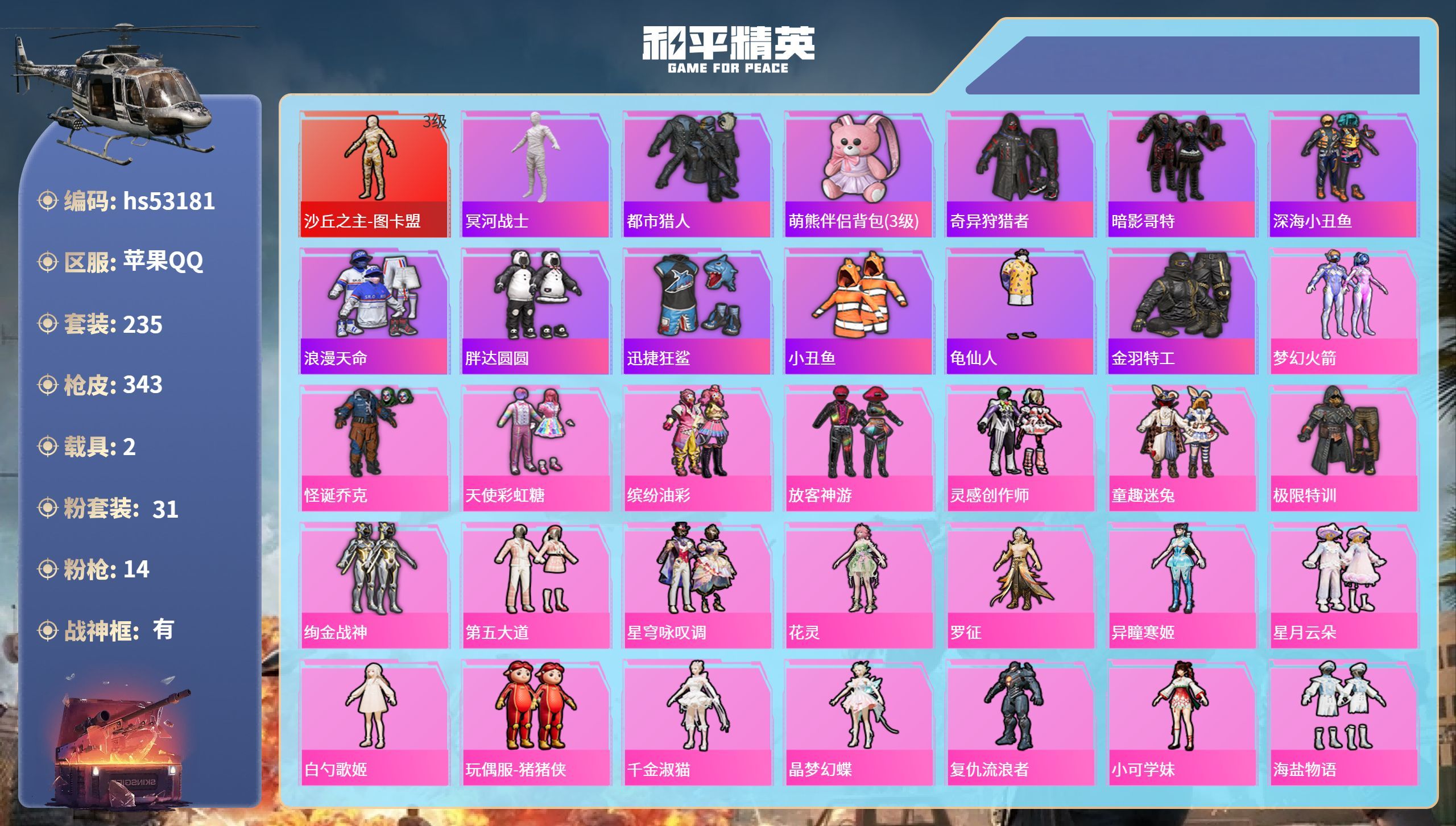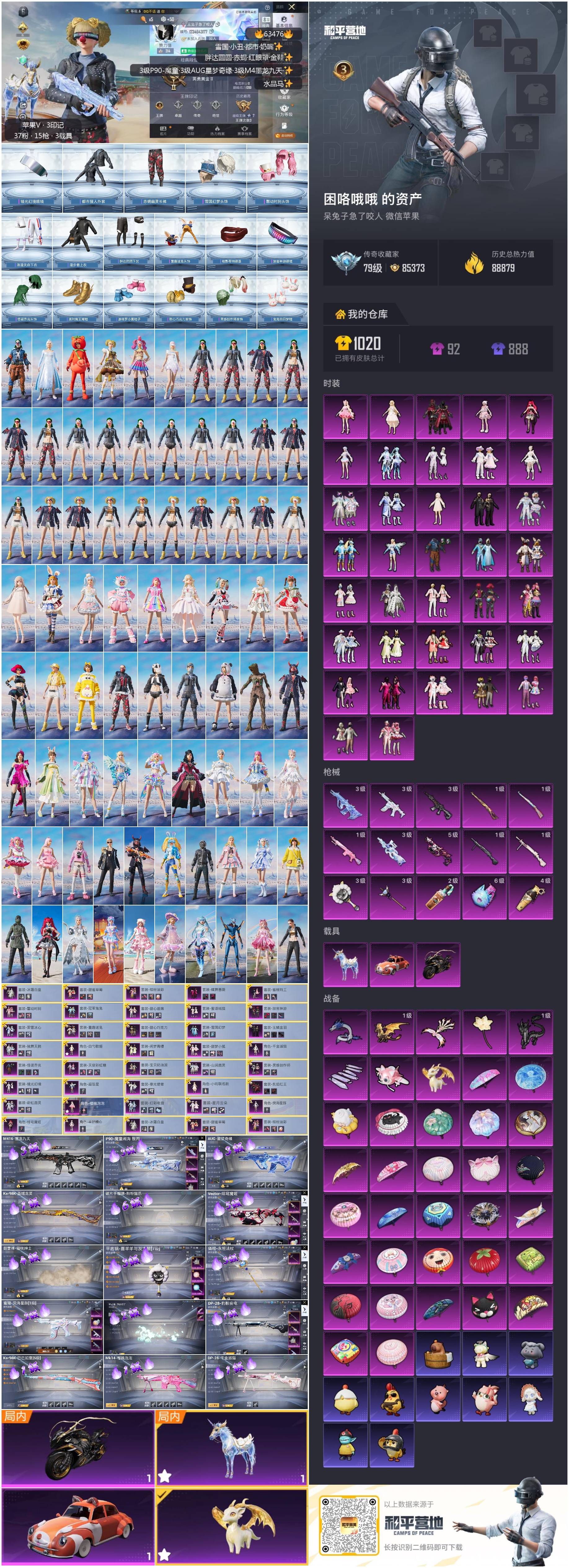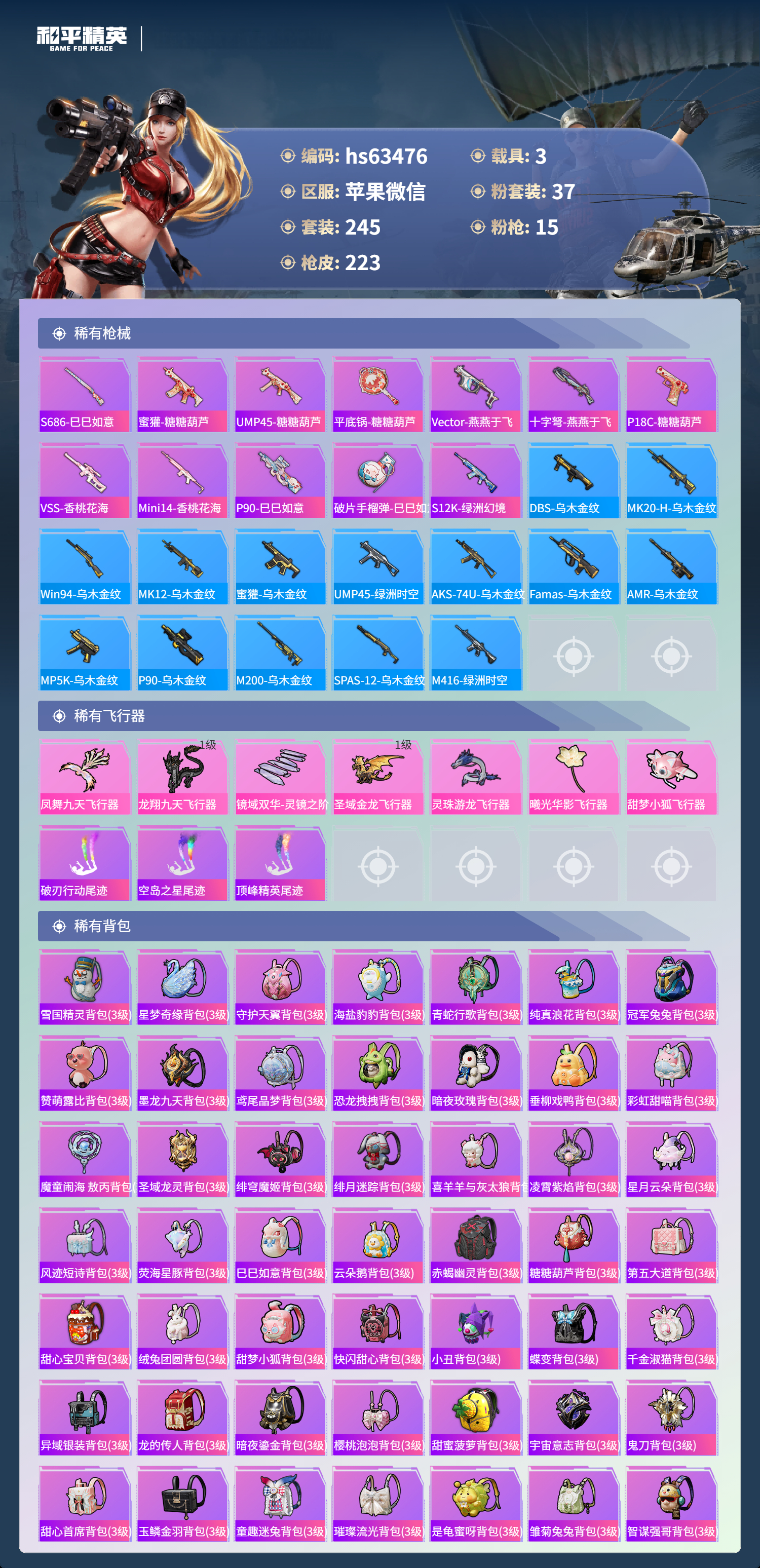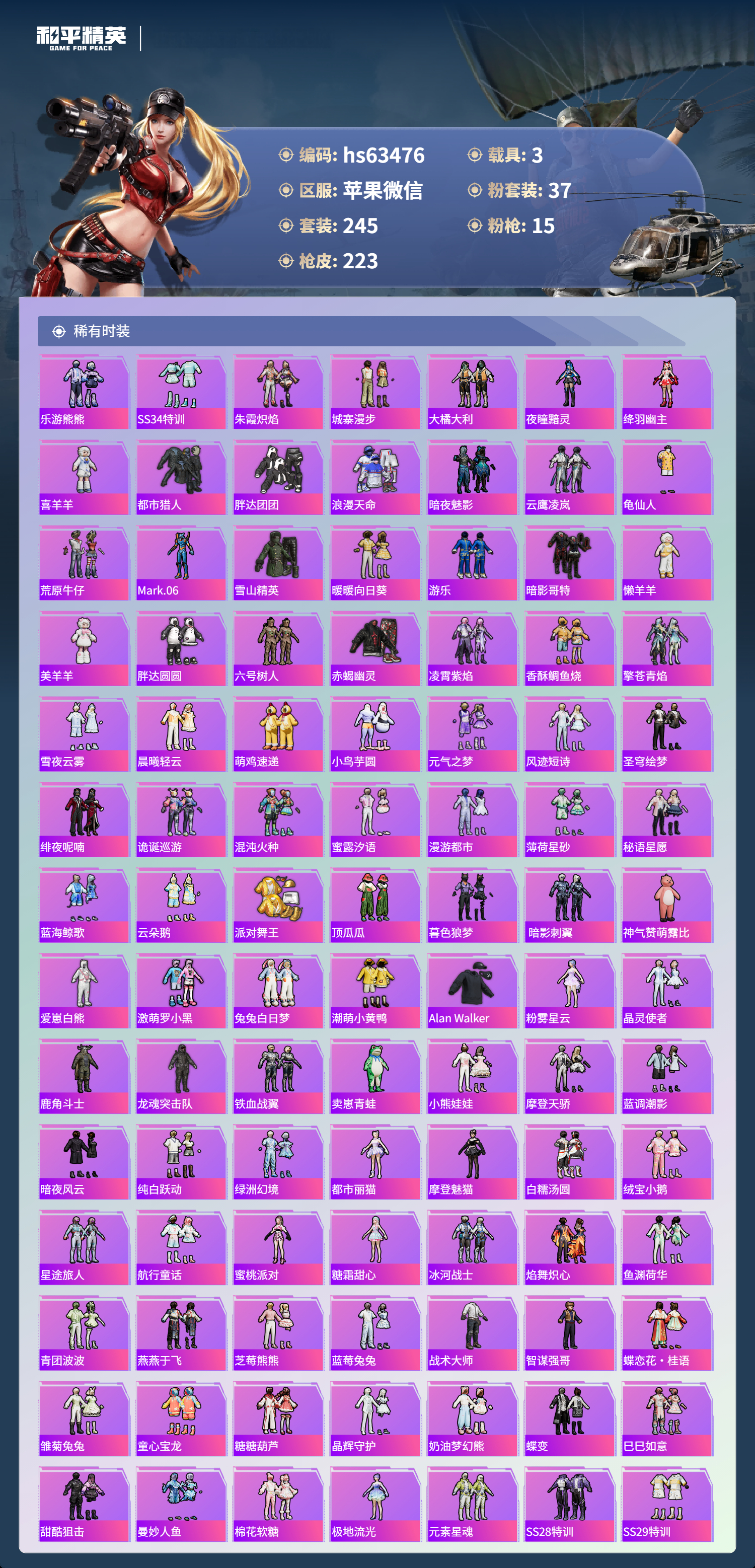 hs63476 苹果微信-3王牌印记-37粉装-15特效枪-3载具-88964热力值-245套装-223枪皮