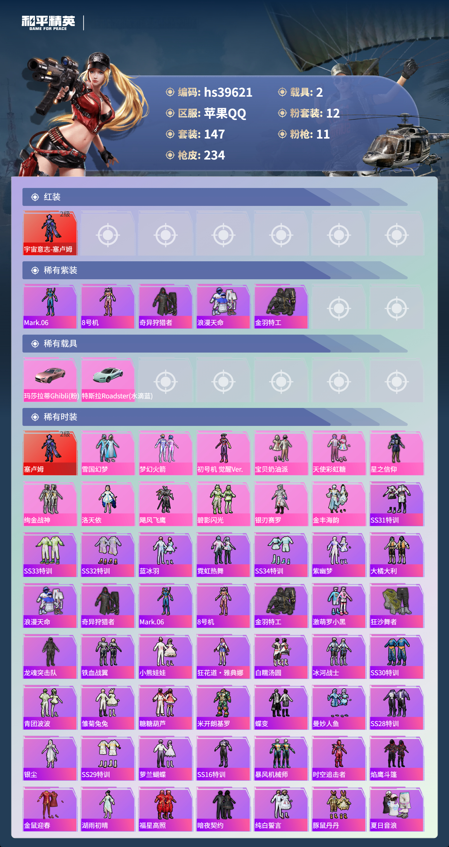 hs39621 苹果手Q-15王牌印记-1红装-12粉装-11特效枪-2载具-82095热力值-147套装-234枪皮-2卓越印记-1传奇印记