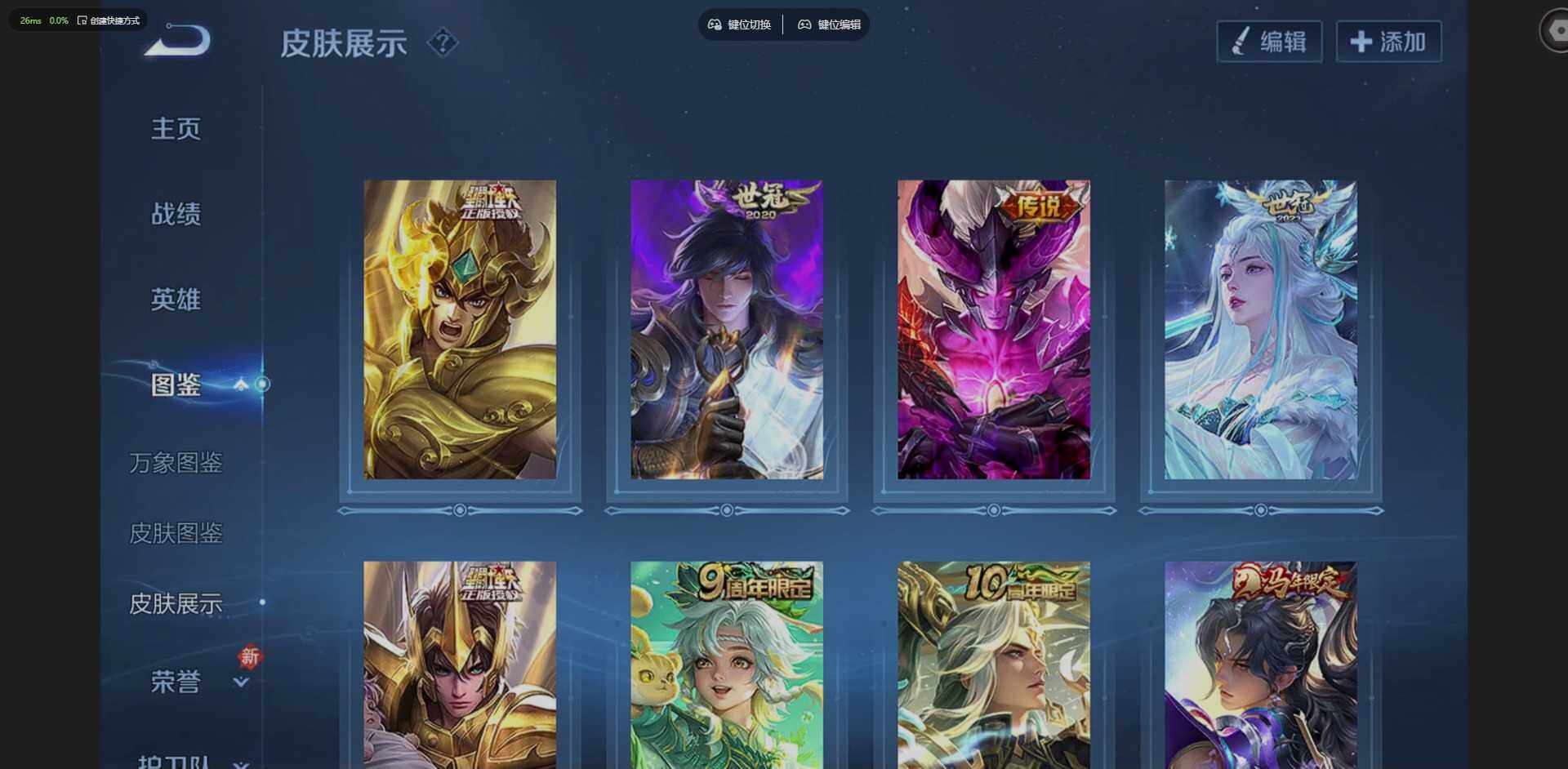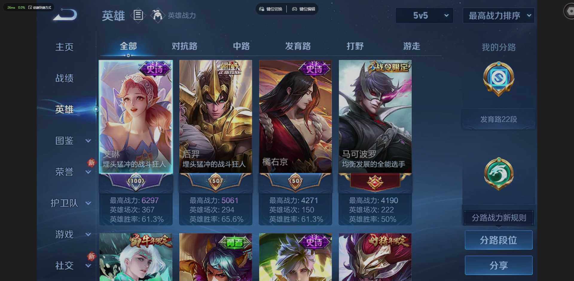 实名: 可修改 贵族等级: V7 英雄数: 127 皮肤数: 221 荣耀水晶