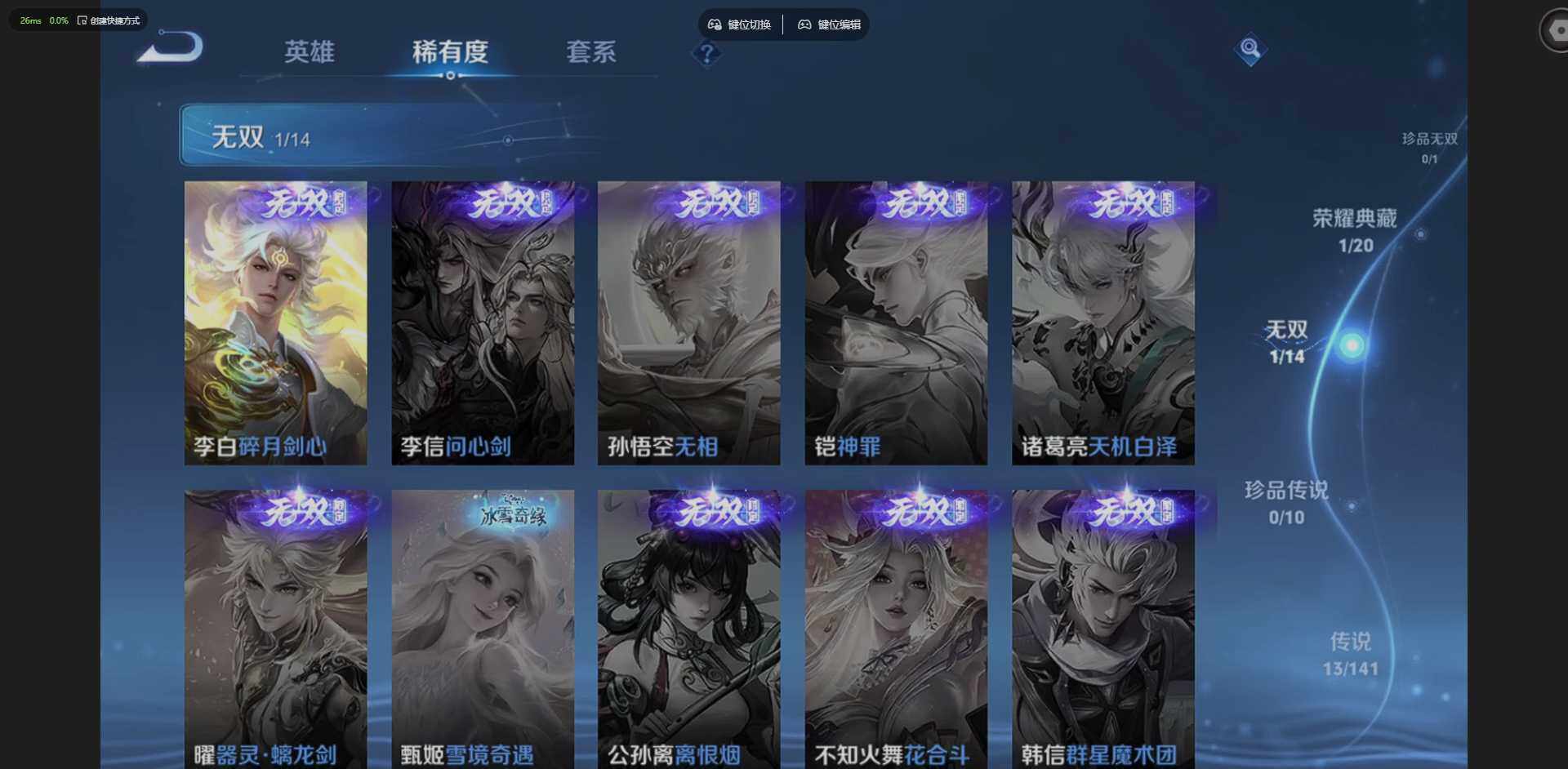 实名: 可修改 贵族等级: V7 英雄数: 127 皮肤数: 221 荣耀水晶: 赤影疾锋 无双皮: 碎月剑心 星传说: 幽冥之眼 传说皮: 黄金狮子座,黄金射手座,一念神魔,地狱之眼,霜月吟,琥珀纪元马超,九山相柳,神树通天,神骥·逐星野 限定皮: 遇见飞天,李小龙,梁祝,时雨天司,白晶晶,白虎志,朱雀志,如梦令-后羿,大圣娶亲,高山流水,孙行者,诗剑行,鸣野蒿