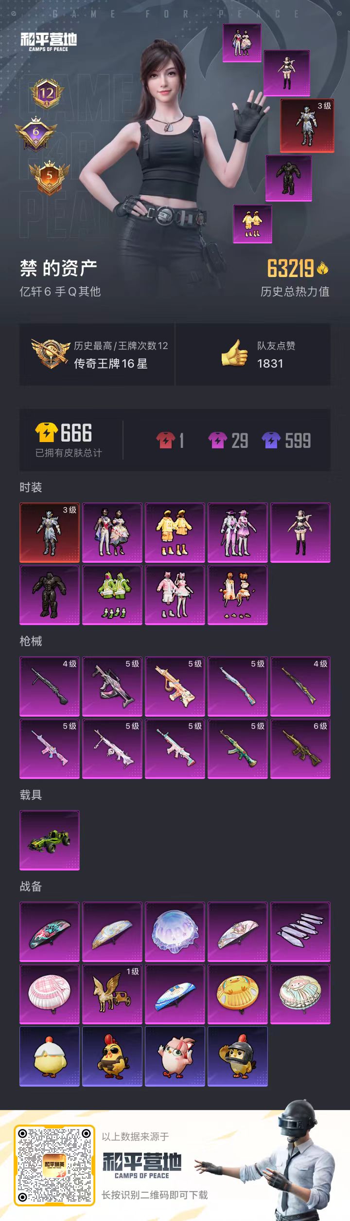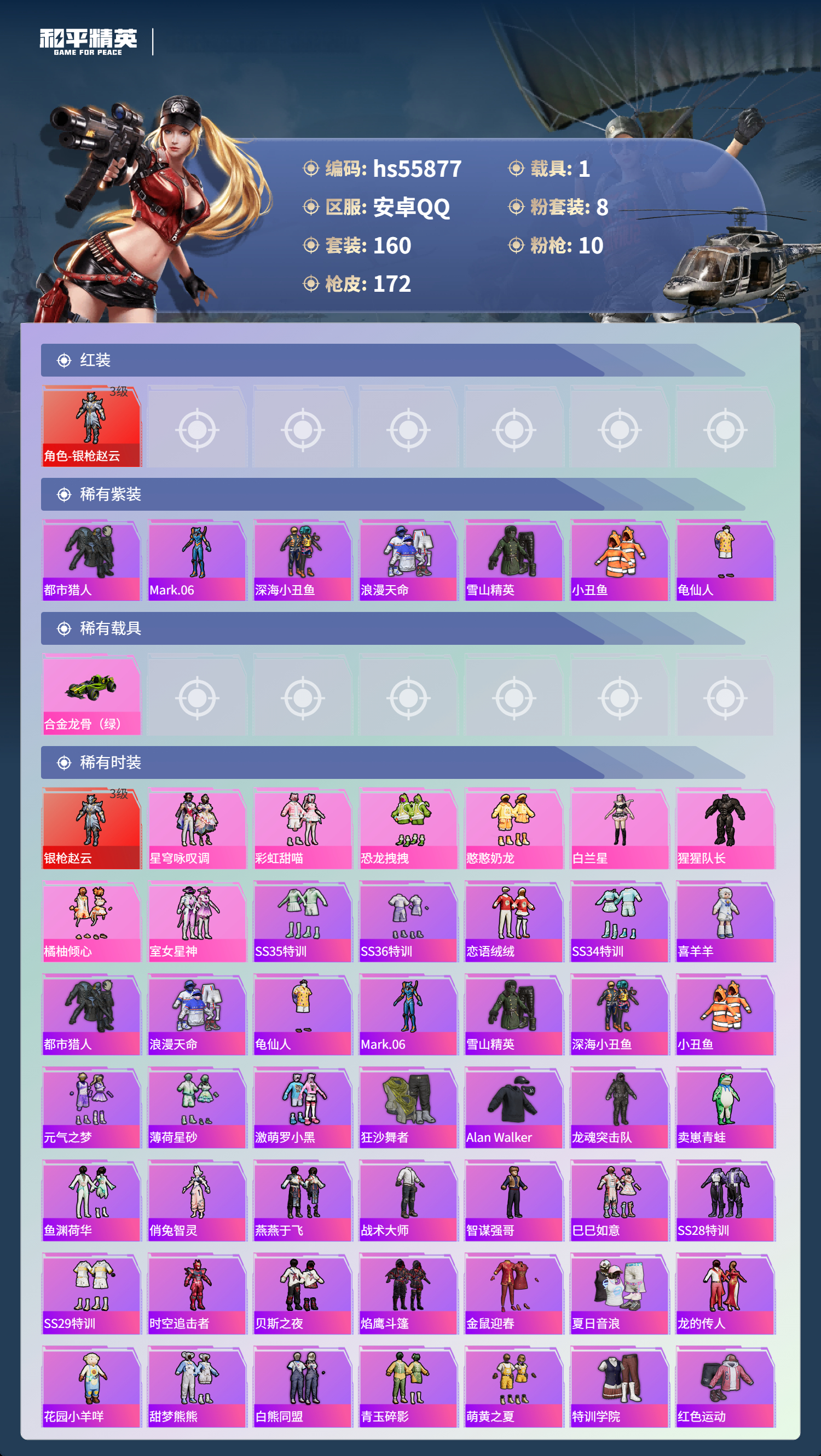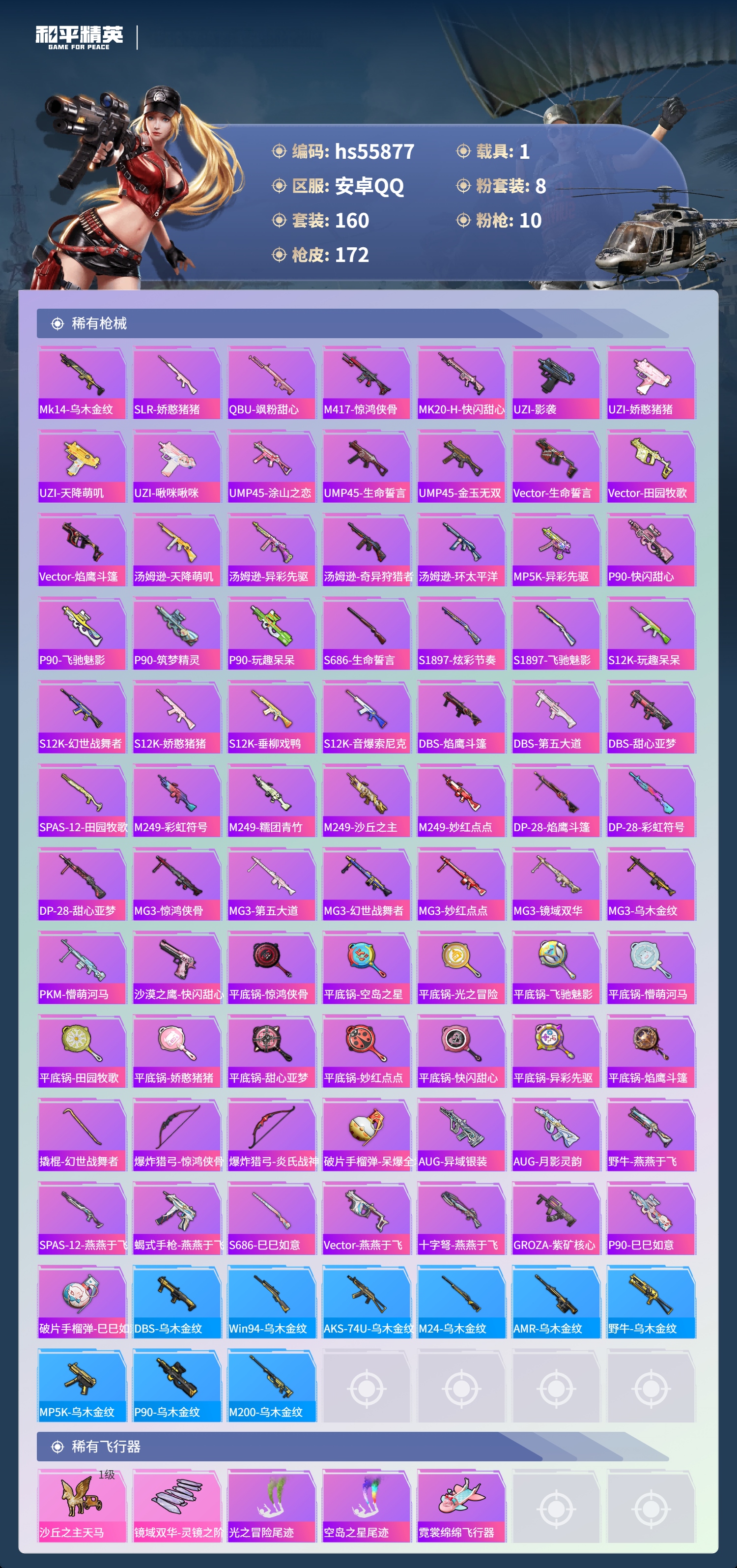 hs55877 安卓手Q-12王牌印记-1红装-8粉装-10特效枪-1载具-63320热力值-160套装-172枪皮-6卓越印记-5传奇印记
