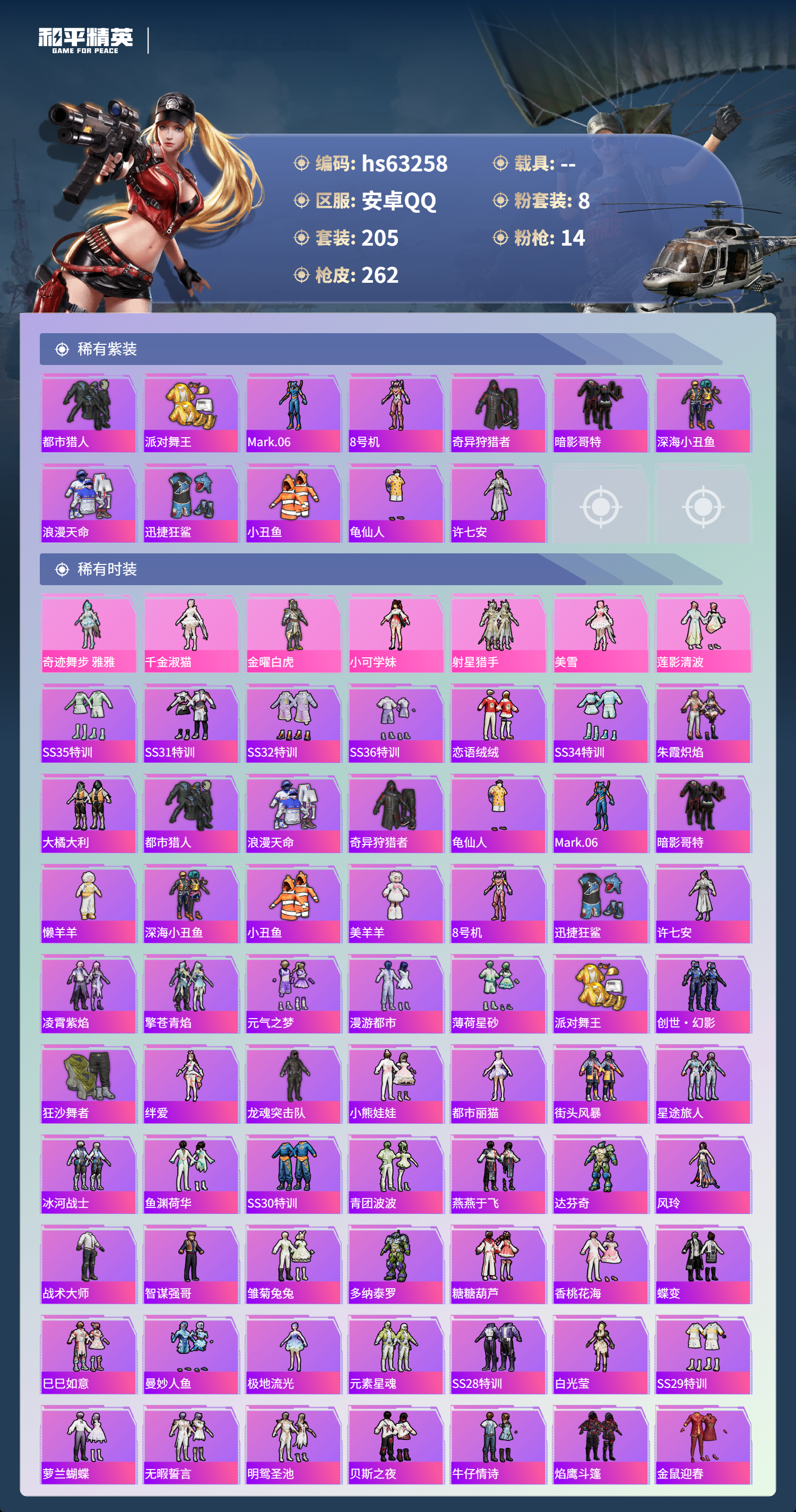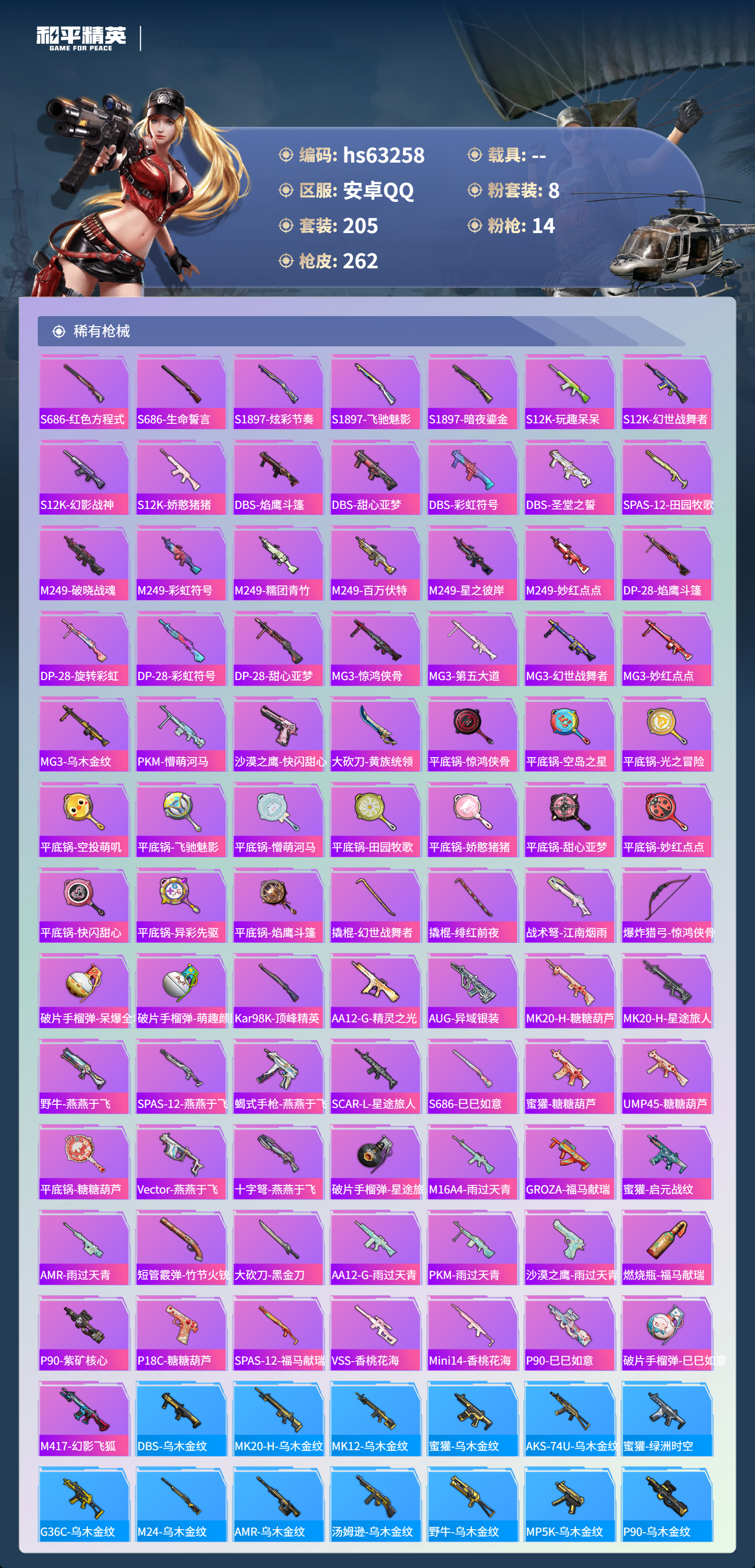 hs63258 安卓手Q-11王牌印记-8粉装-14特效枪-81378热力值-205套装-262枪皮