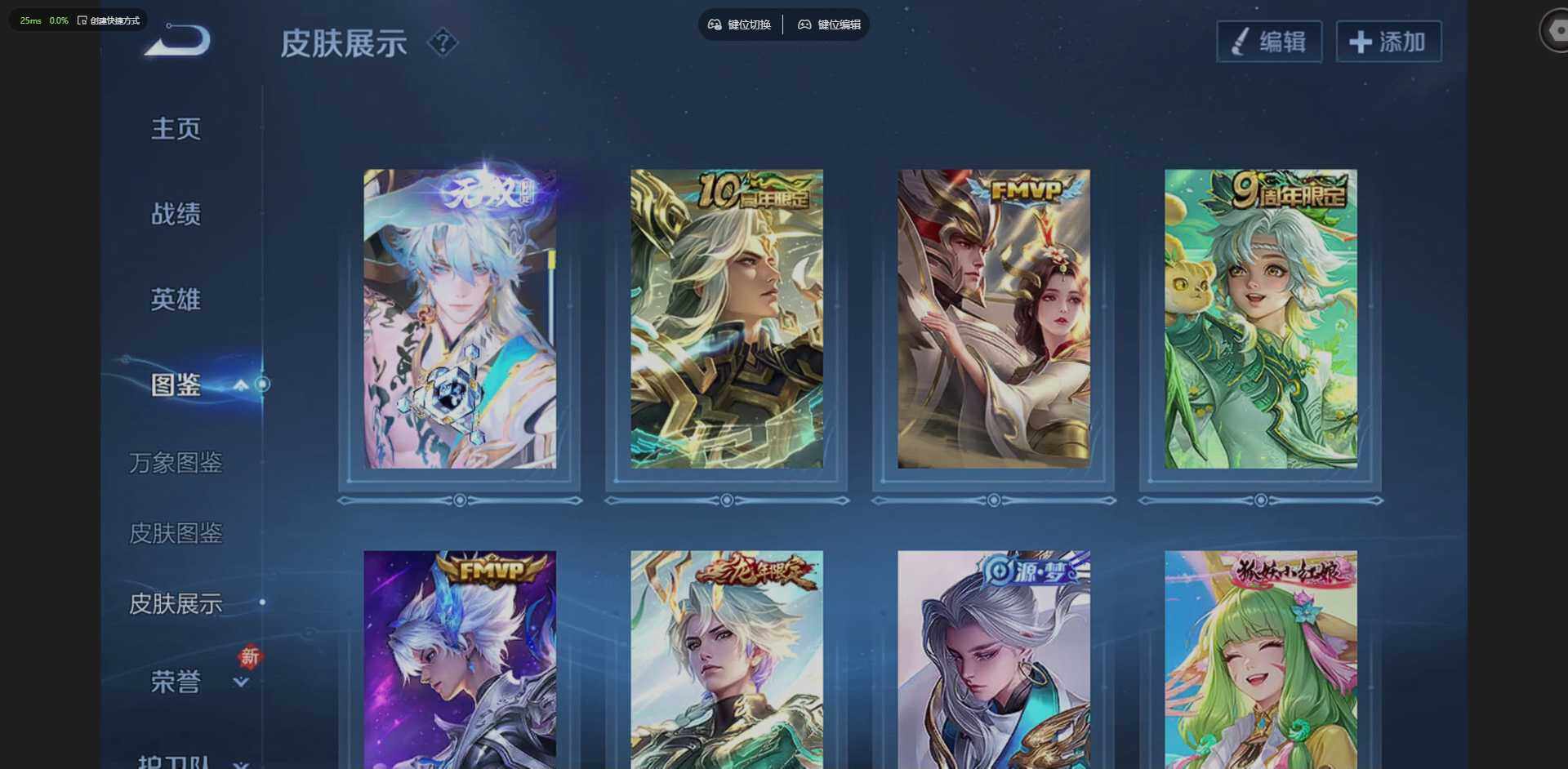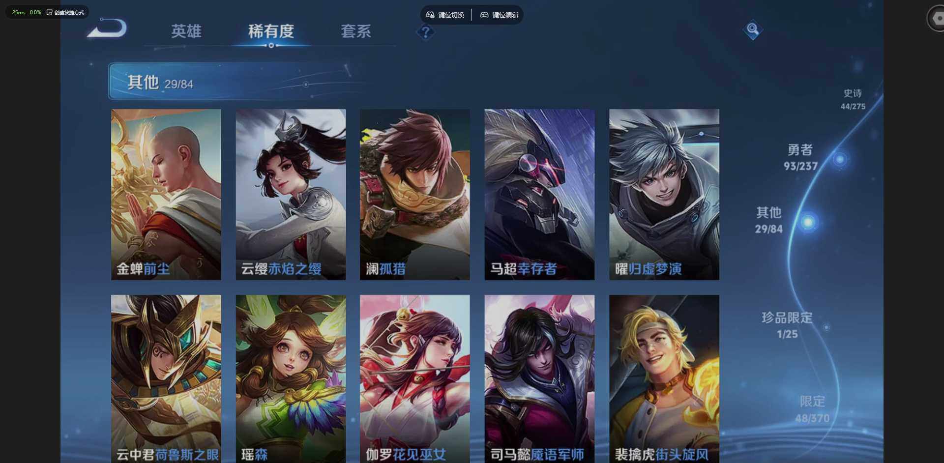 贵族等级: V6 英雄数: 127 皮肤数: 173 荣耀水晶: 千魇归渊 无双皮: 天机白泽 传说皮: 久胜战神,澜逐花归海,乘龙·铭钟鼎,神树通天 限定皮: 逐梦之影,孙行者,鸣野蒿,逐霄战戟