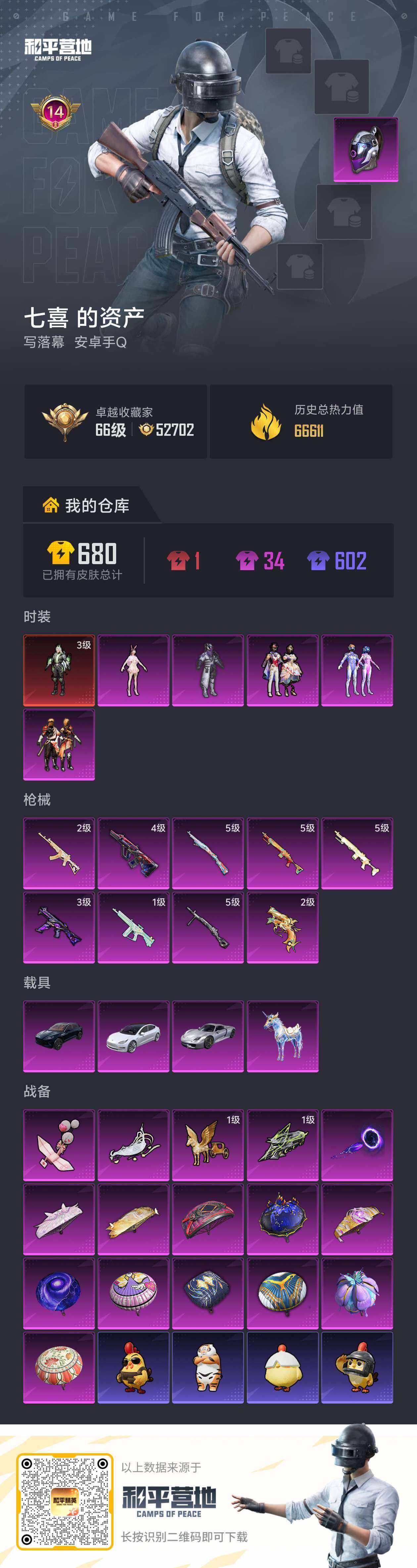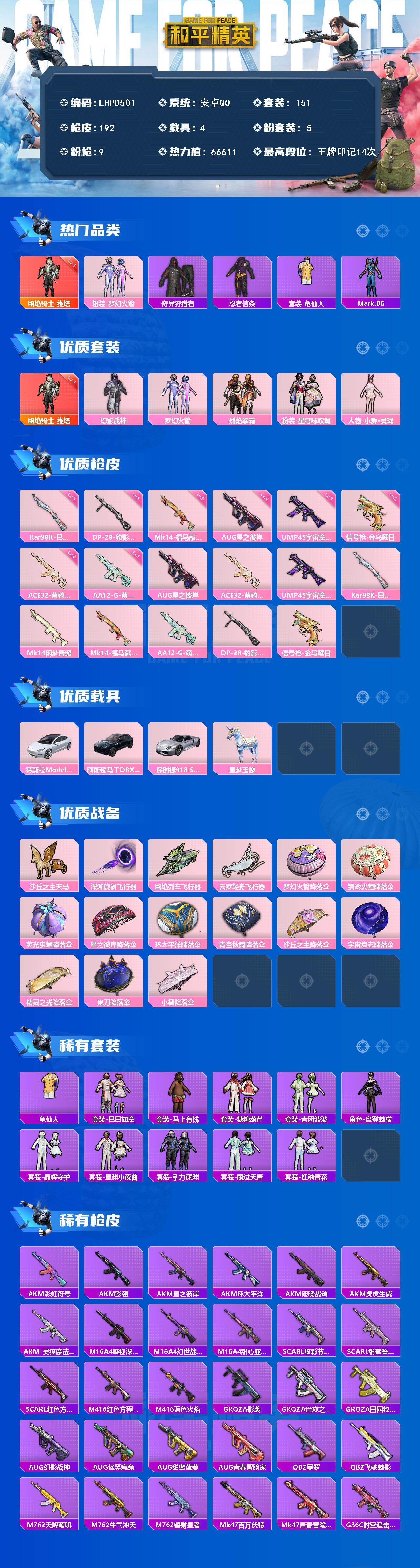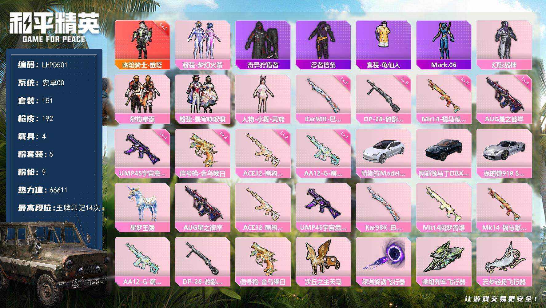 【店主推荐捡漏号!可直接换绑】安卓 手Q-1神装-5粉装-9特效枪-4载具-5粉色飞行器-66611热力值-14王牌印记-151套装-192枪皮【红色神装等级】:幽焰骑士-维塔(三级)【红色角色神装】:幽焰骑士-维塔【热门品类】:粉装-梦幻火箭,套装-奇异狩猎者,套装-忍者信条,套装-龟仙人,角色-Mark.06【粉色套装】:粉装-幻影战神,粉装-梦幻火箭,粉装-烈焰拳霸,粉装-星穹咏叹调,人物