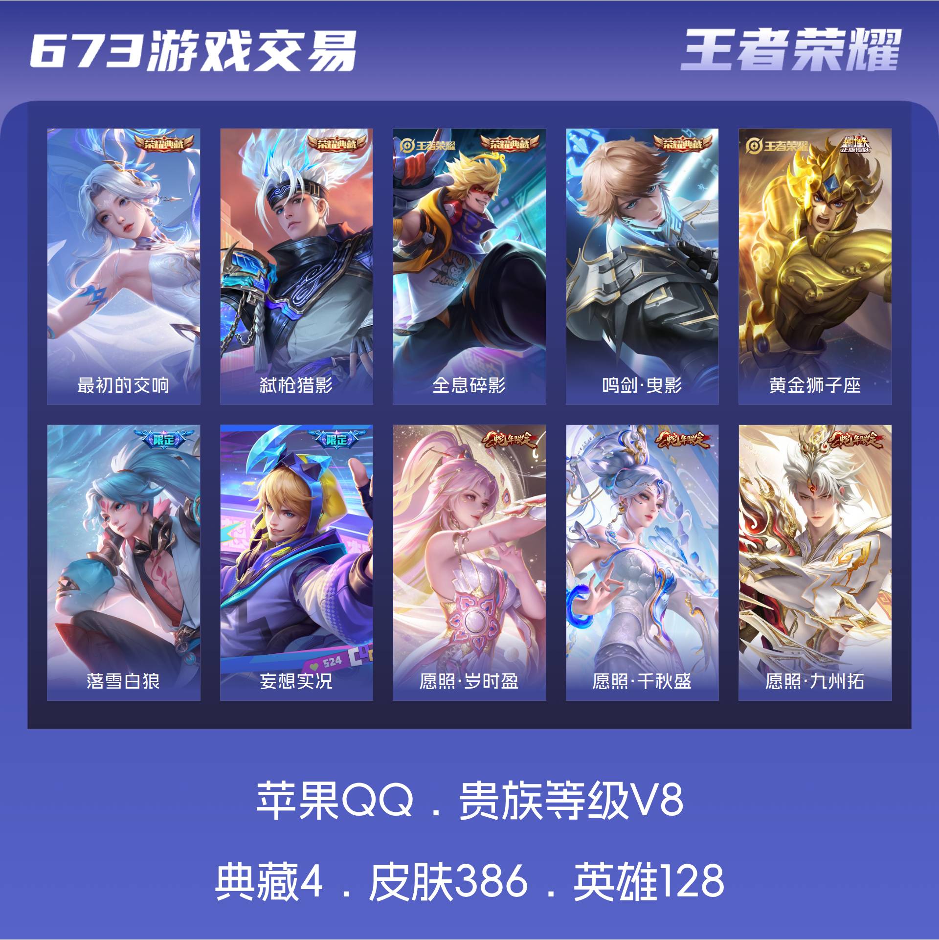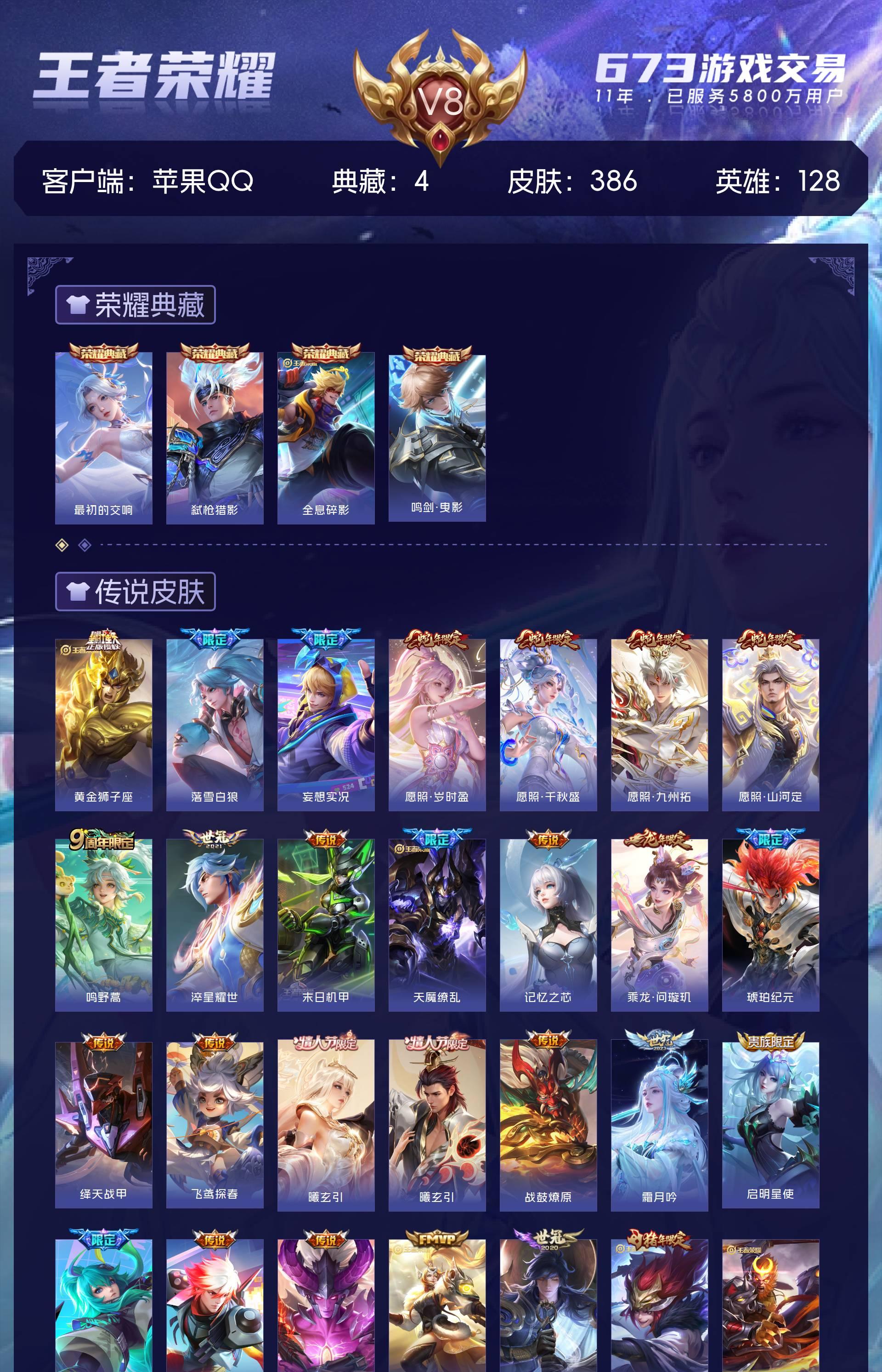 苹果QQ/永恒钻石/386皮肤/128英雄/4典藏/0珍品无双/0无双/0珍品传说/28传说/115