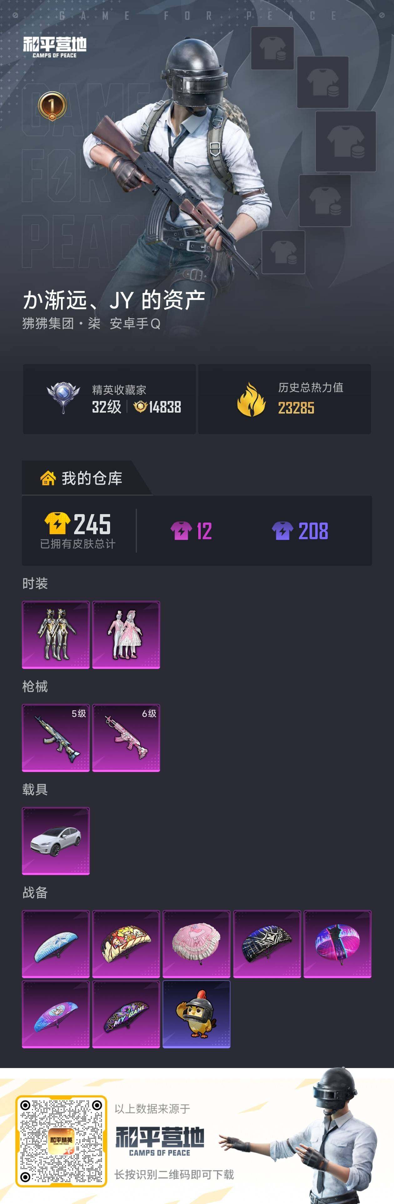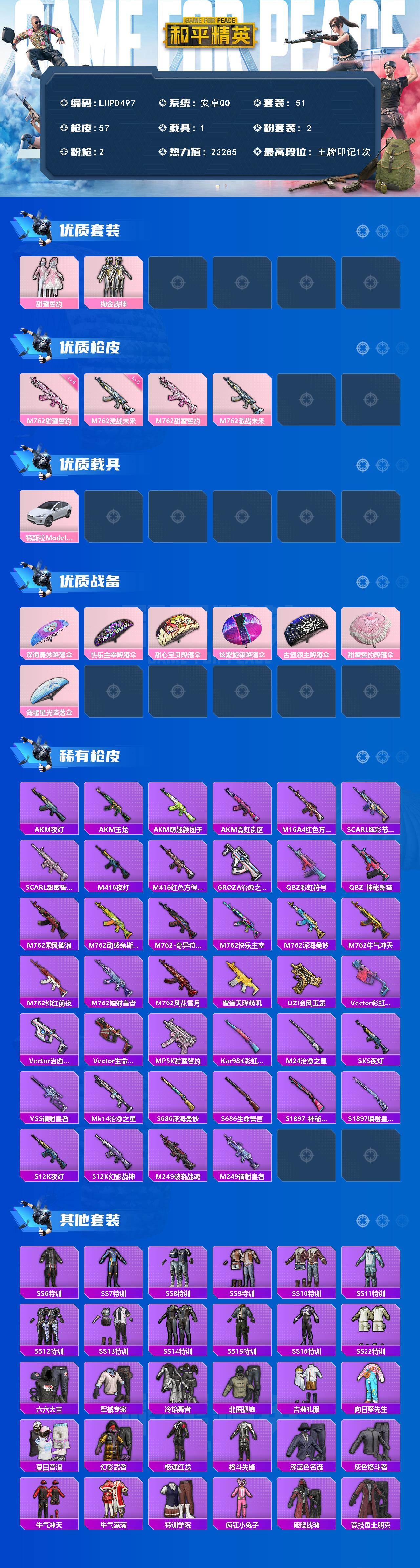 【特价出售/店主推荐】安卓 手Q-2粉装-2特效枪-1载具-0粉色飞行器-23285热力值-1王牌印记-51套装-57枪皮