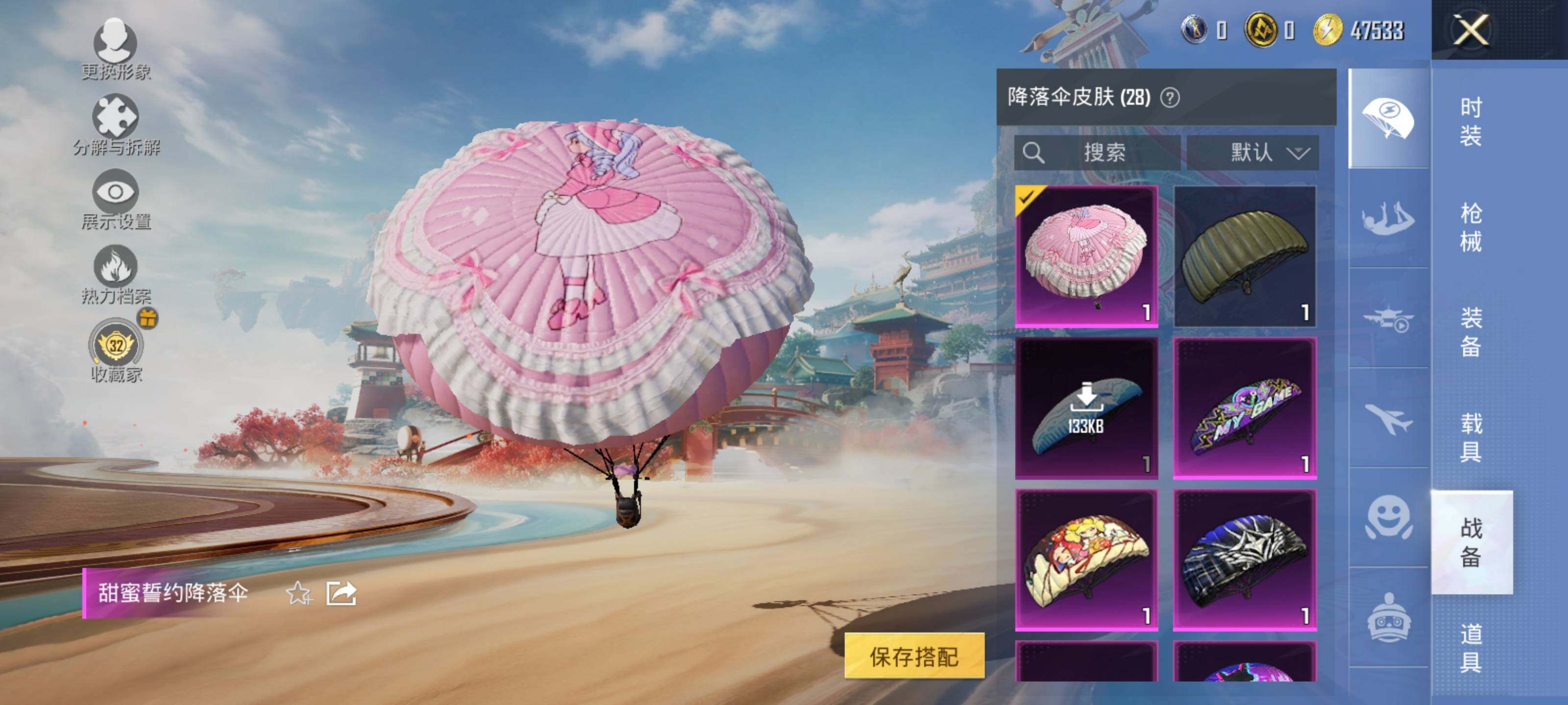 【粉色降落伞】:深海曼妙降落伞,快乐主宰降落伞,甜心宝贝降落伞,炫紫旋律降落伞,古堡领主降落伞,甜蜜誓约降落伞,海螺星光降落伞