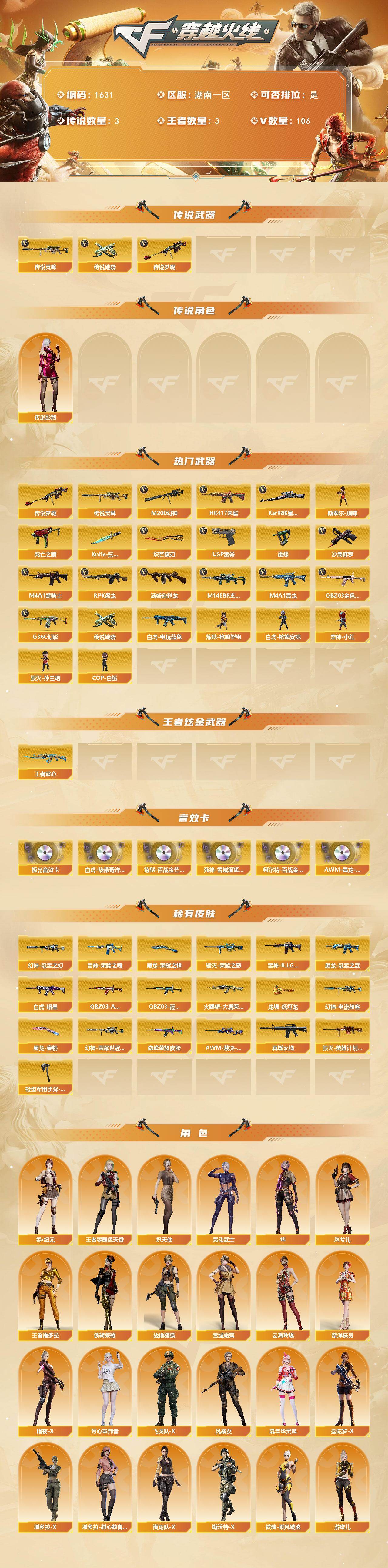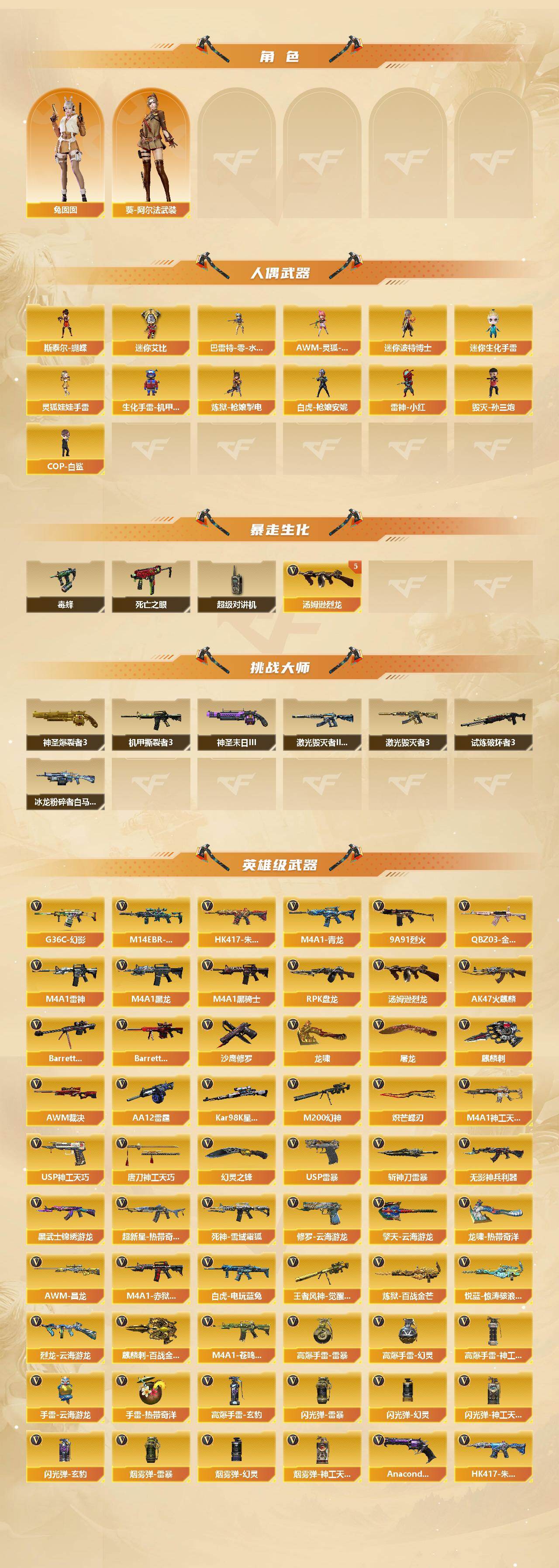 【热门武器】:传说梦魇,传说灵眸,传说破晓,G36C-幻影,QBZ03-金色蔷薇,M14EBR-玄武,HK417-朱雀,M4A1-青龙,M200-幻神,死亡之眼,白虎-电玩蓝兔,Kar98K-星神,毒蜂,M4A1-黑骑士*3,汤姆逊-烈龙*5,RPK-盘龙*2,斯泰尔-蝴蝶,炼狱-