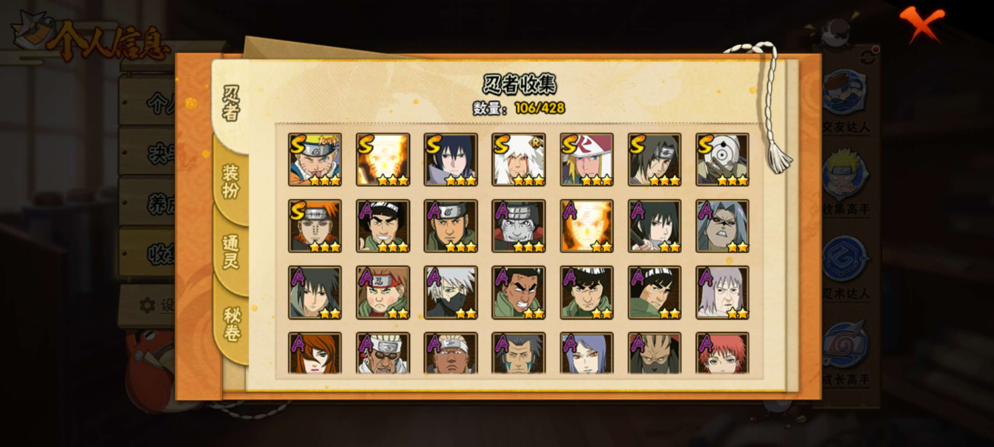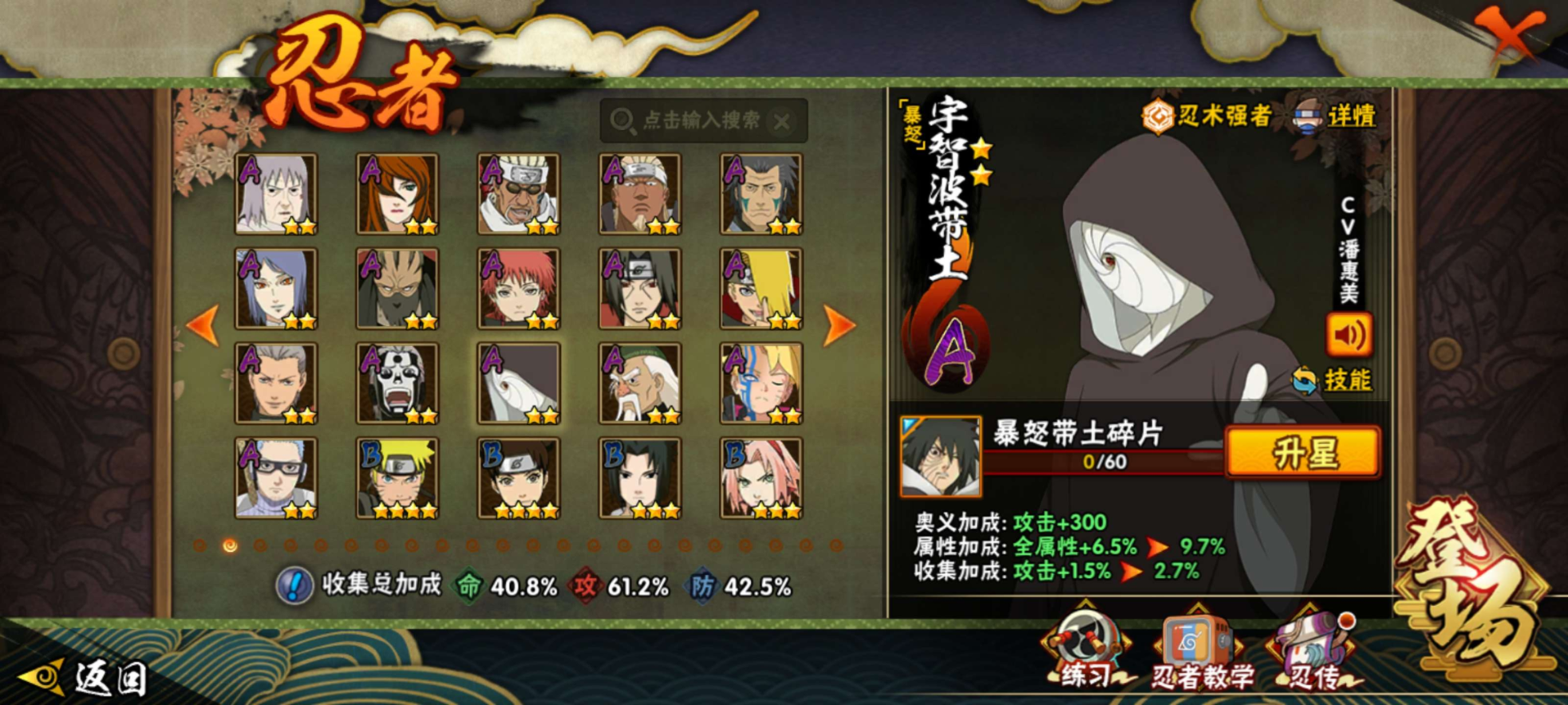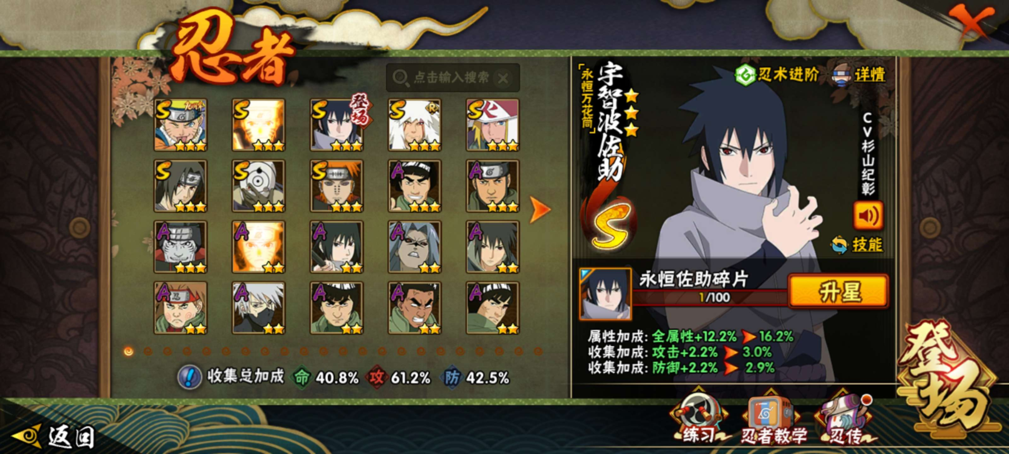 【S级忍者】宇智波佐助「永恒万花筒」(3星),漩涡鸣人「九喇嘛连结」(3星),宇智波斑「白面具」(3星),自来也「舞之豪杰」(3星),宇智波鼬「须佐能乎」(3星),漩涡鸣人·宇智波佐助(3星),佩恩「天道」(3星),波风水门(3星),