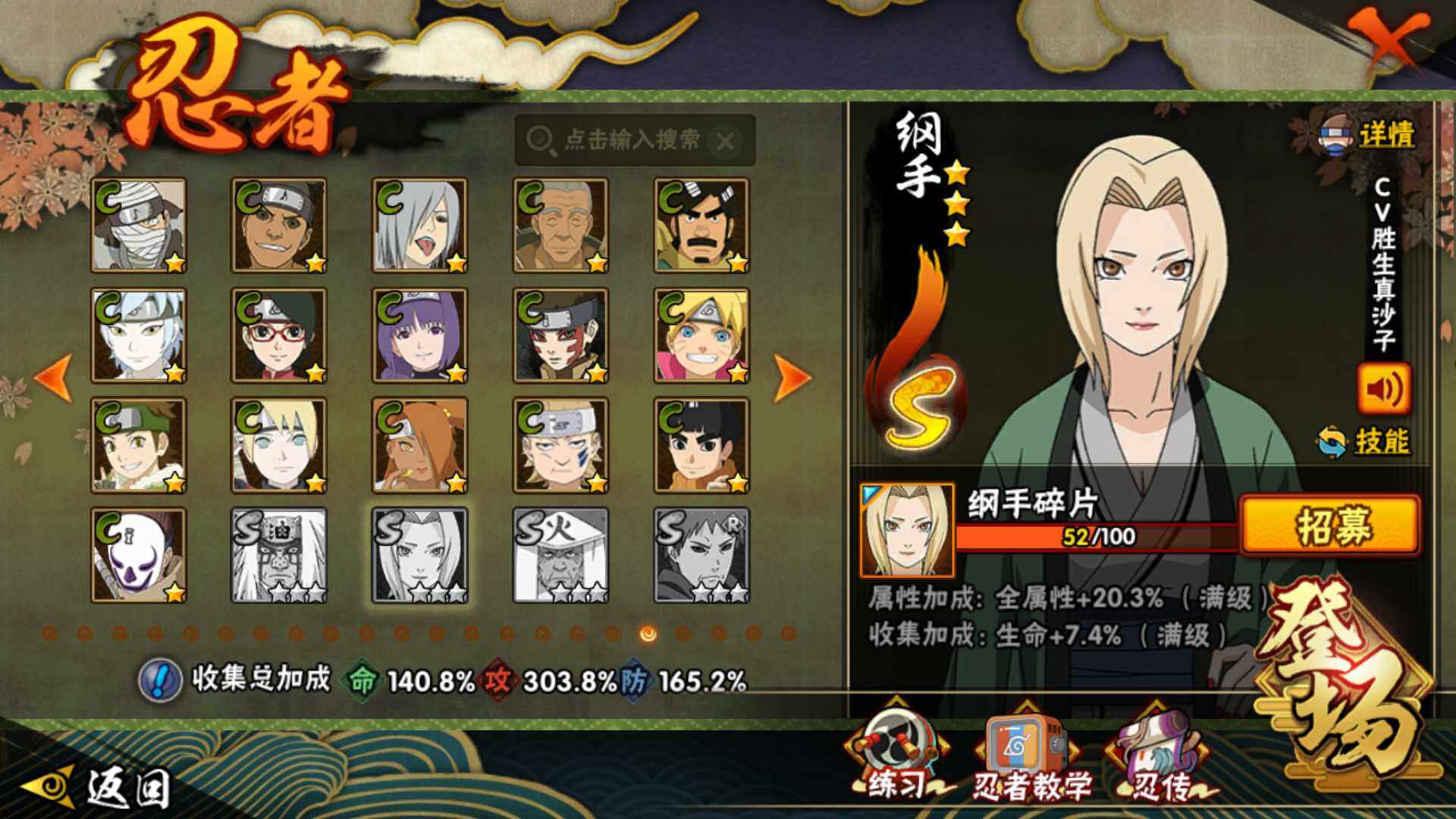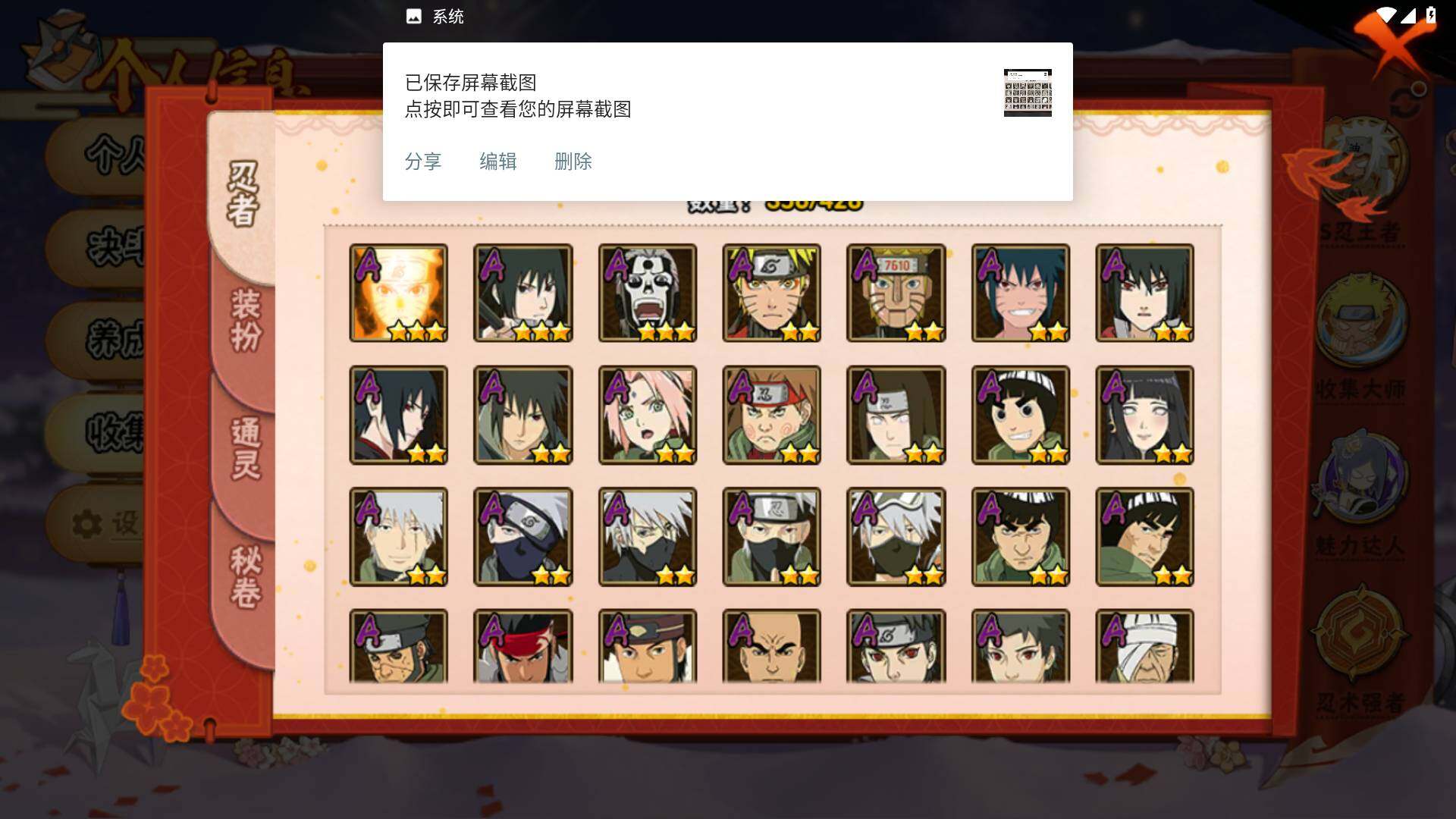 【S级忍者】:长门「秽土转生」(3星),半藏「秽土转生」(3星),金角·银角「秽土转生」(3星),猿飞日斩「秽土转生」(3星),波风水门「秽土转生」(3星),千手扉间「秽土转生」(3星),千手柱间「秽土转生」(3星),宇智波鼬「秽土转生」(3星),宇智波斑「秽土转生」(3星),宇智波斑「秽