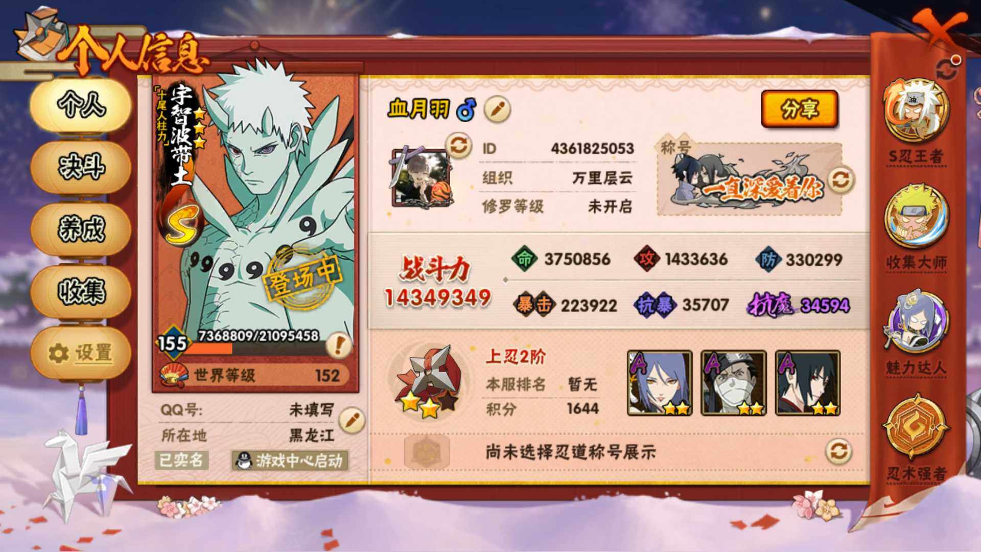 可免费转苹果 v14 1434.9万战力 50S 86A 1万9千金币 有熊猫 纲手52片 zp3487