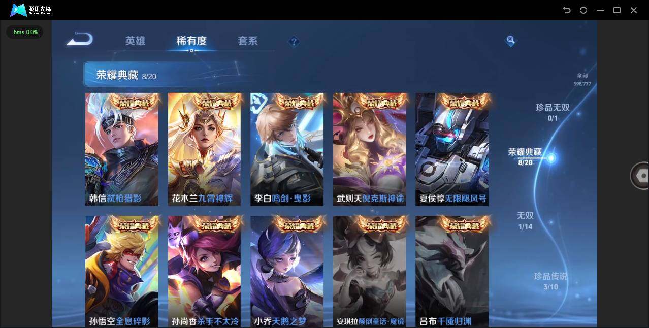 -V10-129英雄-398皮肤-8典藏皮肤-1典藏英雄-1无双-3珍品传说-42传说-119史诗-5星传说-1传说天幕