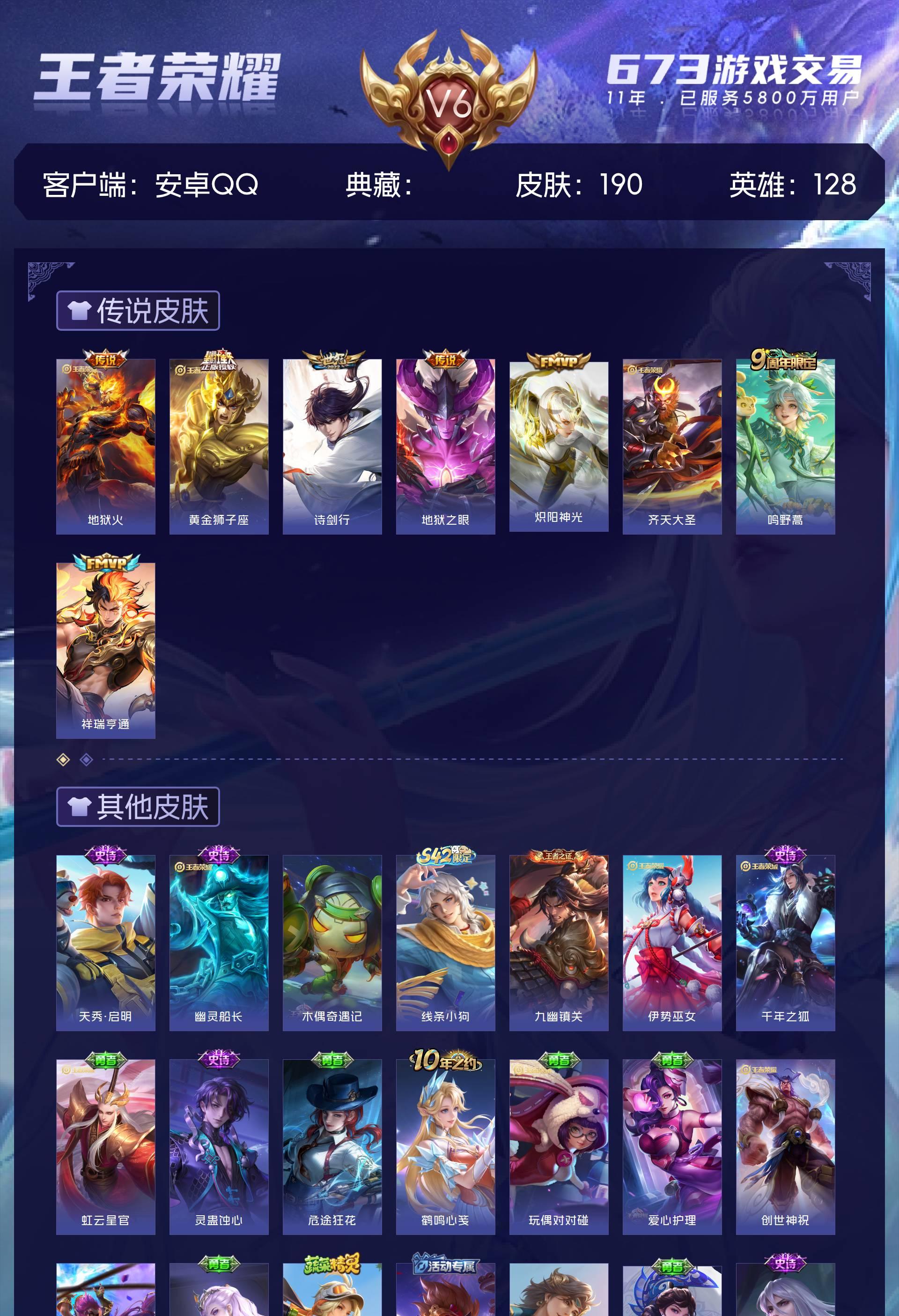 V6 皮肤190 英雄128 至尊星耀 星传说1 传说8 其他皮肤189