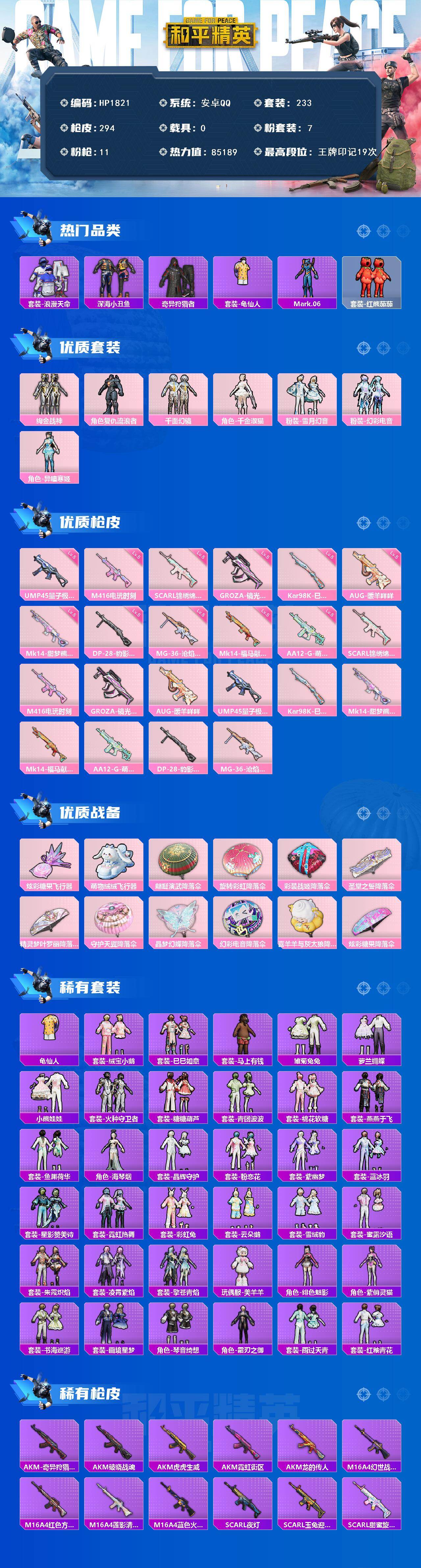 【HP1821】233套装/枪械11/装备349/战备208/王牌印记19/热力值85189/五级SCAR-L-锦绣绵绵/五级M416-电玩时刻/五级GROZA-镜光银凌/五级AUG-暖羊咩咩/五级UMP45-量子极限/五级Kar98K-巳巳如意/五级Mk14-甜梦熊击/五级Mk14-福马献瑞/五级AA12-G-萌骑幻想/五级DP-28-豹影疾电/五级MG-36-沧焰双生/套装-浪漫天命/套装-深海小丑鱼/套装-奇异狩猎者/套装-龟仙人/角色-Mark.06/套装-红熊茄茄/粉装-绚金战神/角色