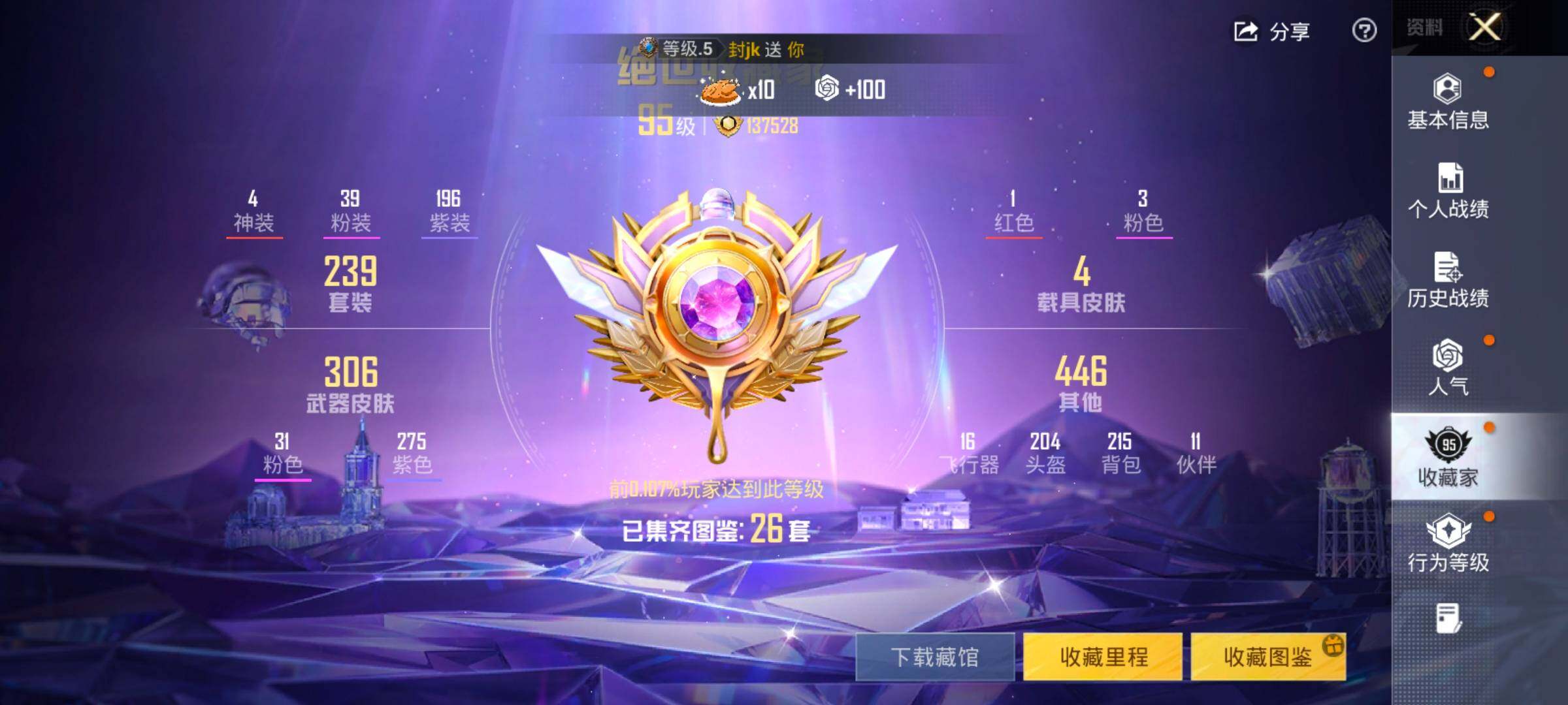 4红装3稀有3载具39粉装30特效枪13热门239套装324枪皮 19印记 历史无敌战神