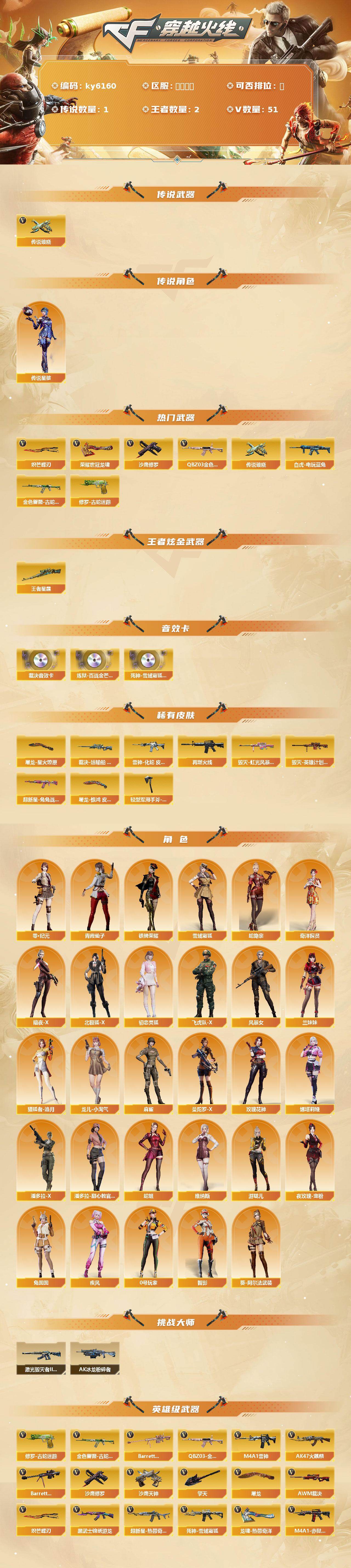 【ky6160】广东一区-46V-2王者武器数-0炫金武器数【传说武器】:传说破晓【传说角色】:传说星骇【热门武器】:传说破晓,QBZ03-金色蔷薇,金色蔷薇-古蛇迷踪,修罗-古蛇迷踪,白虎-电玩蓝兔,沙鹰-修罗,炽芒蝶刃*2,荣耀世冠-龙啸【王者炫金武器】:王者星霆【音效卡】:AWM-裁决音效卡,炼狱-百战金芒-庆典舞曲音效卡,死神-雪域霜狐-怀旧音效卡【皮肤】:裁决-运输船 皮肤,雷神-化蛇 皮肤,M4A1-再燃火线,毁灭-虹光风暴 皮肤,毁灭-英雄计划 皮肤,超新星-兔兔战士 皮肤,屠龙-