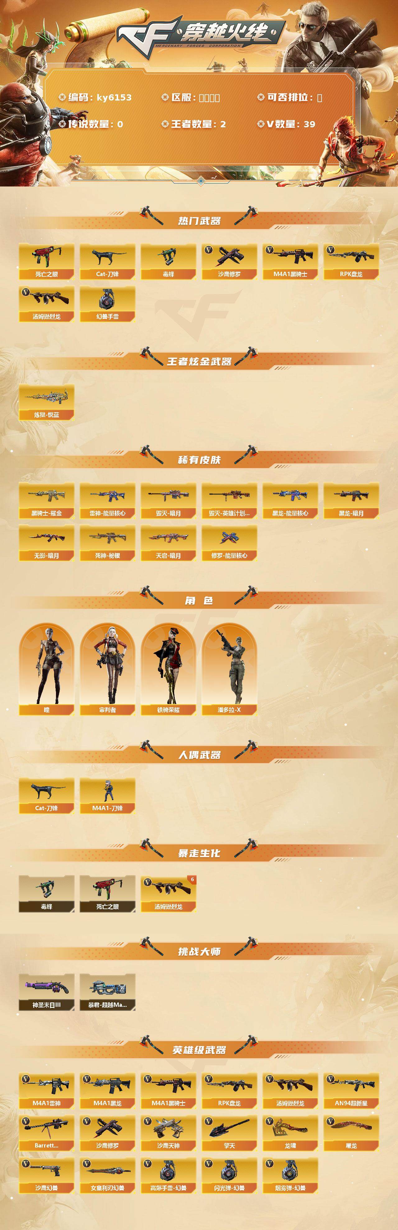 【ky6153】山东二区-40V-2王者武器数-0炫金武器数【热门武器】:死亡之眼,Cat-刀锋,毒蜂,M4A1-黑骑士,汤姆逊-烈龙*6,RPK-盘龙,沙鹰-修罗*2,高爆手雷-幻兽*2【王者炫金武器】:炼狱-悦蓝*2【皮肤】:雷神-能量核心,毁灭-暗月*2,毁灭-英雄计划 皮肤,黑龙-能量核心,黑龙-暗月,黑骑士耀金皮肤,无影-暗月,死神-秘银,天启-暗月*2,修罗-能量核心*2【角色】:瞳,审判者,潘多拉-X,铁骑荣耀【人偶武器】:Cat-刀锋,M4A1-刀锋【暴走生化】:毒蜂,死亡之眼【