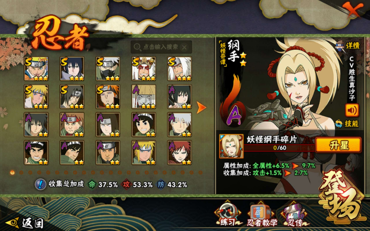 【S级忍者】旗木卡卡西「须佐能乎」(3星),自来也「传说中的三忍」(3星),宇智波佐助「永恒万花筒」(3星),自来也「舞之豪杰」(3星),宇智波鼬「须佐能乎」(3星),漩涡鸣人·宇智波佐助(3星),佩恩「天道」(3星),波风水门(3星),