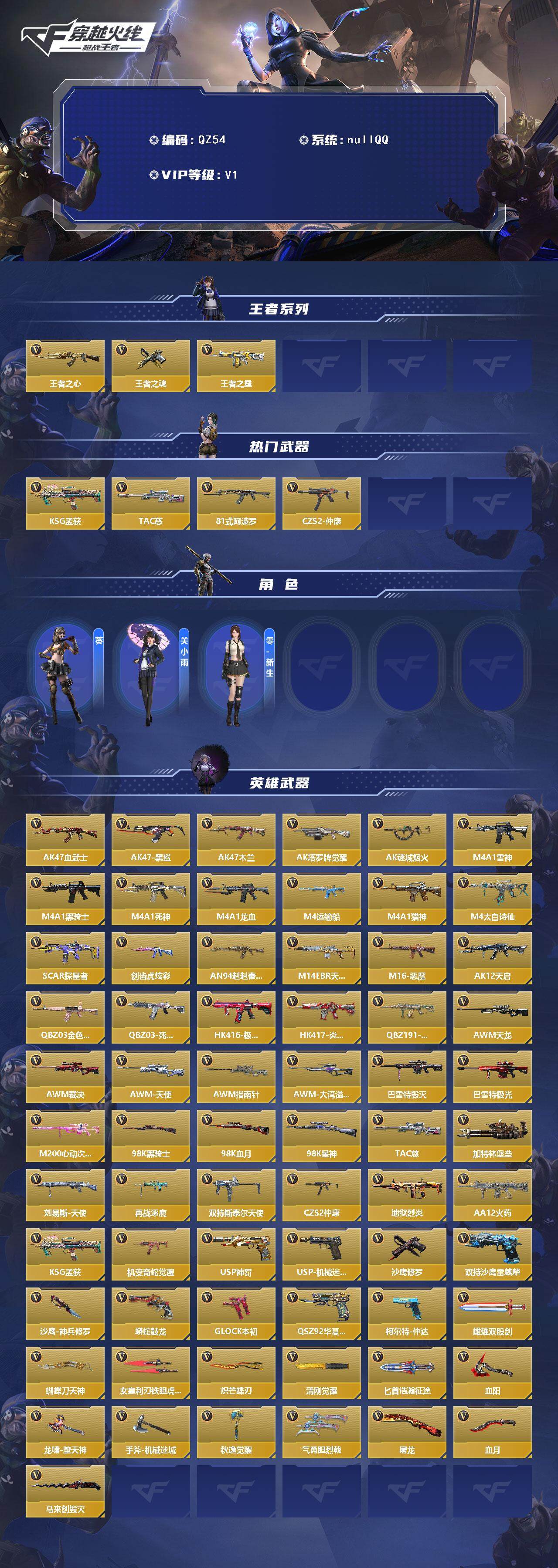 【英雄武器】:AK47-血武士,AK47-黑鲨,AK47-木兰,AK47-塔罗牌觉醒,AK47-谜城烟火,M4A1-雷神,M4A1-黑骑士,M4A1-死神,M4A1-龙血,M4A1-运输船,M4A1-猎神,M4A1-太