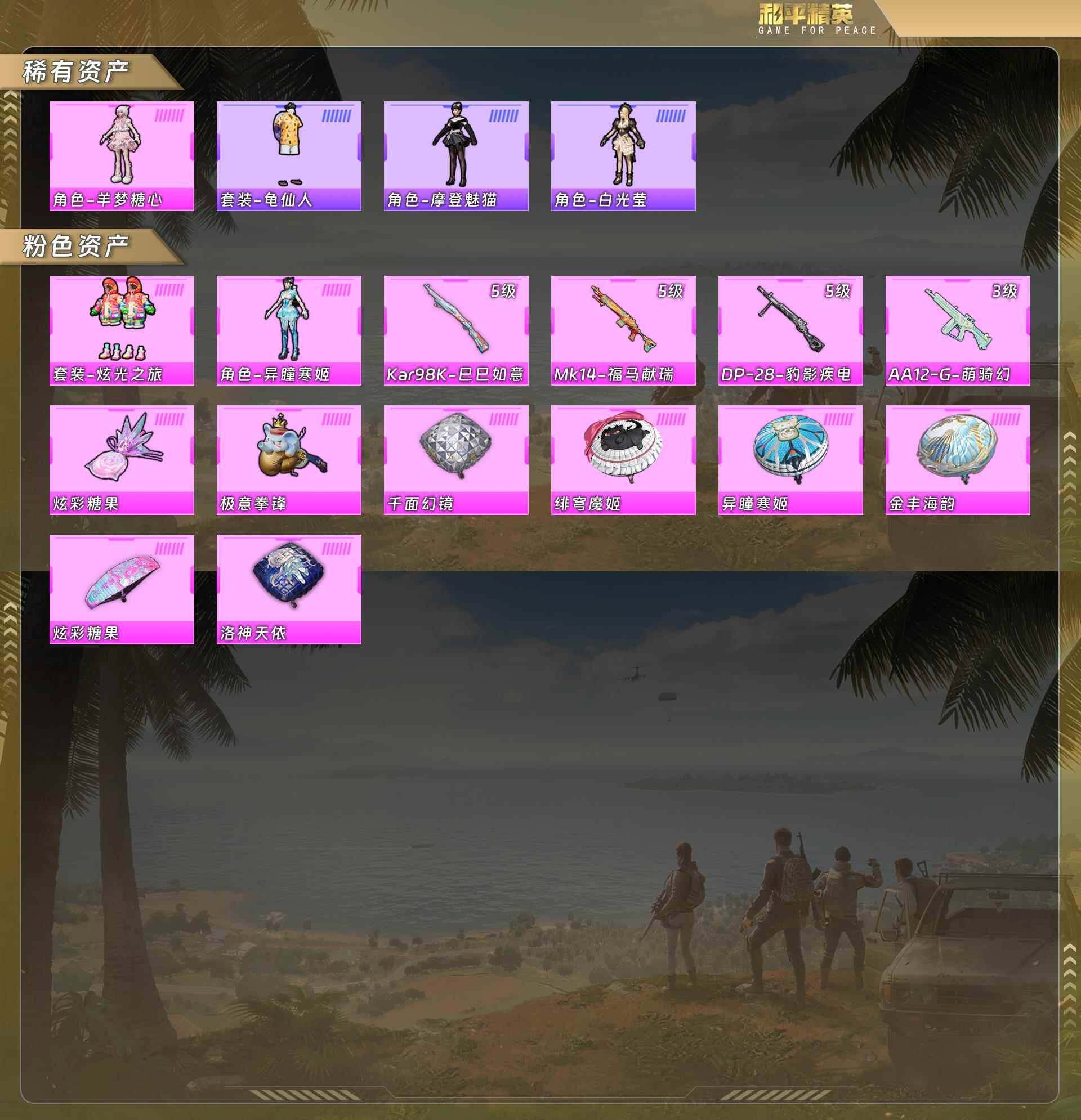 【粉色枪皮】:Kar98K-巳巳如意,Mk14-福马献瑞,AA12-G-萌骑幻想,DP-28-豹影疾电