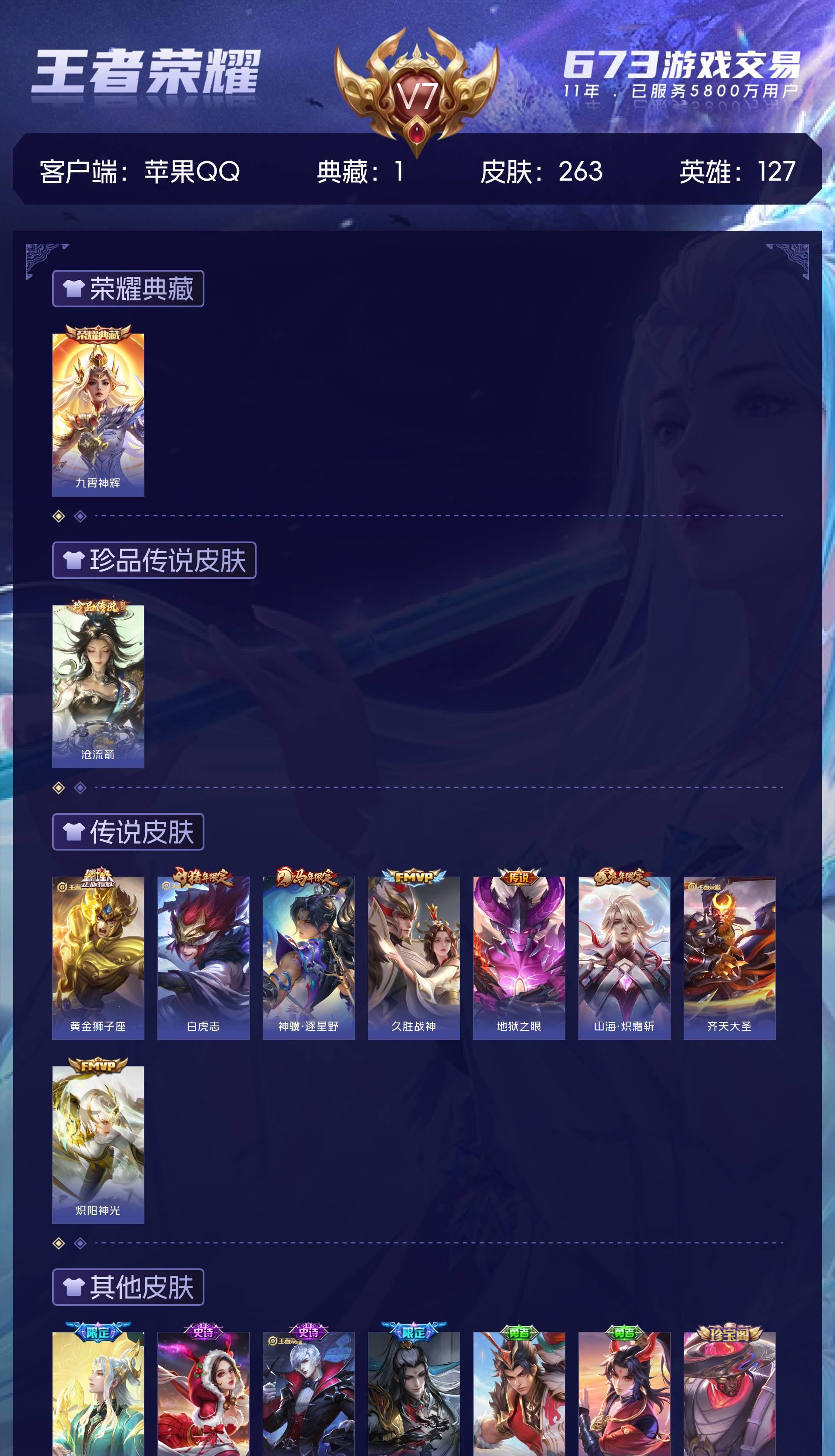 苹果QQ/最强王者/263皮肤/127英雄/1典藏/0珍品无双/0无双/1珍品传说/7传说/79史诗