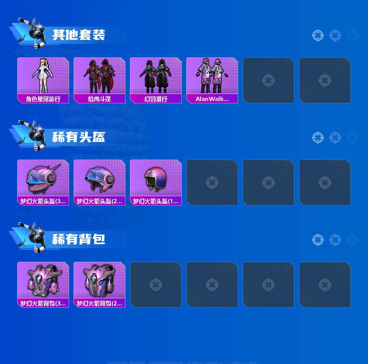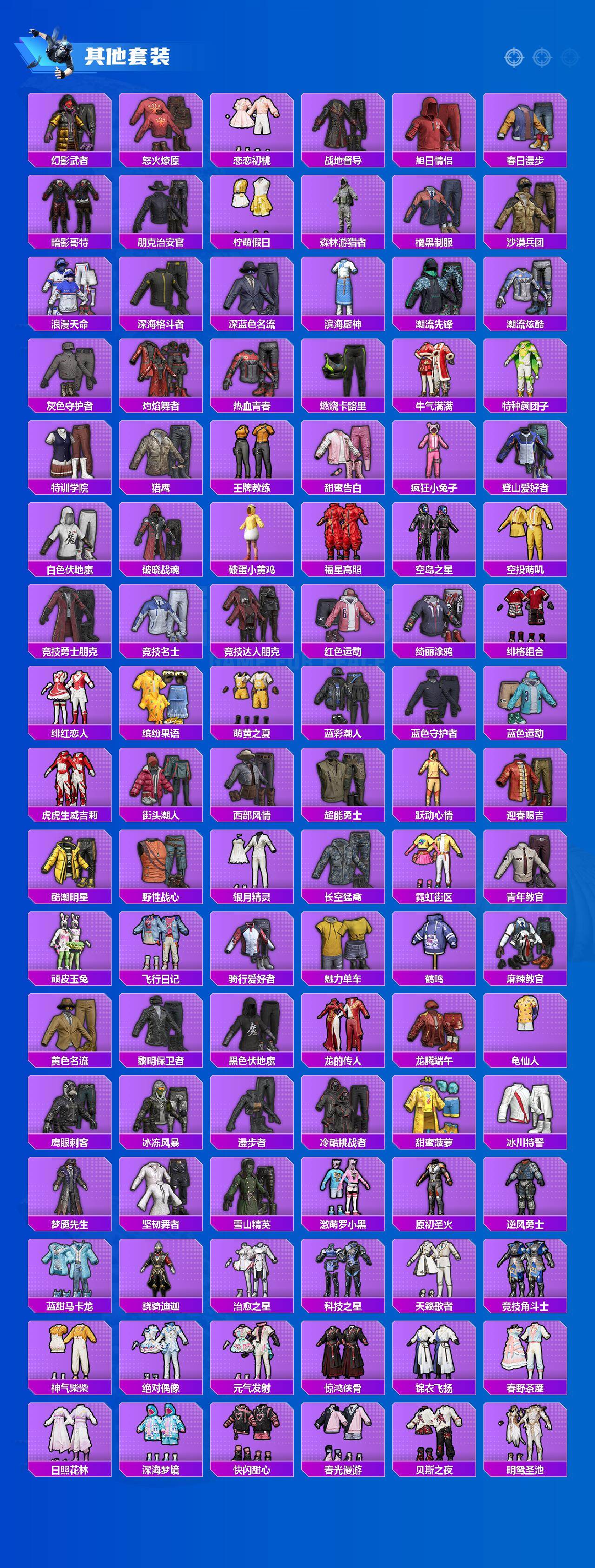 【粉色套装】:角色-绝对恒星,粉装-未来战士,粉装-金曜白虎,粉装-梦幻火箭,粉装-金属狂野,粉装-绚金战神,粉装-未来歌姬,角色-圣堂之誓,粉装-星穹咏叹调,角色-宁雨蝶,角色-奇迹舞步 美雪