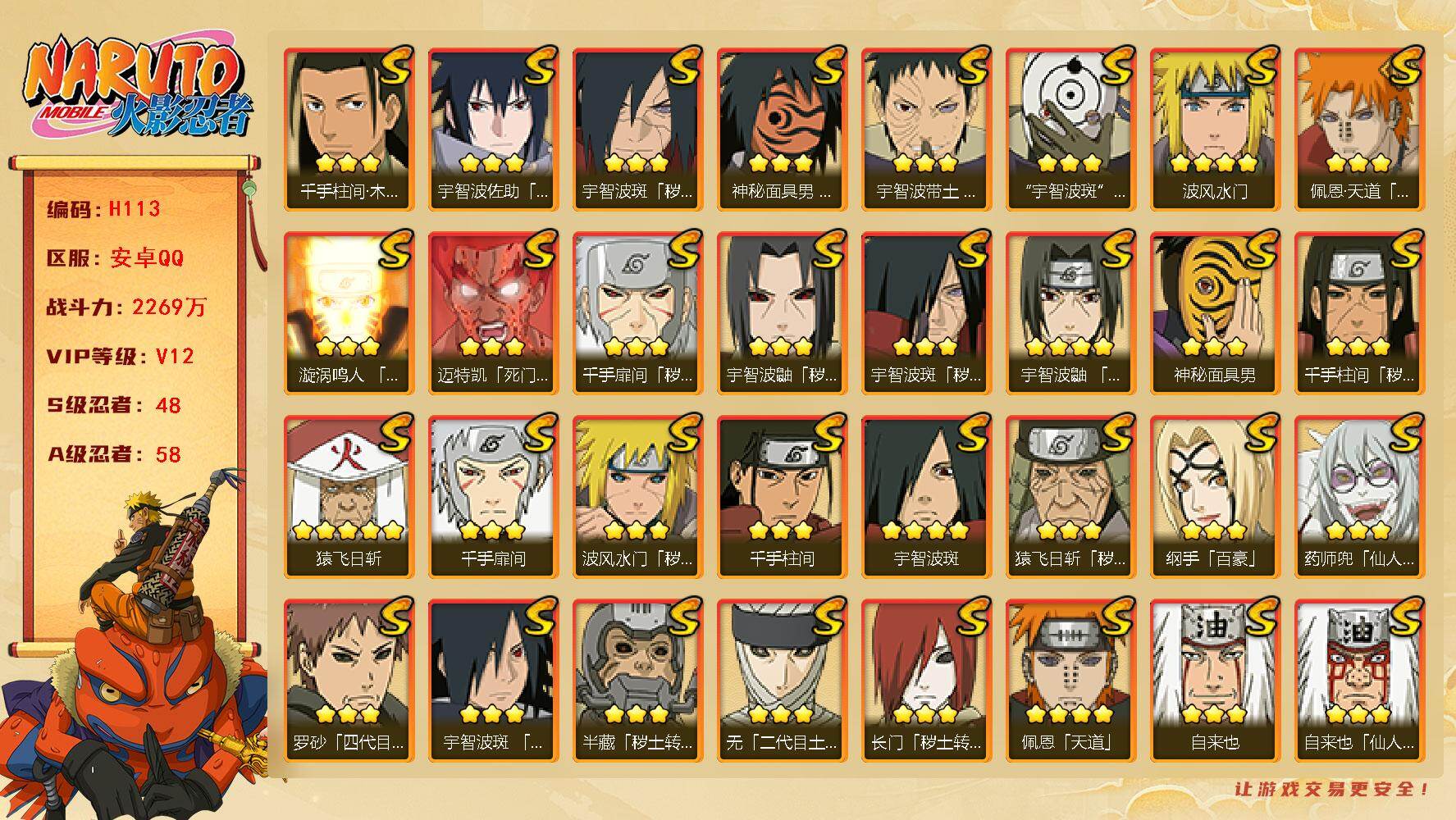 48S级忍者数-58A级忍者数【S级忍者】:长门「秽土转生」(3星),半藏「秽土转生」(3星),金角·银角「秽土转生」(3星),猿飞日斩「秽土转生」(3星),波风水门「秽土转生」(3星),千手扉间「秽土转生」(3星),千手柱间「秽土转生」(3星),宇智波鼬「秽土转生」(3星),宇智波斑「秽土转生」(3星),宇智波斑「秽土转生·解」(3星),大野木「忍界大战」(3星),春野樱「忍界大战」(3星),宇智波带土「忍界大战」(3星),艾「忍界大战」(3星),宇智波鼬「须佐能乎」(4星),旗木卡卡西「须佐