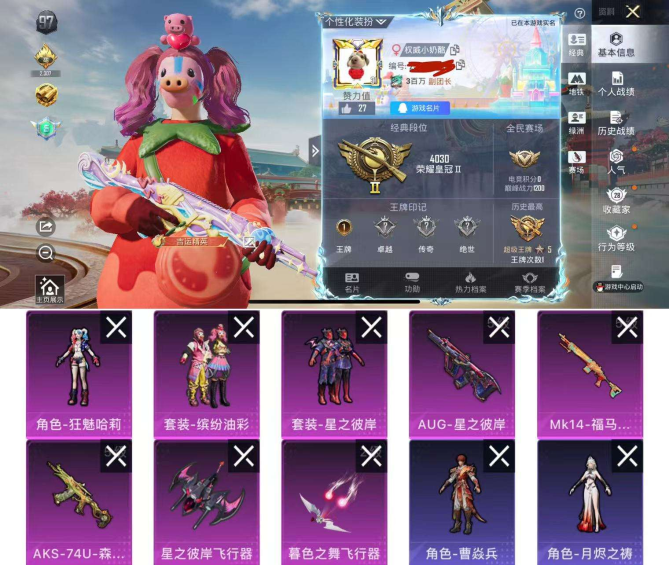 号-小番茄红熊茄茄-狂魅哈莉-缤纷油彩-星之彼岸-AUG-星之彼岸-3粉装4特效枪3飞行器2角色】可二次 苹果Q-3粉装4特效枪2热门24套装40枪皮 12984热力值 1印记 历史超级王牌5星 【3粉装】 狂魅哈莉 缤纷油彩 星之彼岸 【4特效枪】 AKS-74U-森灵之息 (5级) AUG-星之彼岸 (5级) AKS-74U-森灵之息 (5级) Mk14-福马献瑞 (5级)