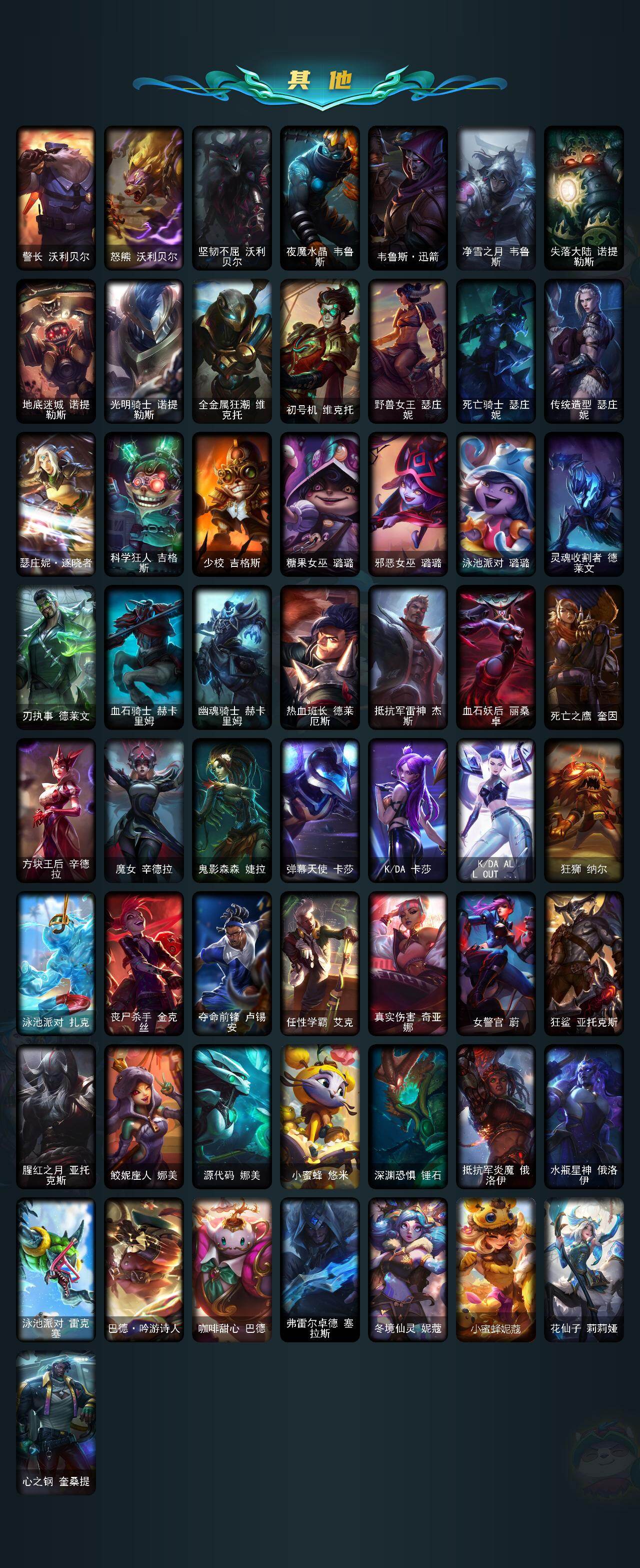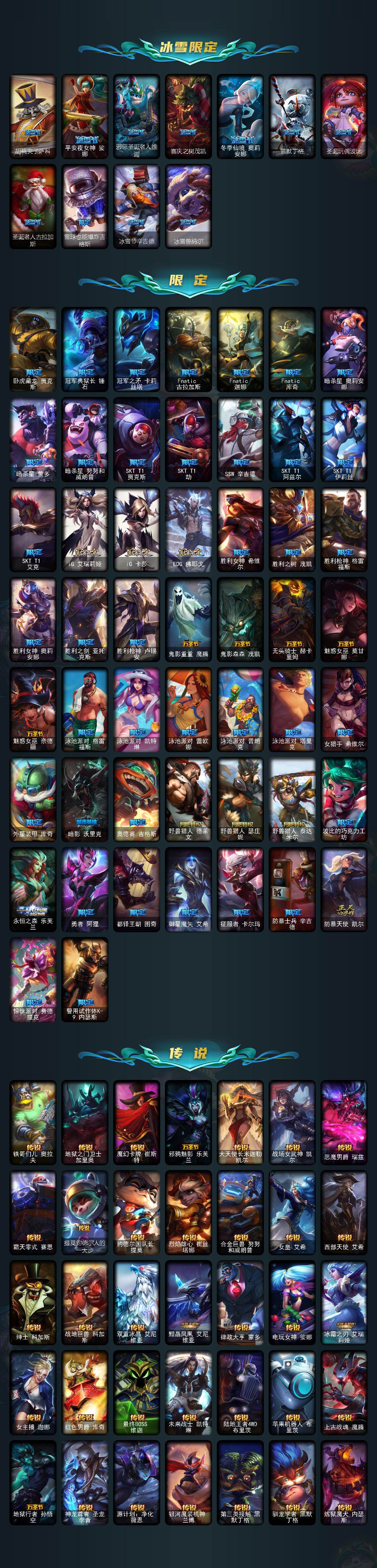 【神话皮肤】:十周年纪念安妮,源代码乐芙兰,神凰行者瑞羽圣凰艾尼维亚,海克斯科技安妮,海克斯科技卡萨丁,海克斯科技雷克顿,摄魂使者薇恩,至臻真实伤害亚索,至臻奥术师佐伊,至臻电玩女神凯特琳,至臻海之歌萨勒芬妮,至臻KDA阿卡丽,至臻KDA阿卡丽2022,至臻烈焰美人薇恩,至臻烈焰美人薇恩2022,至臻灵魂莲华易,至臻绒毛菲兹,至臻绒毛菲兹2022,至臻心之钢永恩,至臻玉剑传说武剑仙,至臻