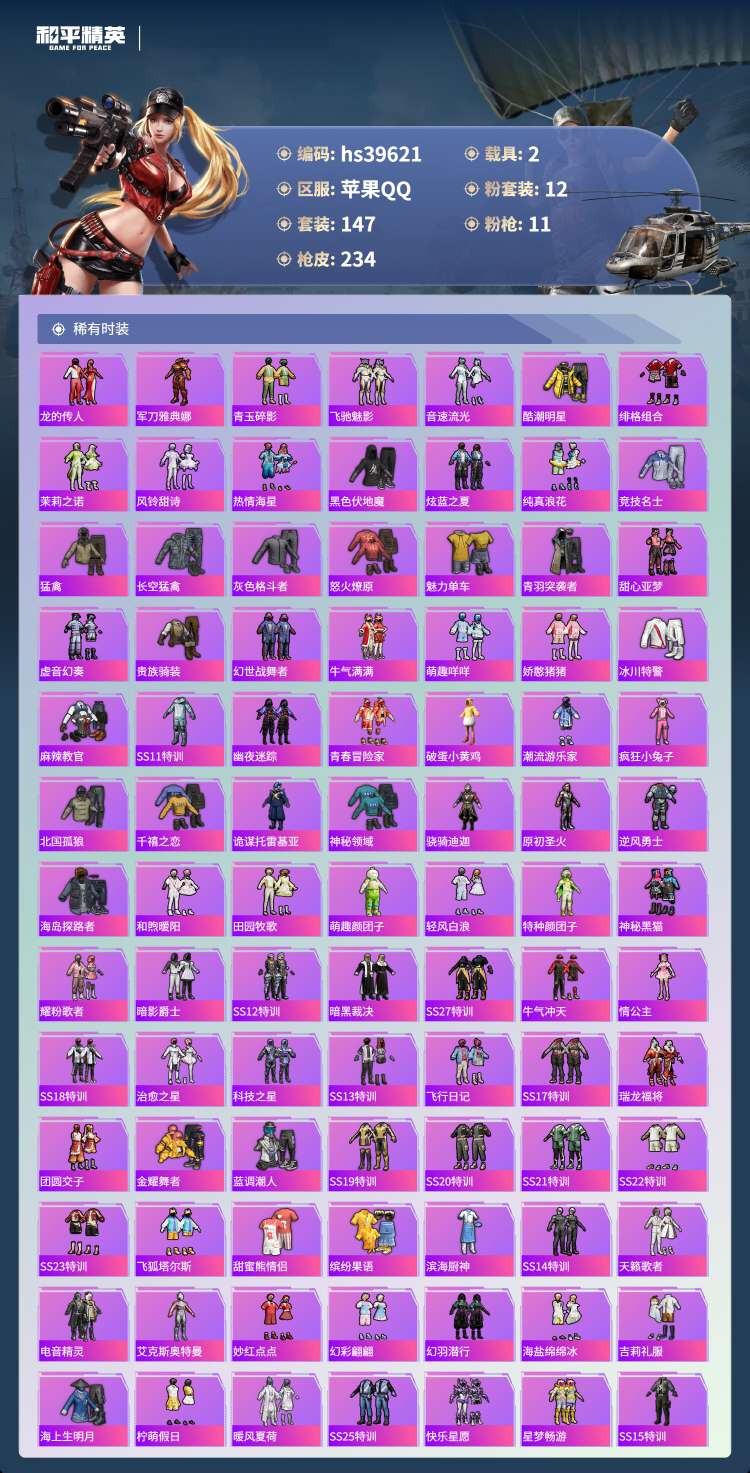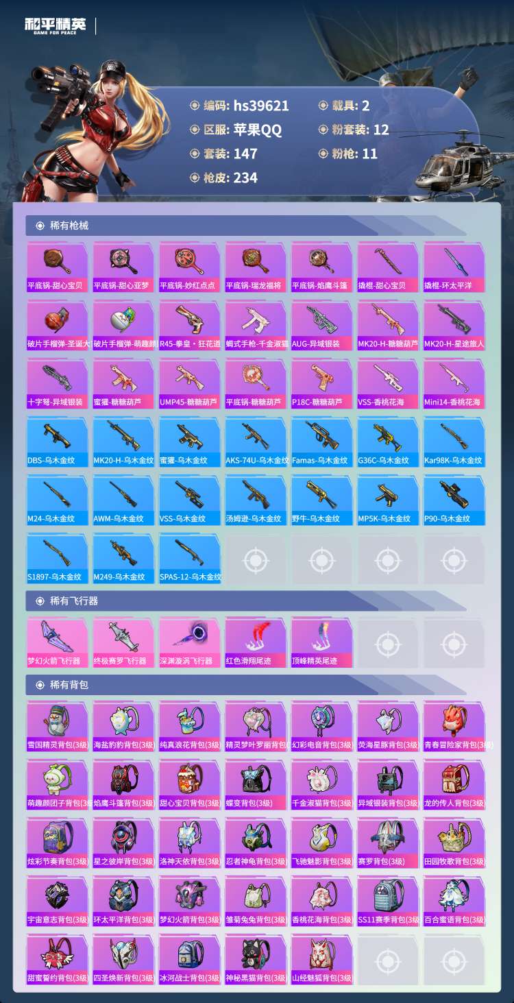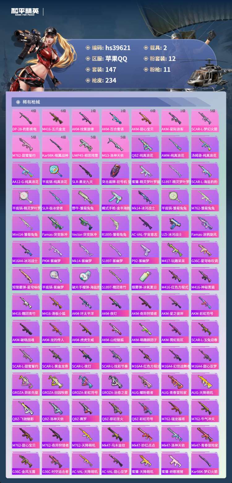 hs39621 苹果手Q-15王牌印记-1红装-12粉装-11特效枪-2载具-82095热力值-14