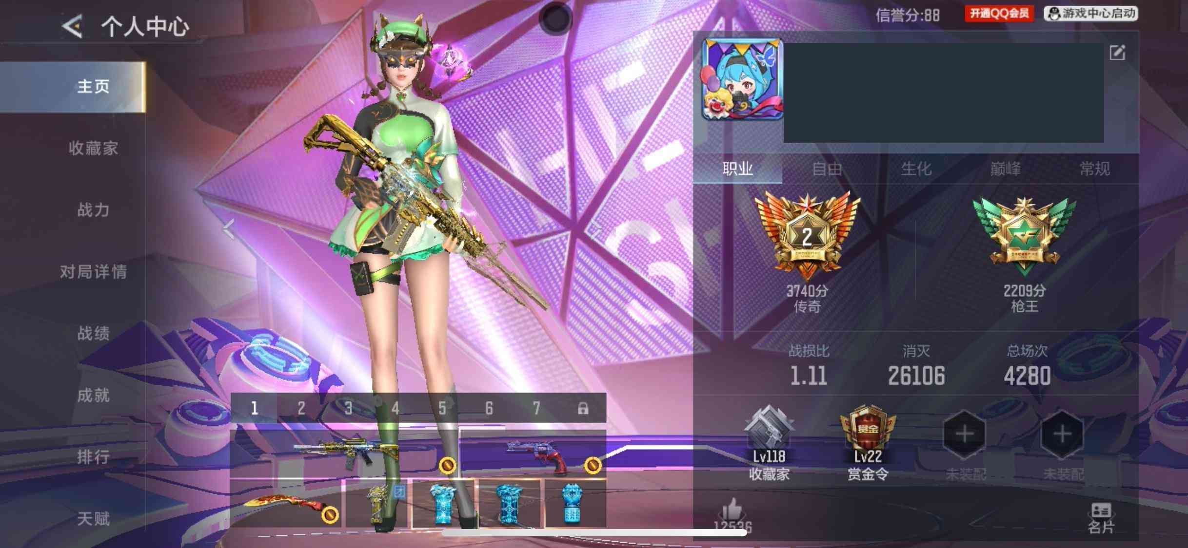 【苹果QQ】 角色等级:巅峰大元首 【角色】关小雨、雾萌萌、晴雅、岚兮儿、樱、职场灵狐-赛事经理、葵、月神-X、夏日灵狐-X、炽天使-X、龙妹-X 【武器】王者之霆、王者之戮、王者之影、王者之心、王者之神、王者之狱、王者之迹、AK47-奉先、AK47-常胜、TAC-慈、蟒蛇-奉先、柯尔特-仲达、USP-仁德、M200-幻神、AWM-天龙、巴雷特-极光、98K-黑骑士、暗杀神、M4A1-七色宝葫、M4A1-雷神、M4A1-太白诗仙、M4A1-游骑兵、AA12-雷神、CBJ-MS-毒蜂、MK47-机