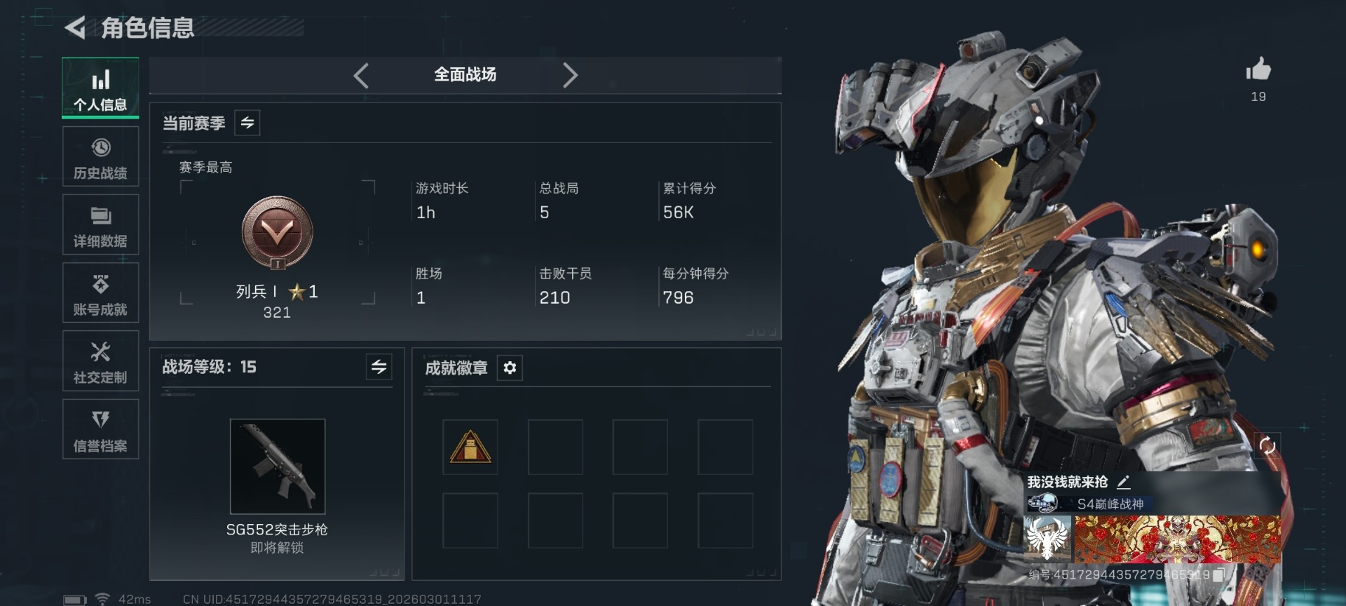 [17323320]总资产:58.7M 1干员外观 13传说枪械 哈夫币:924.923K 不可修改实名