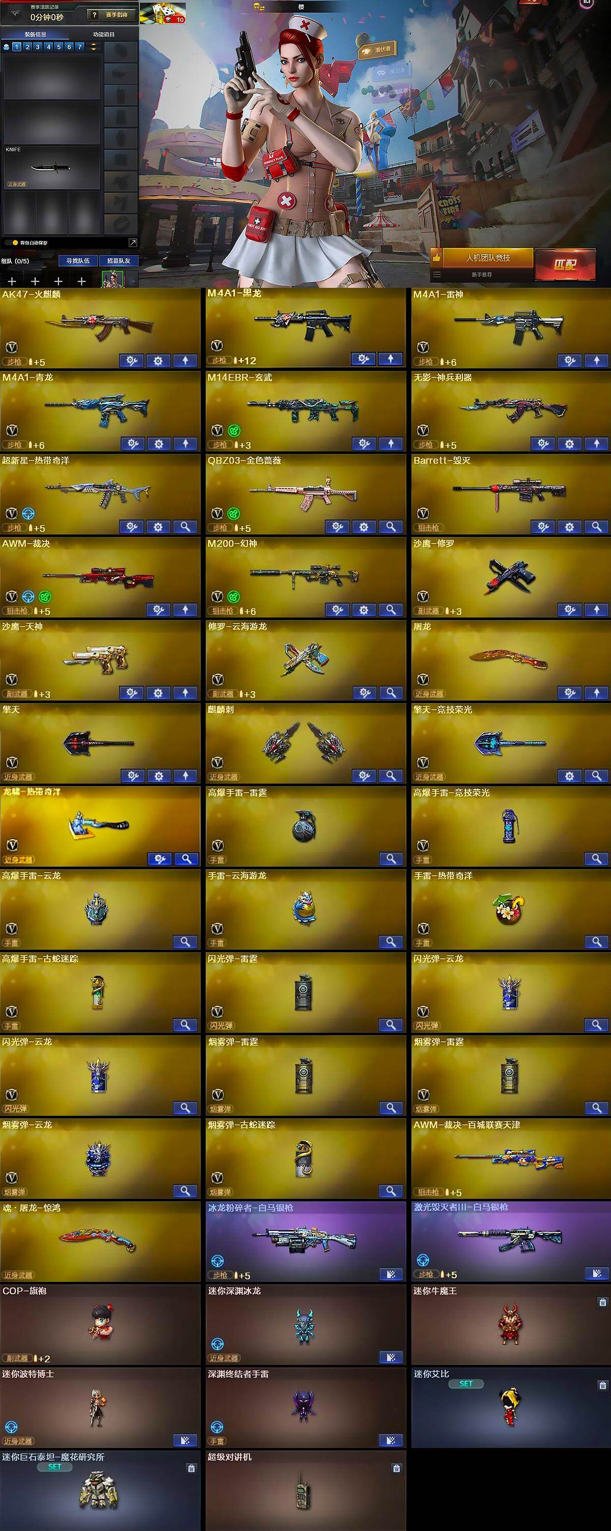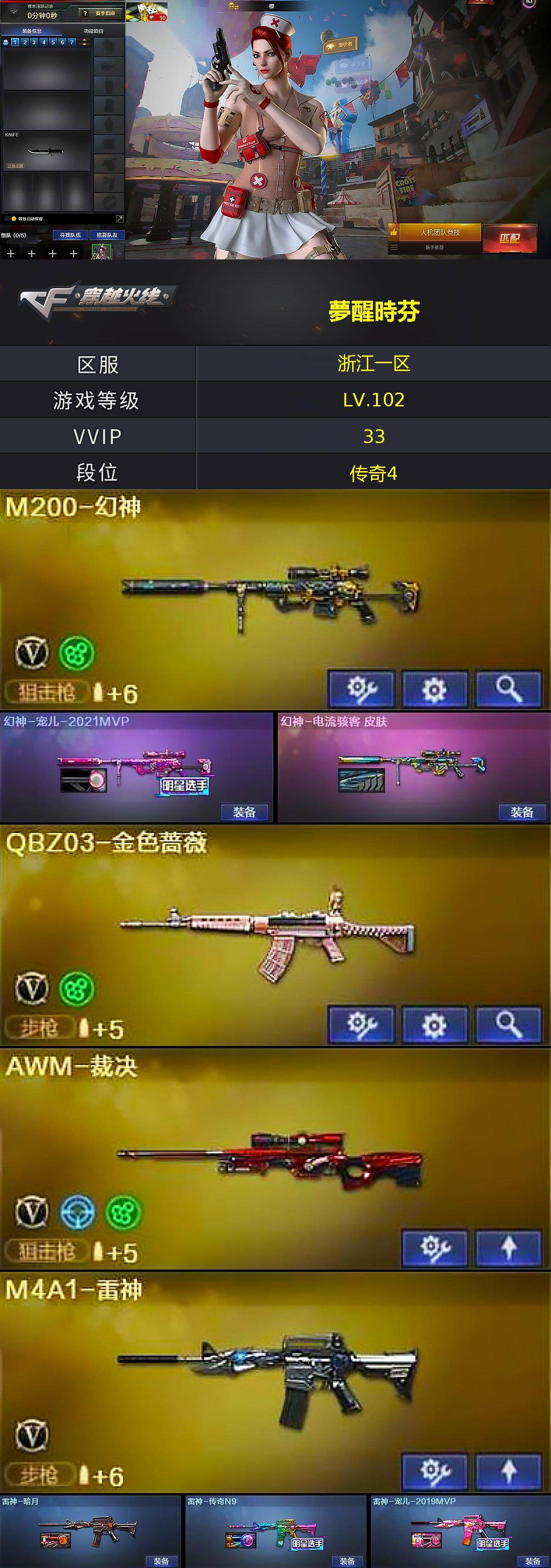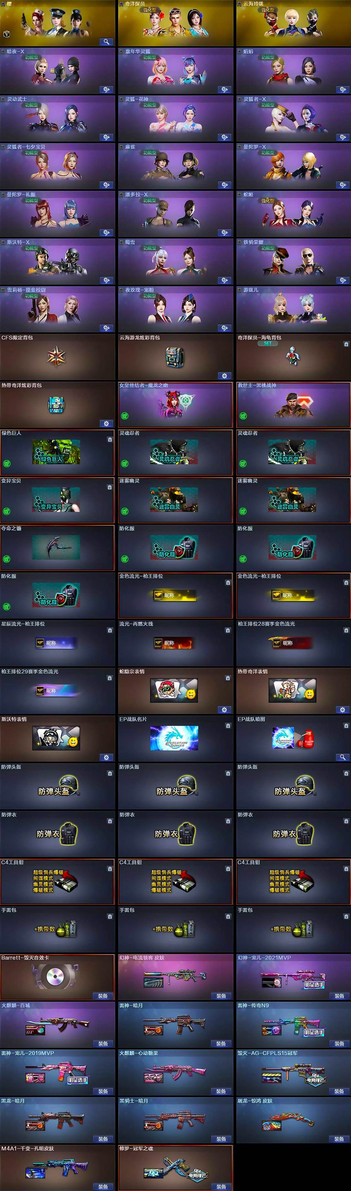 【皮肤】:幻神-宠儿-2021MVP,幻神-电流骇客 皮肤,雷神-暗月,雷神-传奇N9,雷神-宠儿-2019MVP,火麒麟-百城,火麒麟-心动糖果,毁灭-AG-CFPLS15冠军,M4A1-千变-孔明皮肤,黑龙-暗月,黑骑士-暗月,修罗-冠军之魂,屠龙-惊鸿 皮肤