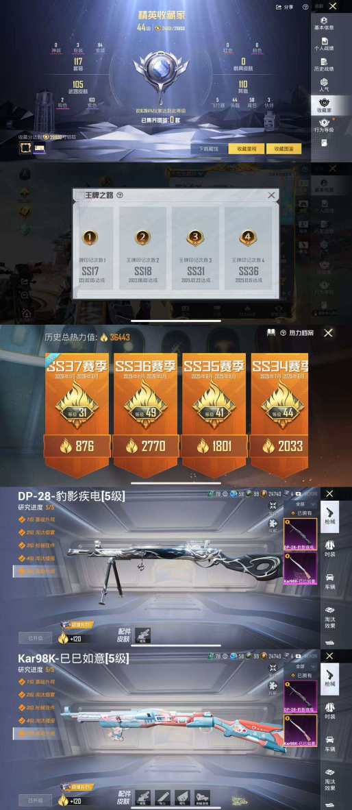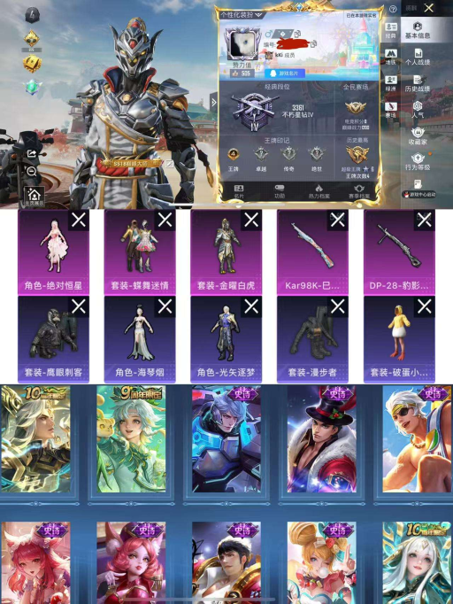 鸡王者连体号-117套装121枪皮36443热力值3粉装2特效枪地铁48点满天赋-王者111皮肤2传说】111皮肤2传说24史诗33限定(吃鸡王者)一体号-可二次 苹果Q-1稀有3粉装2特效枪9热门117套装121枪皮 36443热力值 4印记 历史超级王牌6星 【1稀有】 AWM-黄金龙骨 【3粉装】 蝶舞迷情 金曜白虎 绝对恒星 【2特效枪】 Kar98K-巳巳如意 (5级