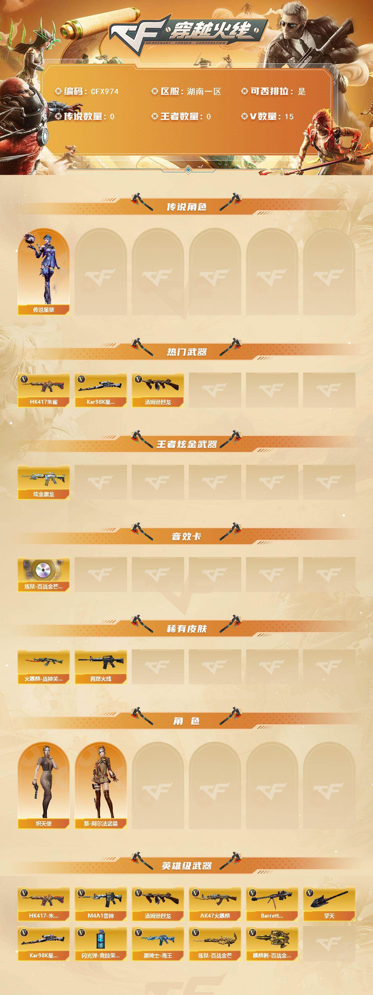 【CFX974】14V/83级/将帅/1炫金/1英雄/传说星骇/HK417_朱雀/98K_星神/汤姆逊烈龙/炫金黑龙/炼狱-百战金芒-庆典舞曲音效卡/M4A1-再燃火线/火麒麟-战神关羽/葵-阿尔法武装/炽天使/AK47火麒麟/M4A1_雷神/HK417-朱雀/黑骑士-海王/机械迷城-穹宇/Barrett-毁灭/炼狱-百战金芒/擎天/麒麟刺-百战金芒/闪光弹-竞技荣光/云山科技背包/百战金芒炫彩背包/绿色巨人/灵魂忍者/妖姬/迷雾幽灵/夺命之镰/防化服/枪王排位29赛季金色流光/语音特效-盛典烟