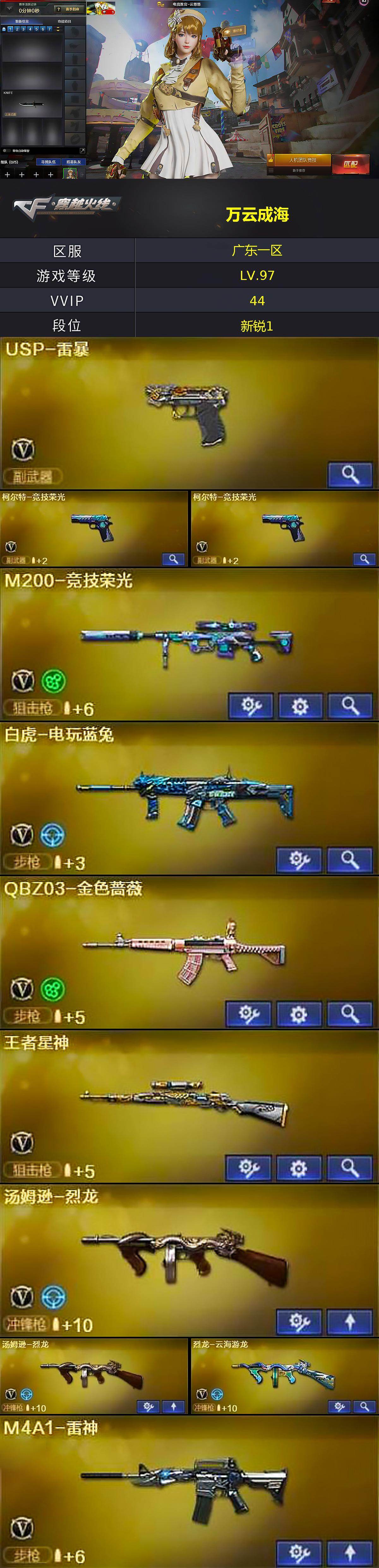 【热门武器】:QBZ03-金色蔷薇,M14EBR-玄武,M200-竞技荣光,白虎-电玩蓝兔,汤姆逊-烈龙*2,USP-雷暴,沙鹰-修罗*2