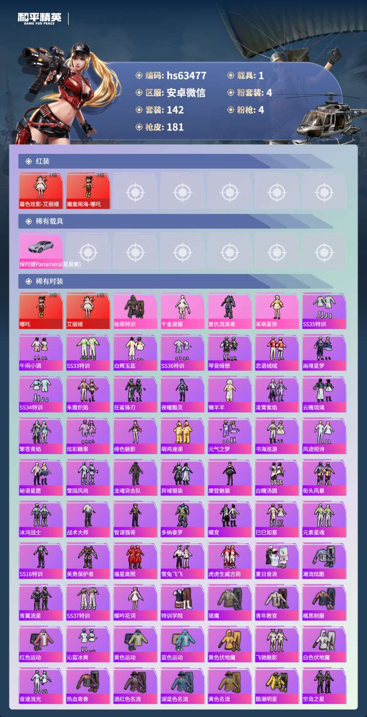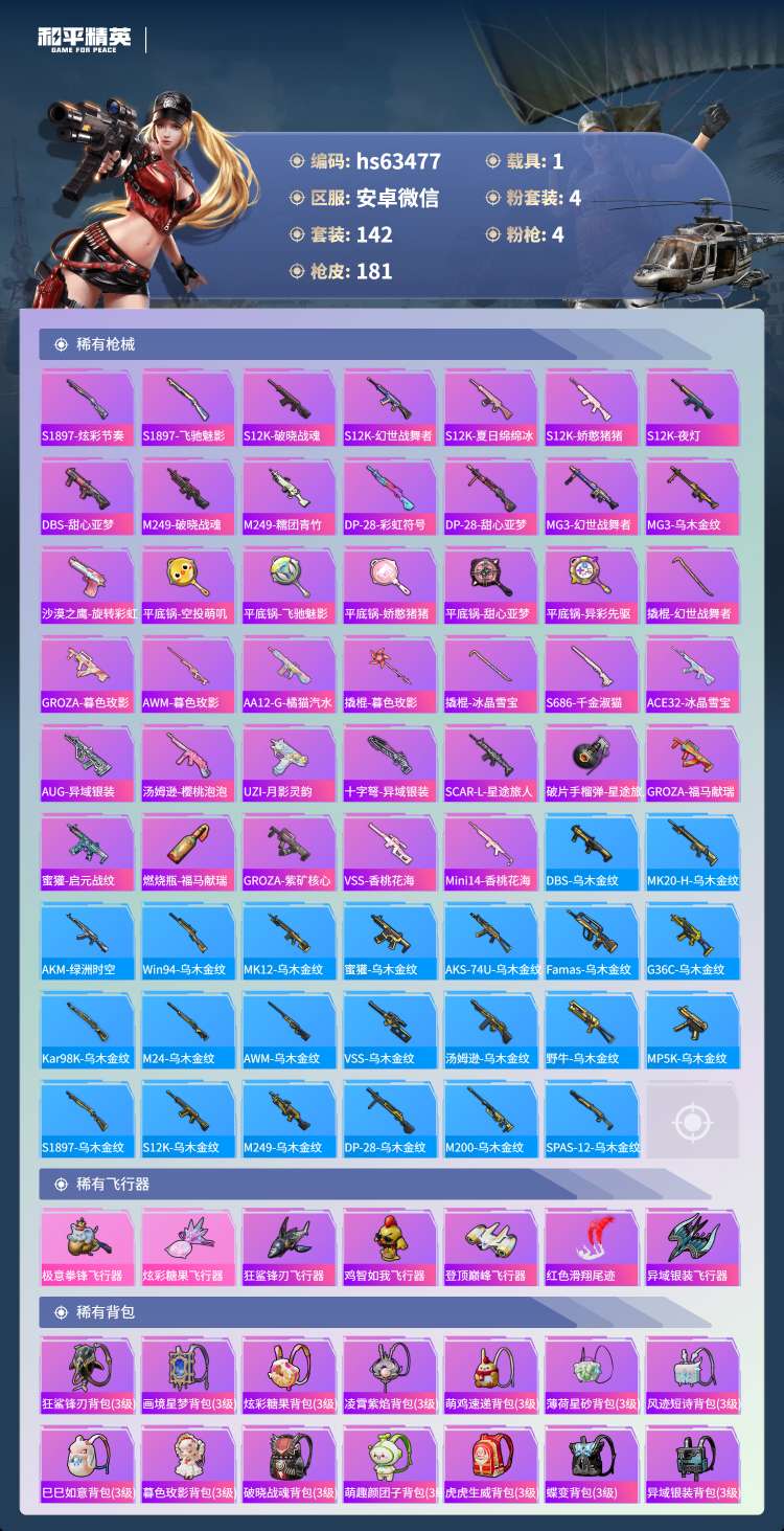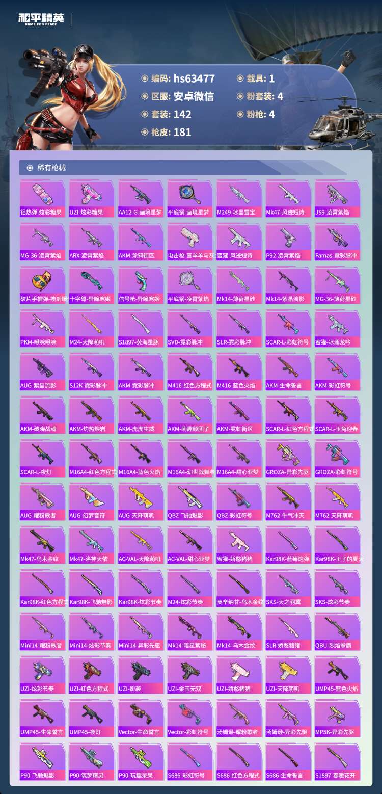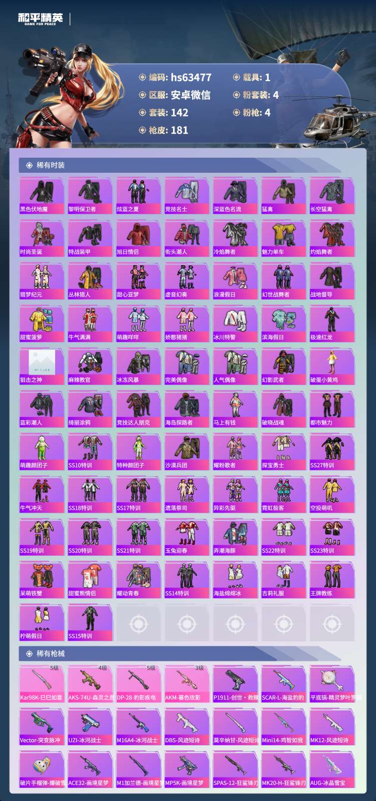 hs63477 安卓微-8王牌印记-2红装-4粉装-4特效枪-1载具-61847热力值-142套装