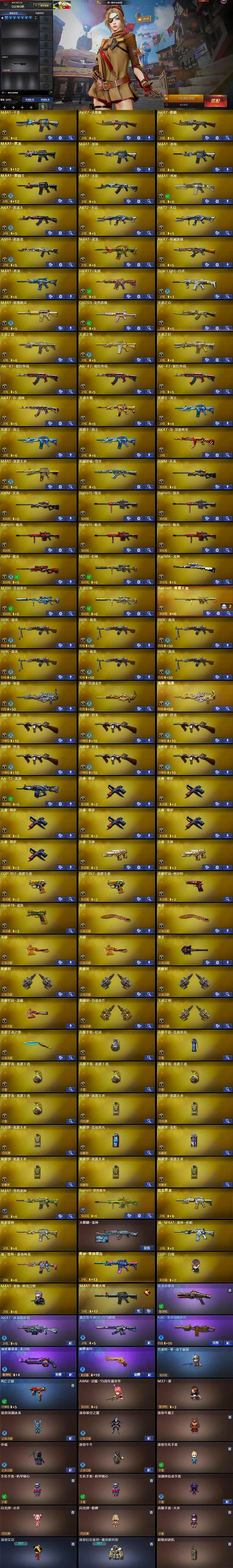 【热门武器】:QBZ03-金色蔷薇,Scar Light-白虎,HK417-朱雀,M4A1-青龙,M200-幻神,M200-竞技荣光,死亡之眼,荣耀世冠-柯尔特,Kar98K-星神,M4A1-黑骑士,汤姆逊-烈龙*6,RPK-盘龙*6,加特林-炼狱,COP-白鲨,沙鹰-修罗*6,荣耀世冠-龙啸,金刚伞