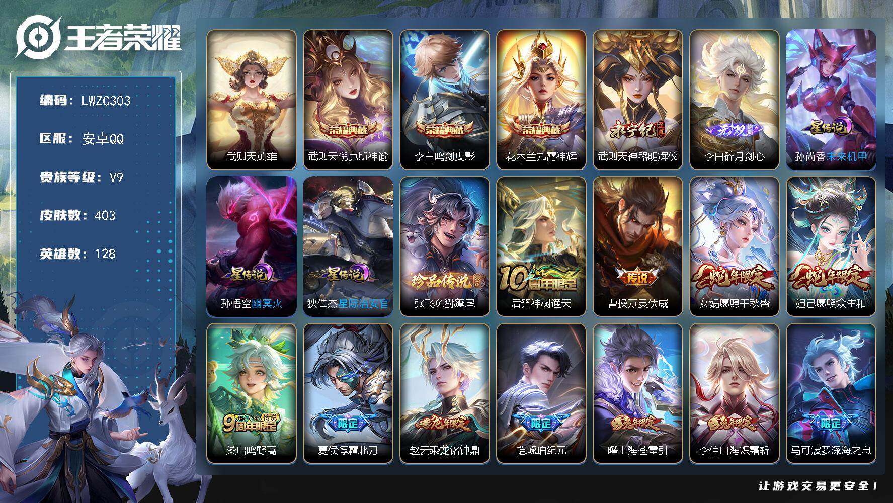 【特价出售/店主推荐 万战武则天】安卓Q-V9-最强王者段位-128英雄-403皮肤-3典藏皮肤-1典藏英雄-2无双-1珍品传说-37传说-3星传说-121史诗【英雄全皮】:阿轲全皮,武则天全皮,孙权全皮,狂铁全皮,猪八戒全皮,影全皮【荣耀典藏】:武则天英雄,武则天倪克斯神谕,李白鸣剑曳影,花木兰九霄神辉【无双皮肤】:武则天神器明辉仪,李白碎月剑心【珍品传说】:张飞兔狲蓬尾【传说皮肤】:后羿神树通天,曹操万灵伏威,女娲愿照千秋盛,妲己愿照众生和,桑启鸣野蒿,夏侯惇霜北刀,赵云乘龙铭钟鼎,铠琥珀纪