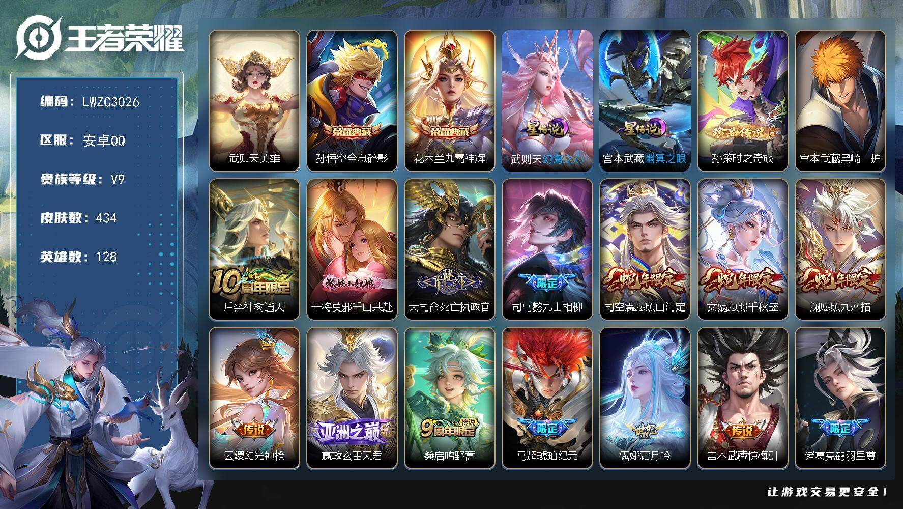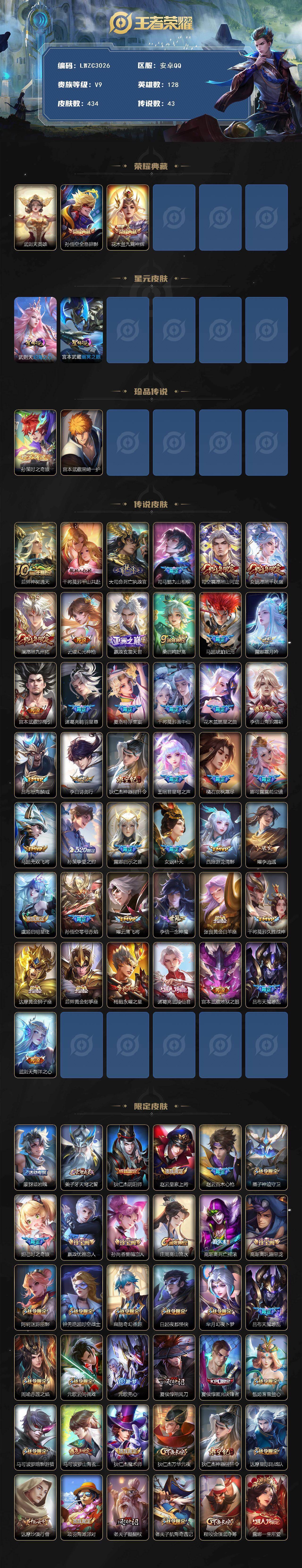 【店主推荐捡漏号!可直接换绑,对抗路26段,2市标】安卓Q-V9-最强王者段位-128英雄-434皮肤-2典藏皮肤-2星传说-1典藏英雄-2珍品传说-43传说-135史诗【英雄全皮】:刘禅全皮,高渐离全皮,宫本武藏全皮,达摩全皮,司马懿全皮,露娜全皮,孙权全皮,橘右京全皮,苍全皮,干将莫邪全皮,雅典娜全皮,沈梦溪全皮,猪八戒全皮,敖隐全皮,鲁班大师全皮,蒙恬全皮,夏洛特全皮,司空震全皮,戈娅全皮,空空儿全皮,影全皮【荣耀典藏】:武则天英雄,孙悟空全息碎影,花木兰九霄神辉【珍品传说】:孙策时之奇旅