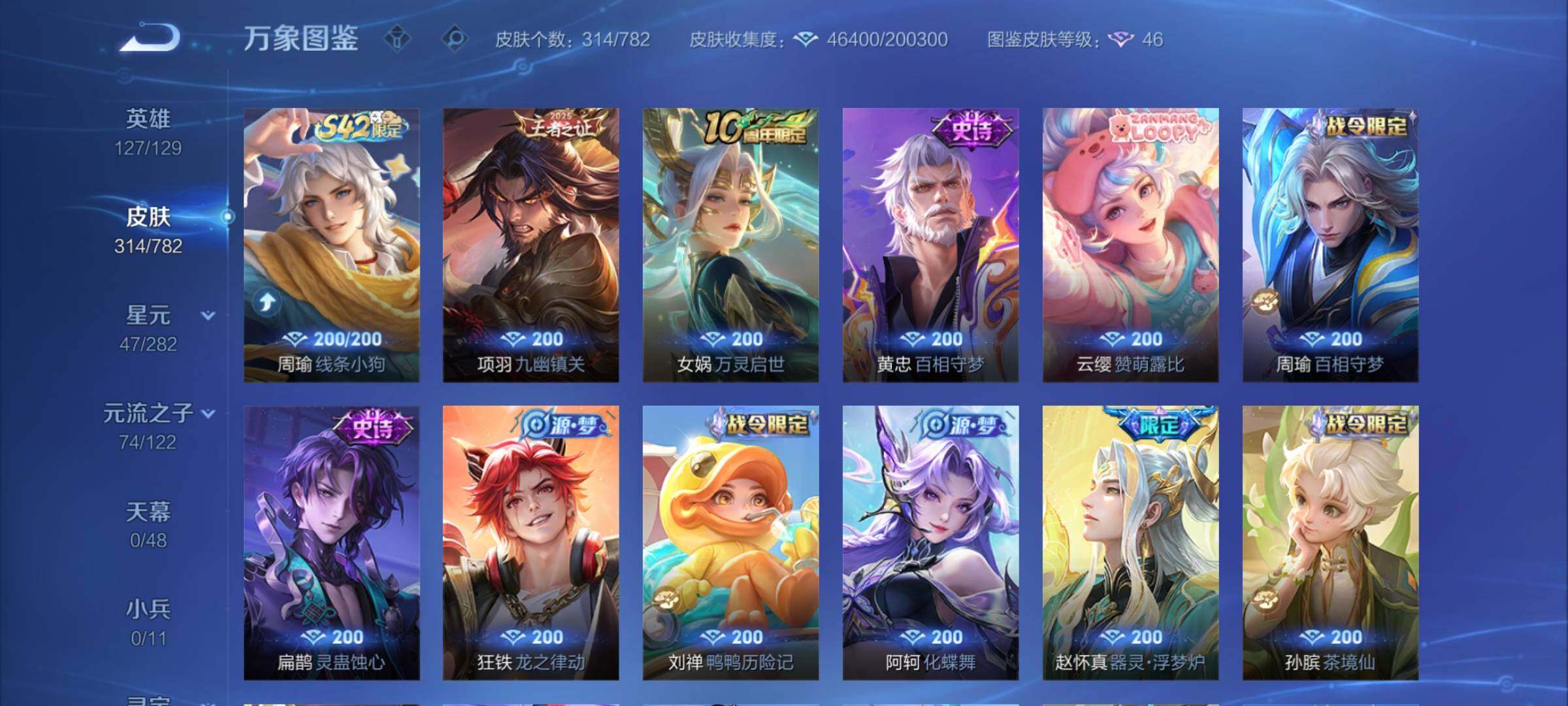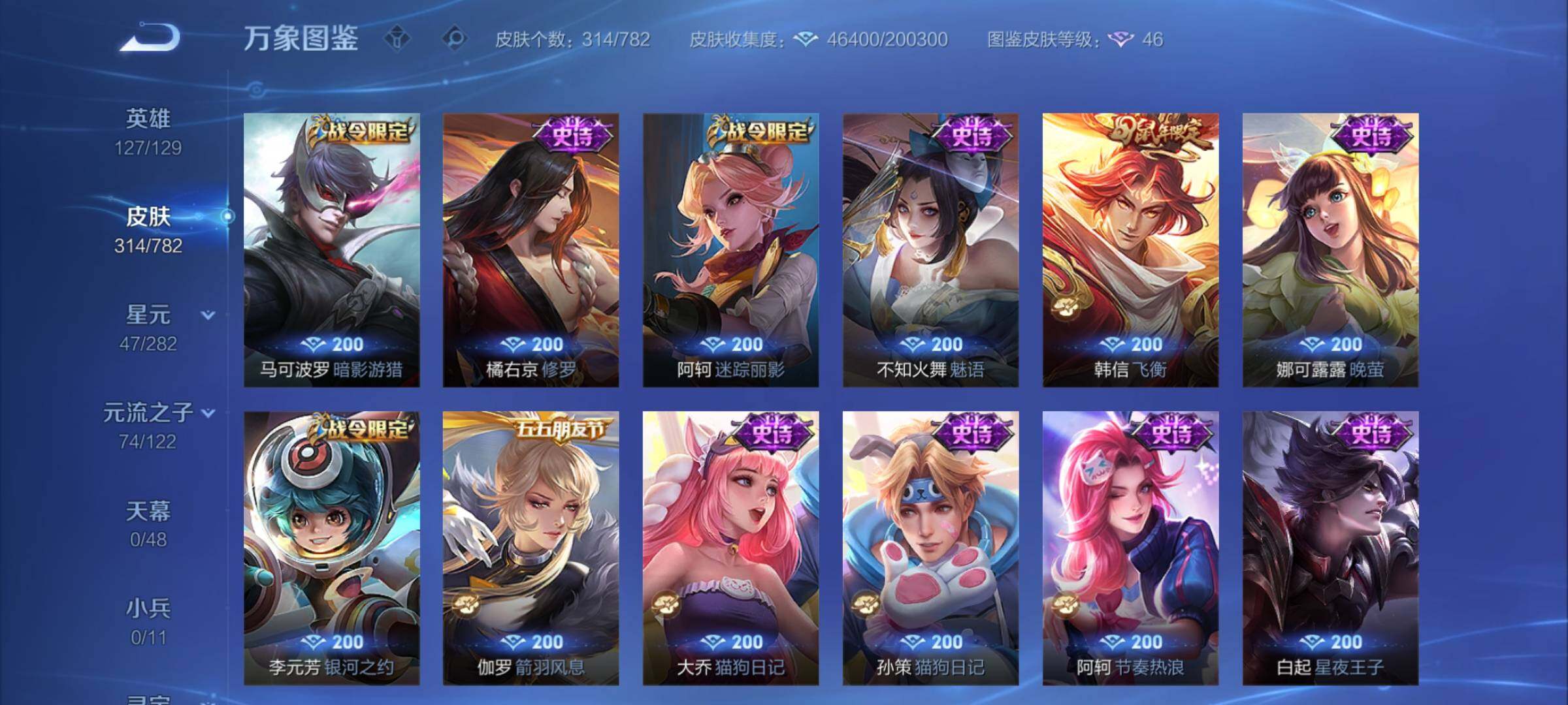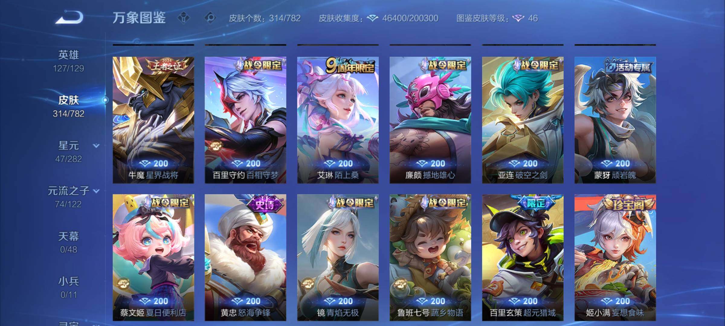 【英雄全皮】:司马懿全皮,孙权全皮,刘备全皮,敖隐全皮,戈娅全皮,空空儿全皮,影全皮【荣耀典藏】:李白鸣剑曳影【星元皮肤】:宫本武藏幽冥之眼,孙悟空幽冥火【传说皮肤】:马超神骥逐星野,后羿神树通天,司马懿九山相柳,澜愿照九州拓,云缨幻光神枪,桑启鸣野蒿,澜逐花归海,夏洛特浮生妄