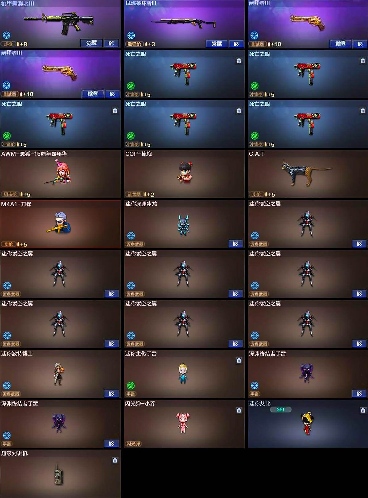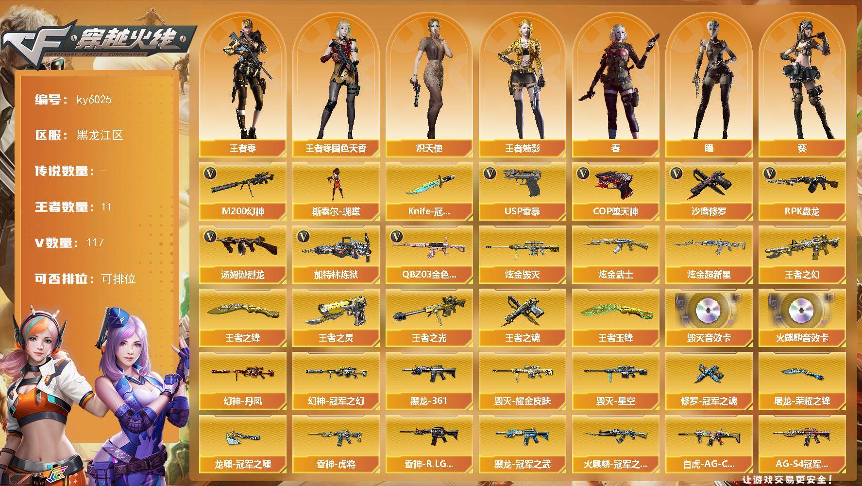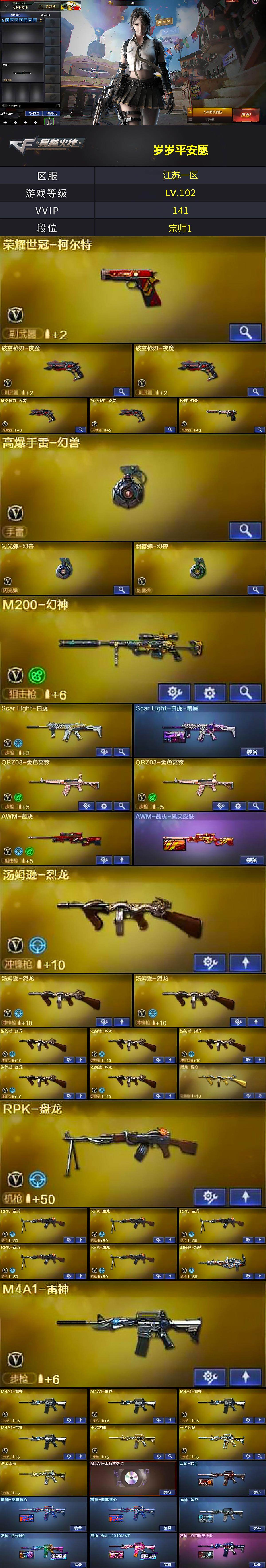【热门武器】:QBZ03-金色蔷薇*2,Scar Light-白虎,M200-幻神,死亡之眼*5,荣耀世冠-柯尔特,C.A.T,M4A1-黑骑士*2,汤姆逊-烈龙*8,RPK-盘龙*6,加特林-炼狱,沙鹰-修罗*13,高爆手雷-幻兽