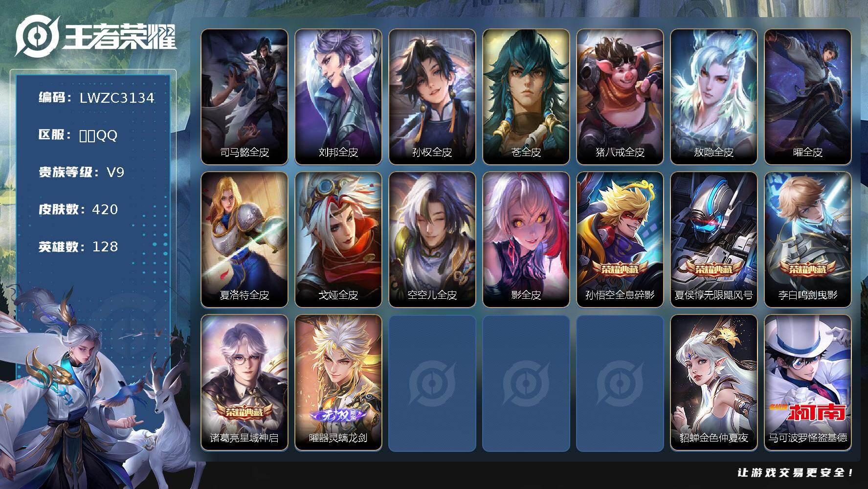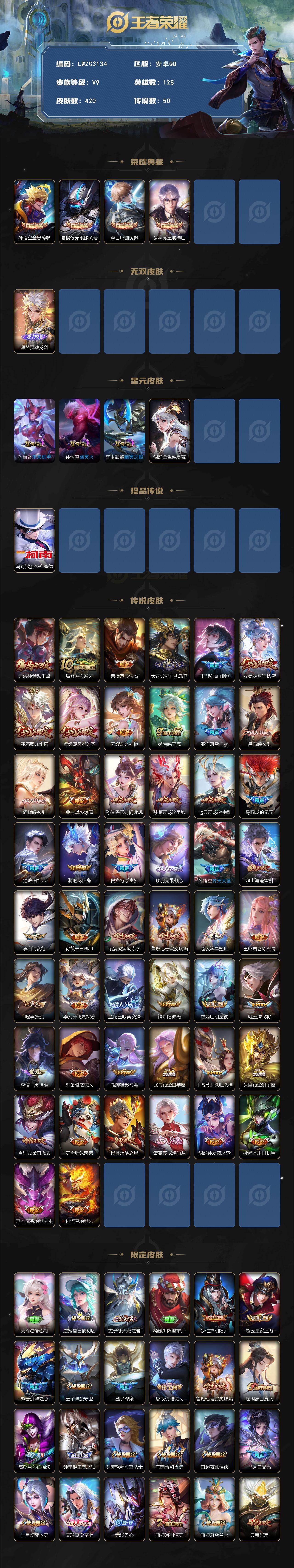 【特价急出/详情看图】安卓Q-V9-最强王者段位-128英雄-420皮肤-4典藏皮肤-1无双-4星元-1珍品传说-50传说-121史诗【英雄全皮】:司马懿全皮,刘邦全皮,孙权全皮,苍全皮,猪八戒全皮,敖隐全皮,曜全皮,夏洛特全皮,戈娅全皮,空空儿全皮,影全皮【荣耀典藏】:孙悟空全息碎影,夏侯惇无限飓风号,李白鸣剑曳影,诸葛亮星域神启【无双皮肤】:曜器灵螭龙剑【珍品传说】:马可波罗怪盗基德【传说皮肤】:云缨神骥越千峰,后羿神树通天,曹操万灵伏威,大司命死亡执政官,司马懿九山相柳,女娲愿照千秋盛,澜