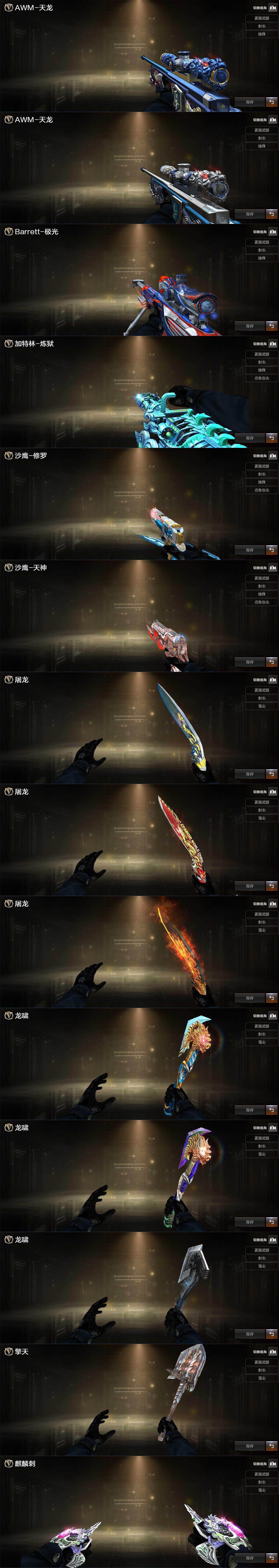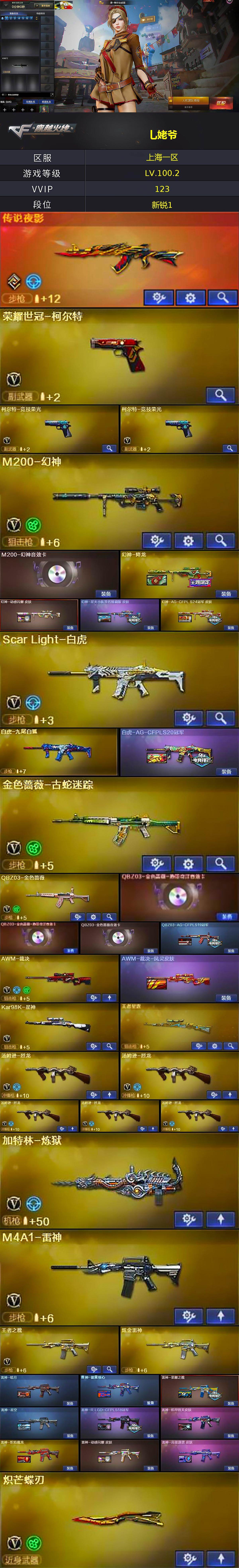 【热门武器】:传说夜影,QBZ03-金色蔷薇,Scar Light-白虎,HK417-朱雀,M4A1-青龙,M200-幻神,金色蔷薇-古蛇迷踪,修罗-古蛇迷踪,死亡之眼,凤吟之魄,荣耀世冠-火麒麟,荣耀世冠-柯尔特,Kar98K-星神,M4A1-黑骑士*2,汤姆逊-烈龙*5,加特林-炼狱,毁灭-孙三炮,COP-白鲨*2,沙鹰-修罗*4,炽芒蝶刃,荣耀世冠-龙啸