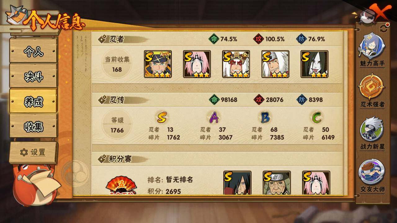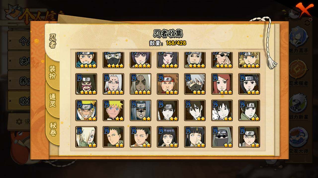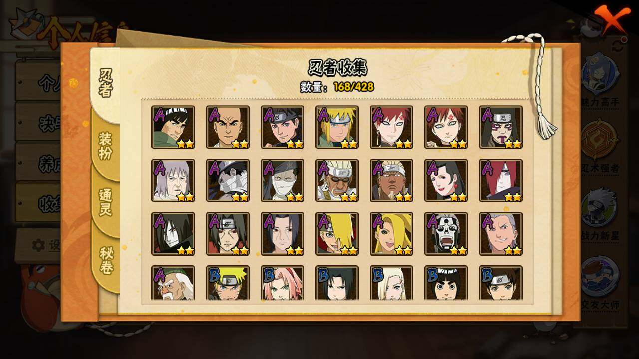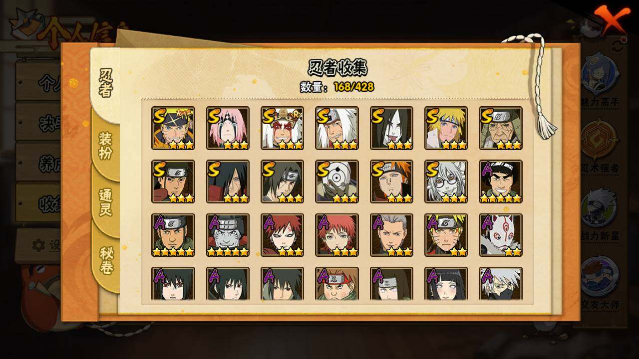 【S级忍者】:猿飞日斩「秽土转生」(3星),宇智波斑「秽土转生」(3星),春野樱「忍界大战」(3星),宇智波鼬「须佐能乎」(3星),自来也「舞之豪杰」(3星),大蛇丸(3星),自来也「传说中的三忍」(3星),千手柱间(3星),波风水门(3星),药师兜「仙人模式」(3星),佩恩「天道」(3星),宇智波斑