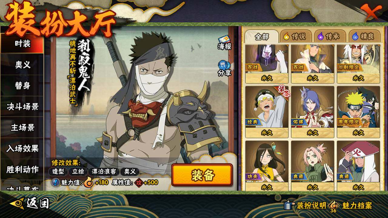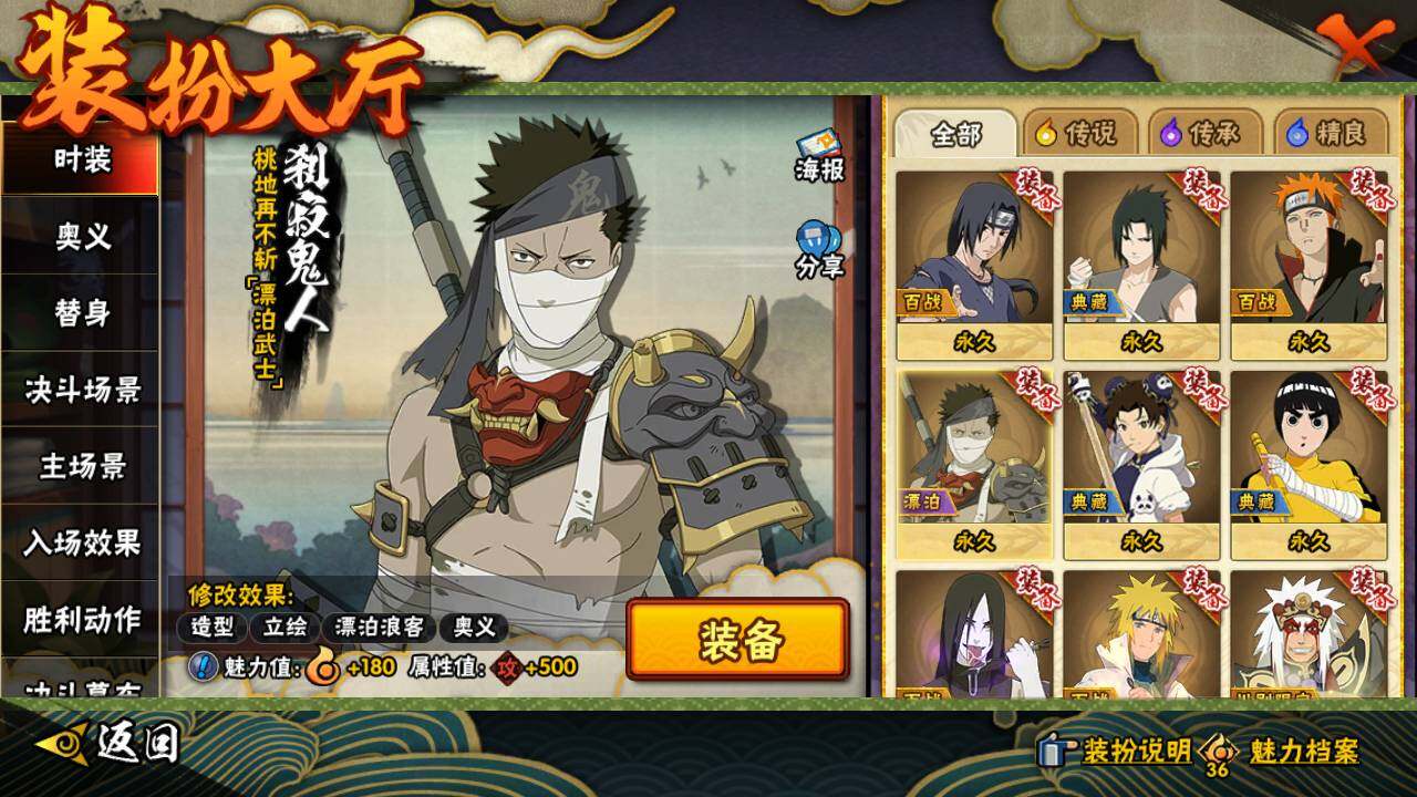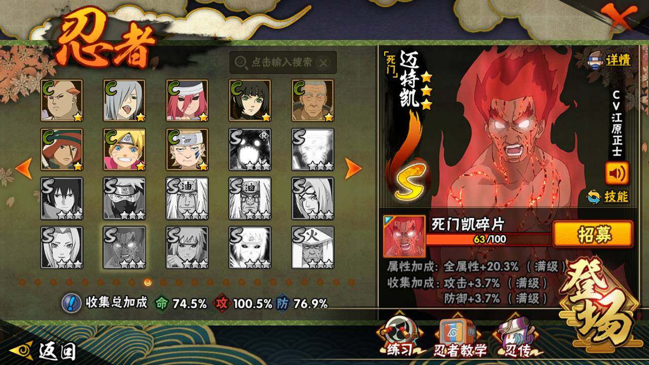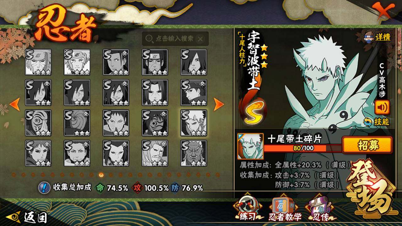 【S级忍者】:猿飞日斩「秽土转生」(3星),宇智波斑「秽土转生」(3星),春野樱「忍界大战」(3星),宇智波鼬「须佐能乎」(3星),自来也「舞之豪杰」(3星),大蛇丸(3星),自来也「传说中的三忍」(3星),千手柱间(3星),波风水门(3星),药师兜「仙人模式」(3星),佩恩「天道」(3星),宇智波斑